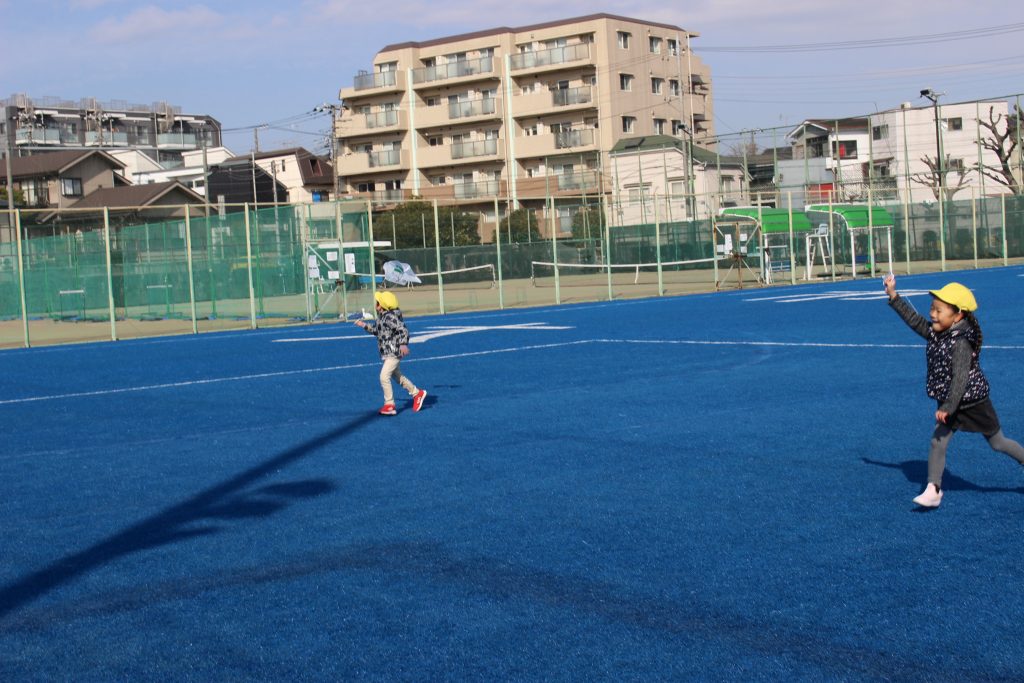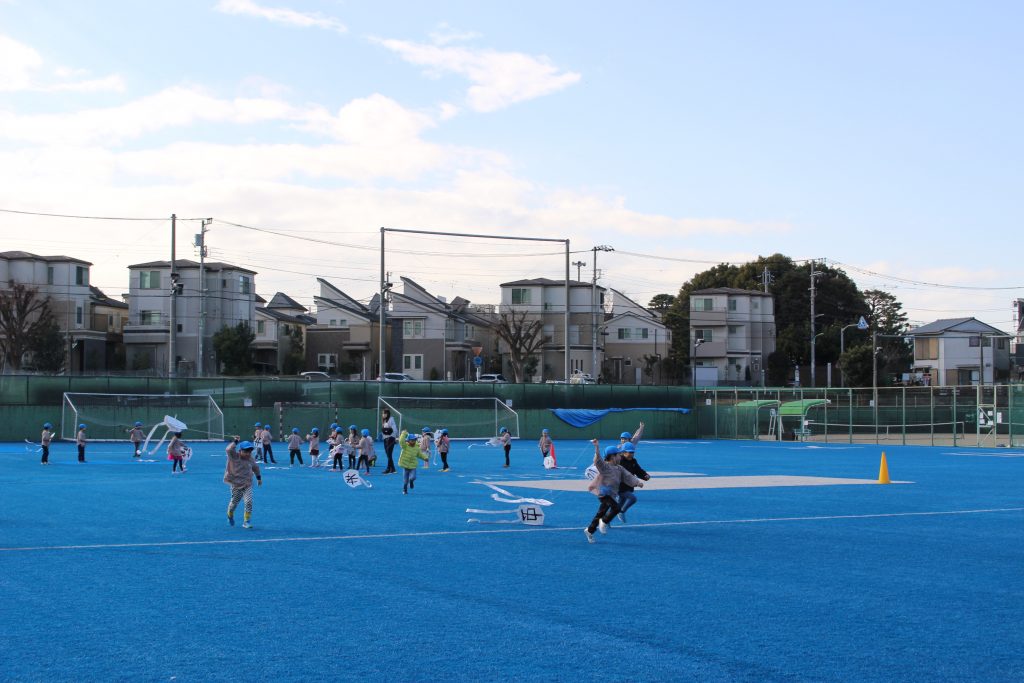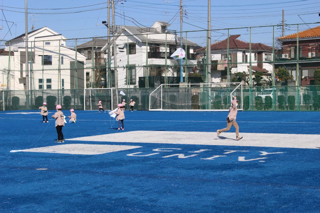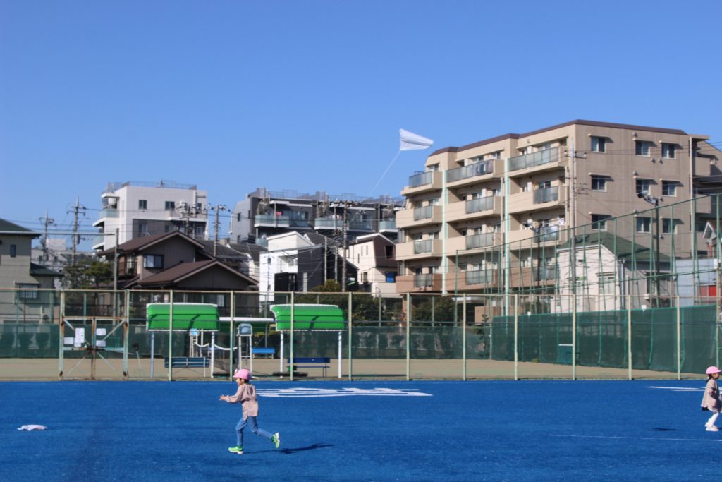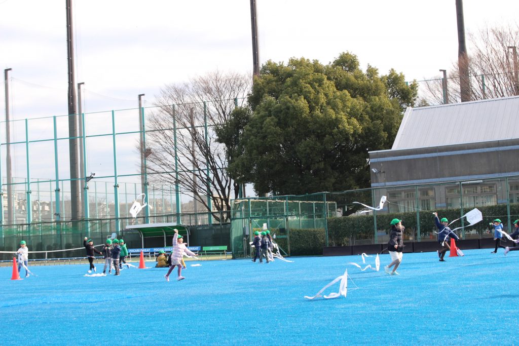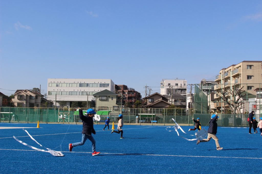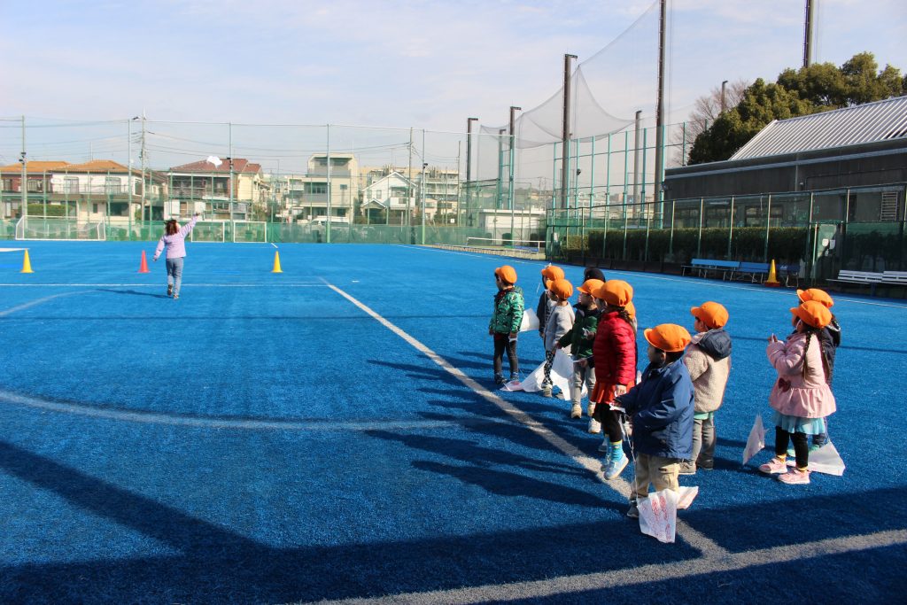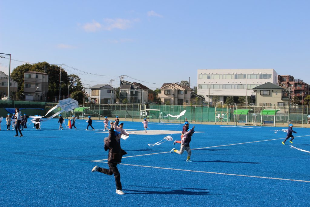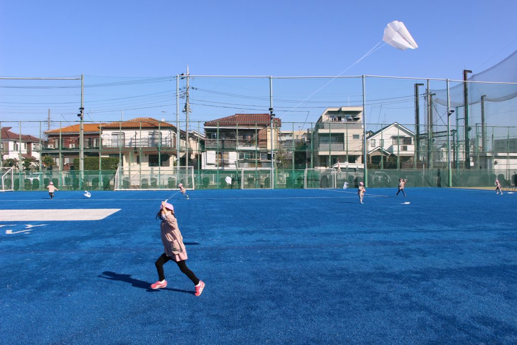 正月あそびの一つである『凧あげ』。本園では、年少・年中組は絵凧、年長組は字凧を描き(書き)、仕上げました。出来上がった後は、学年別に日程を分散して東京都市大学総合グラウンドにお邪魔させていただき、凧あげを行いました。