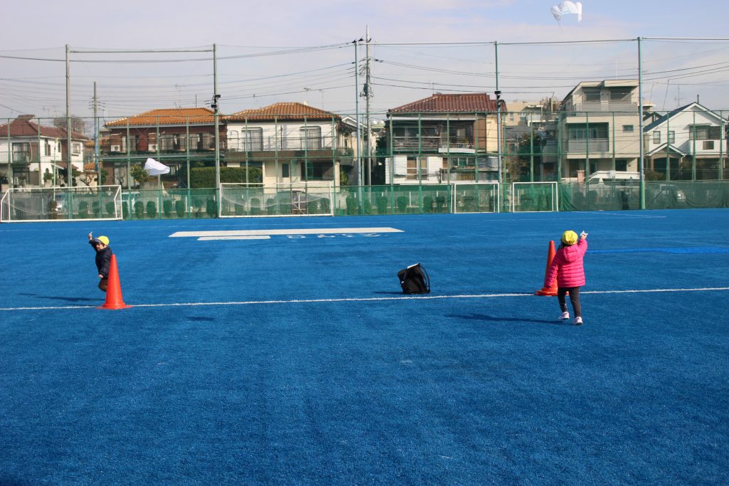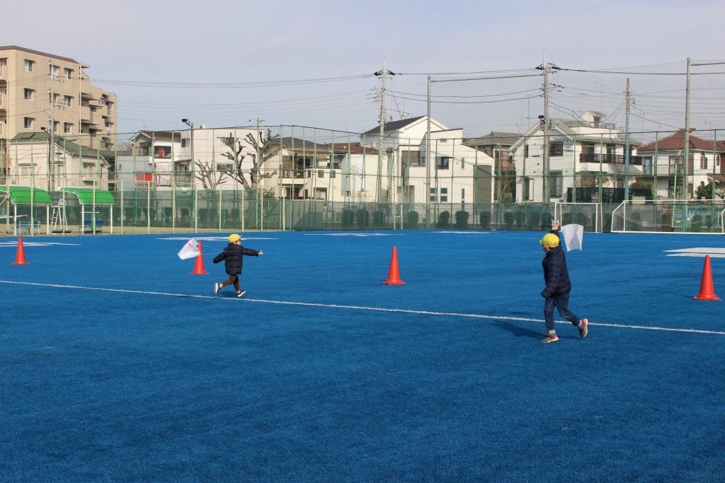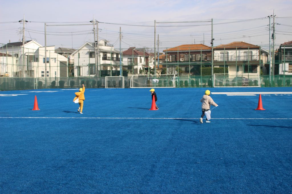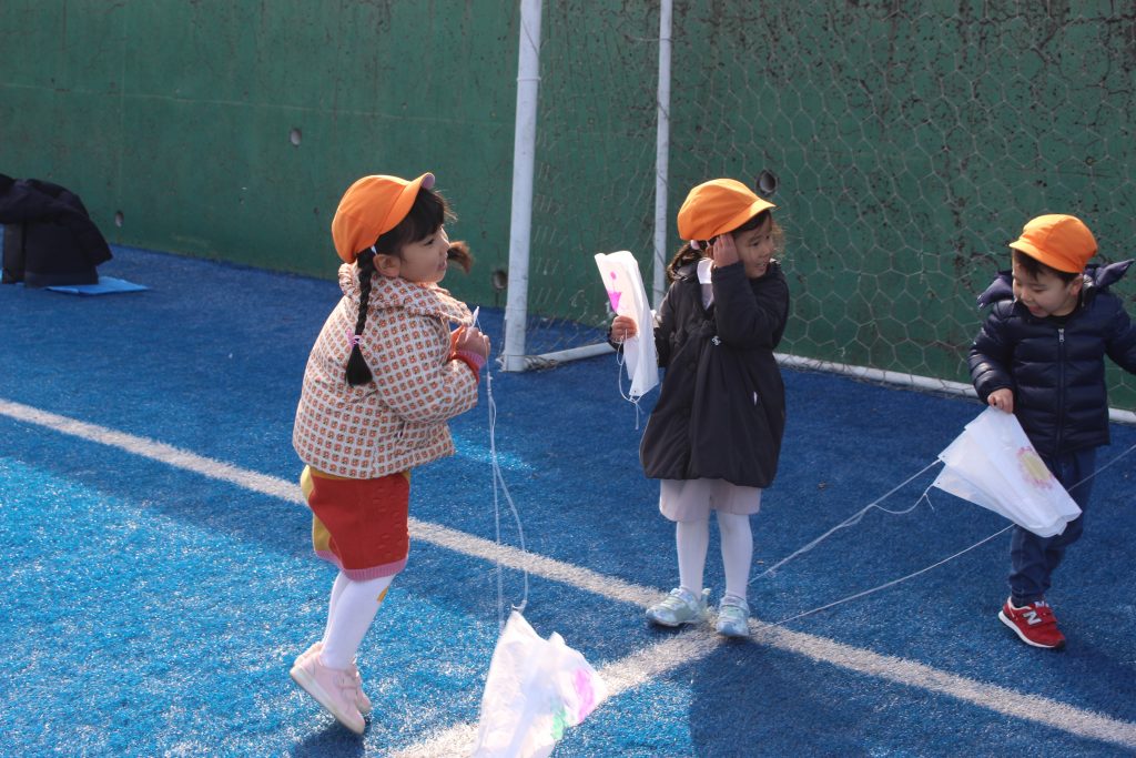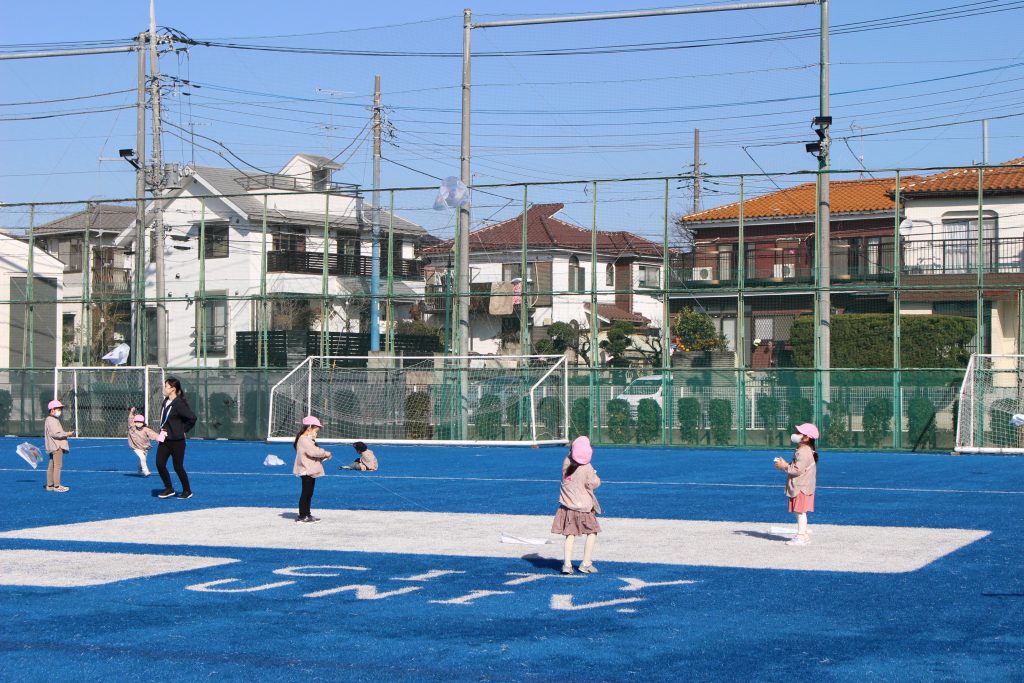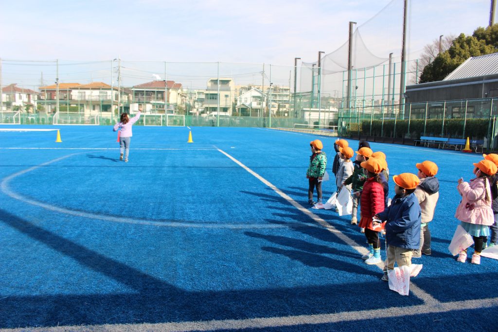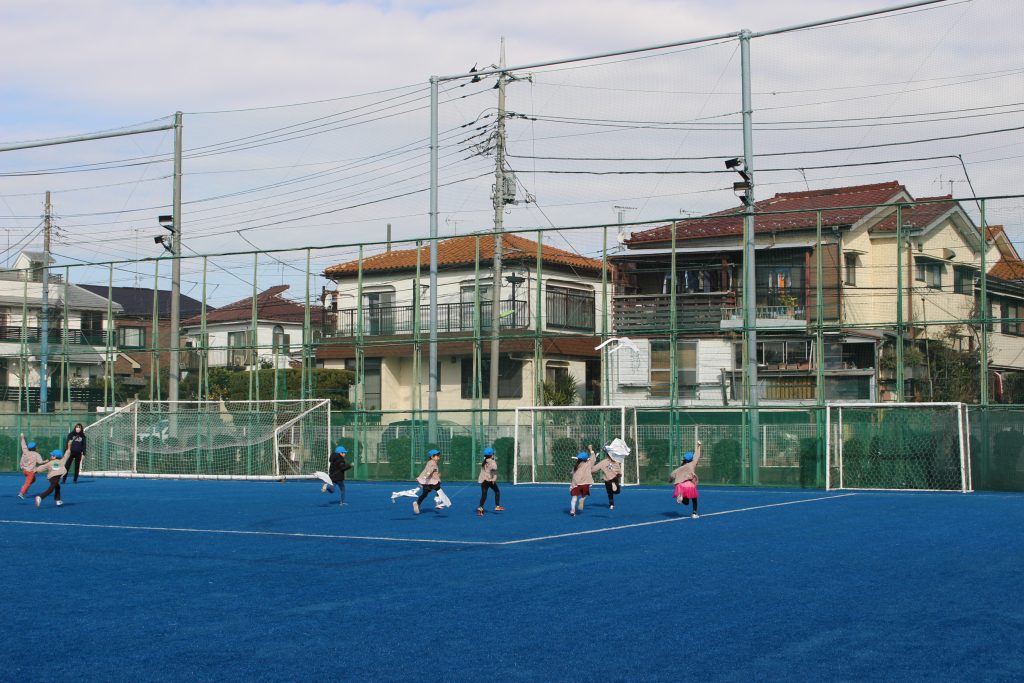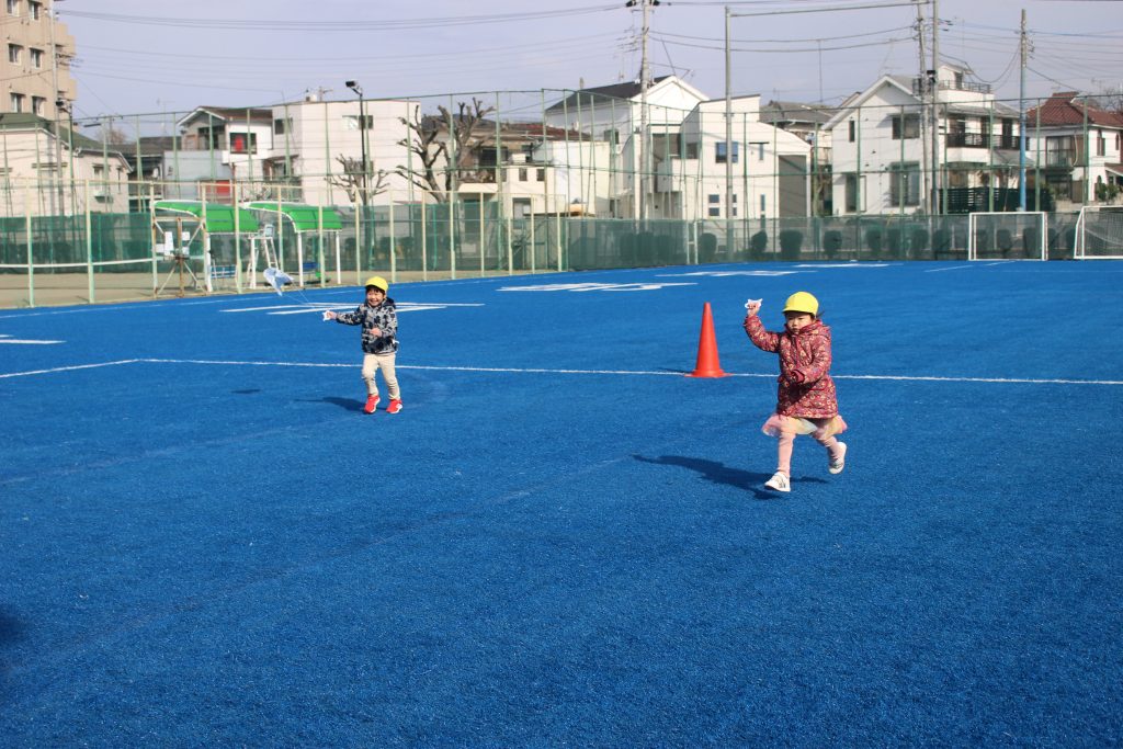 正月あそびの一つである『凧あげ』。本園では、年少・年中組は絵凧、年長組は字凧を描き(書き)、仕上げました。出来上がった後は、学年別に日程を分散して東京都市大学総合グラウンドにお邪魔させていただき、凧あげを行いました。