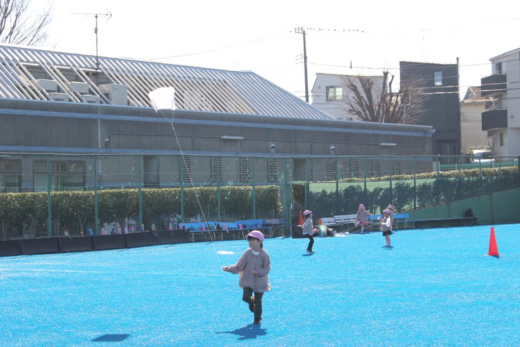 次に行ったのは年中組。天候に恵まれ、風がない中でもそれぞれ上手にあげていました。時折、風が出てくるとうまく風向きをつかみ、高くあげる様子も見られました。