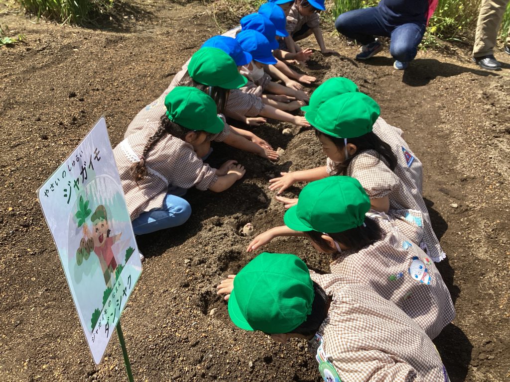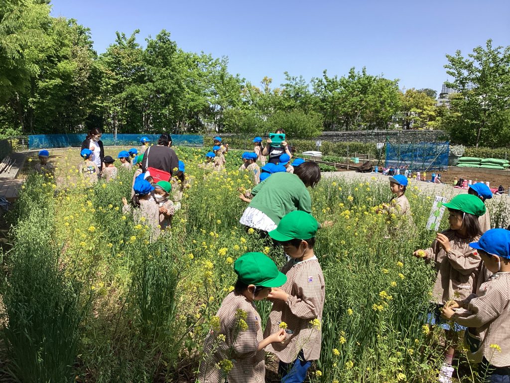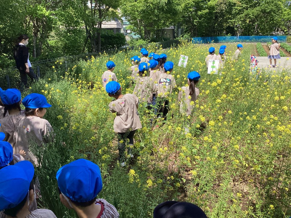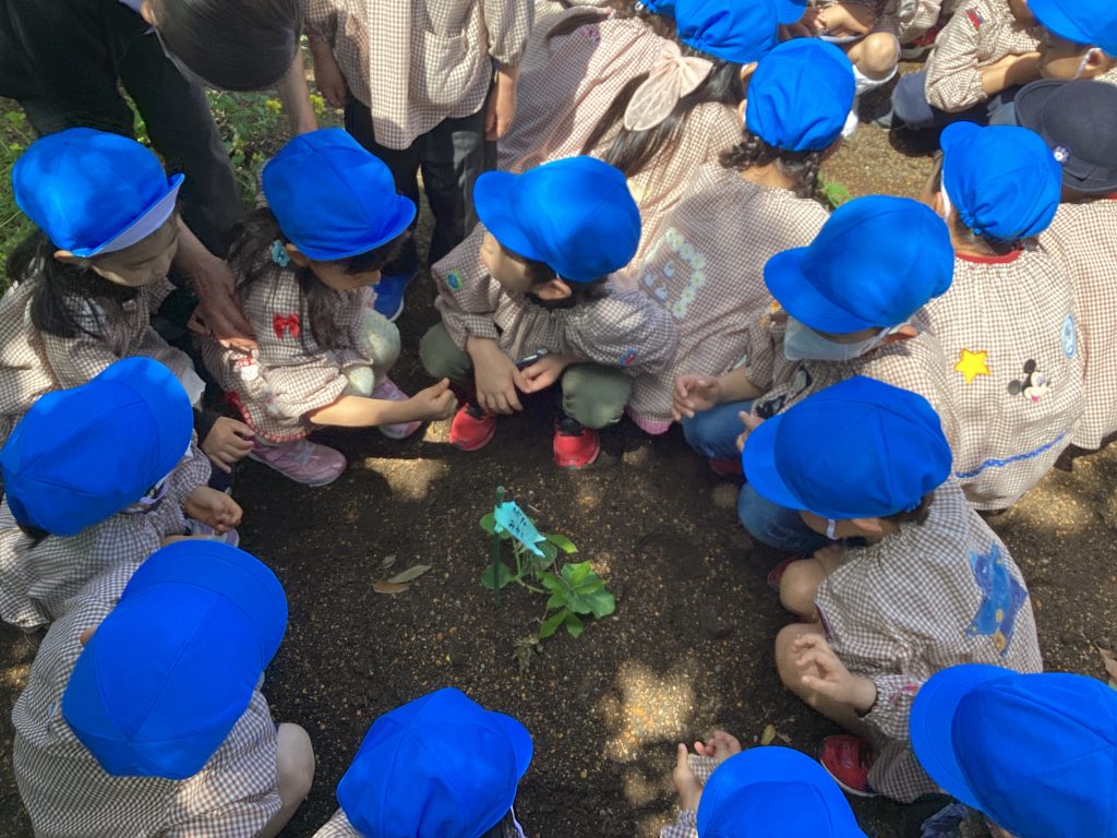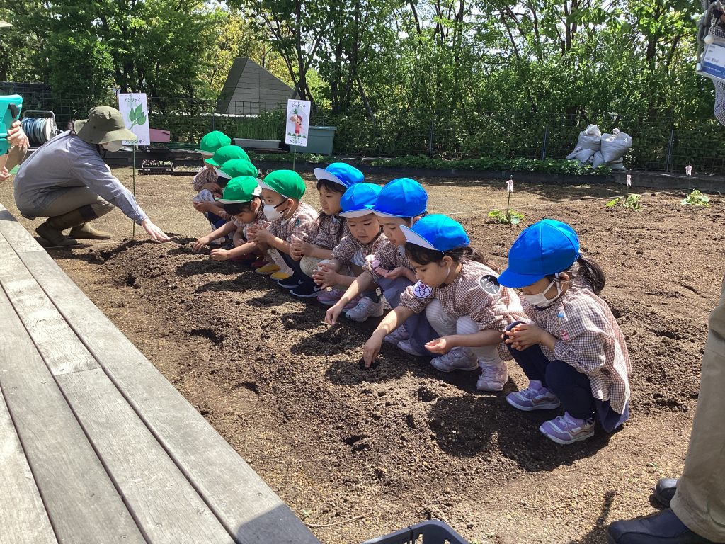 毎年年長組は、年間を通して二子玉川ライズにある屋上菜園で野菜等の栽培や観察、収穫をさせていただいています。今日は早速、幼稚園から歩いて15分くらいをかけて菜園まで出かけてきました。今月は、クウシンサイの種植え・ジャガイモの種芋植えです。