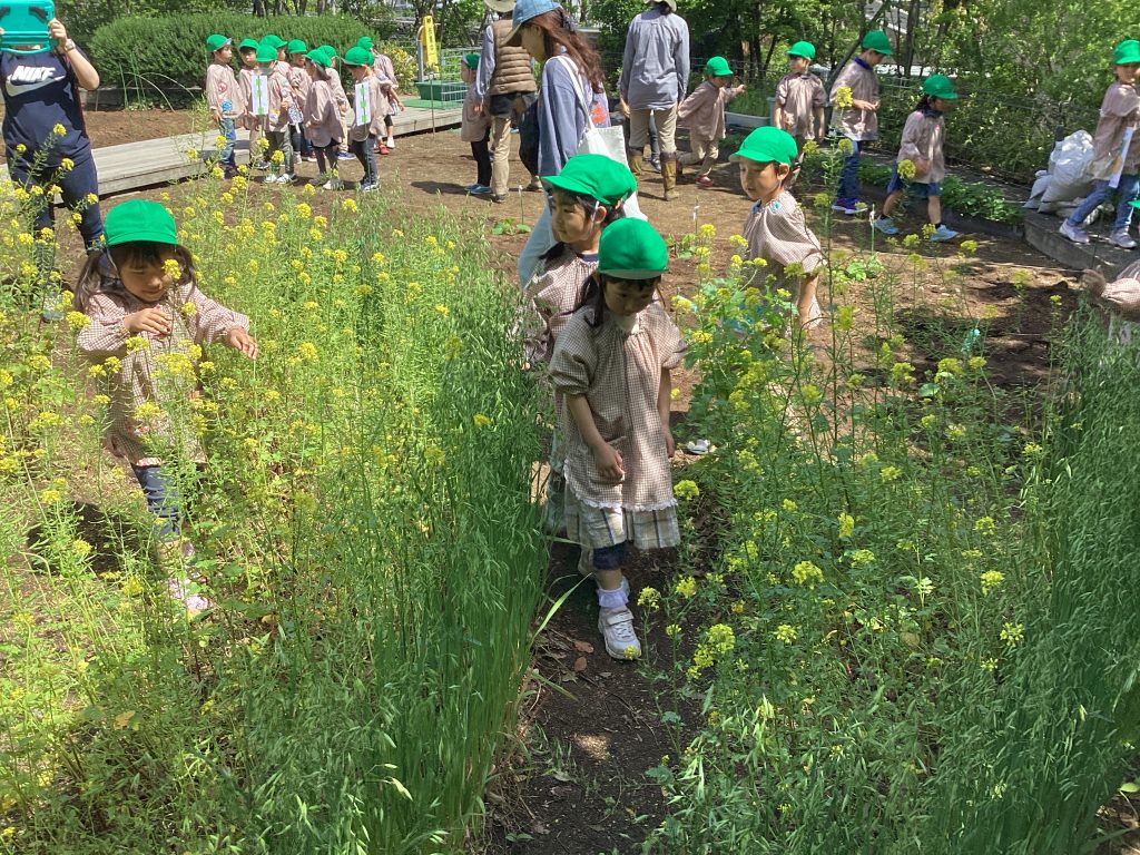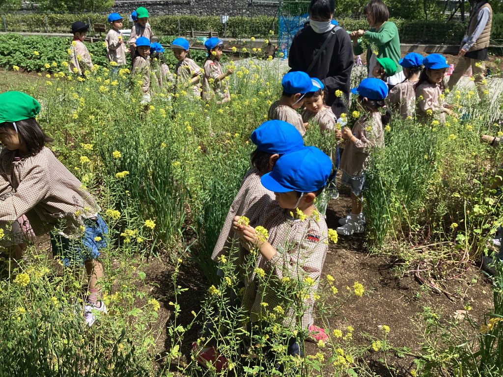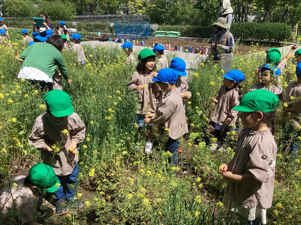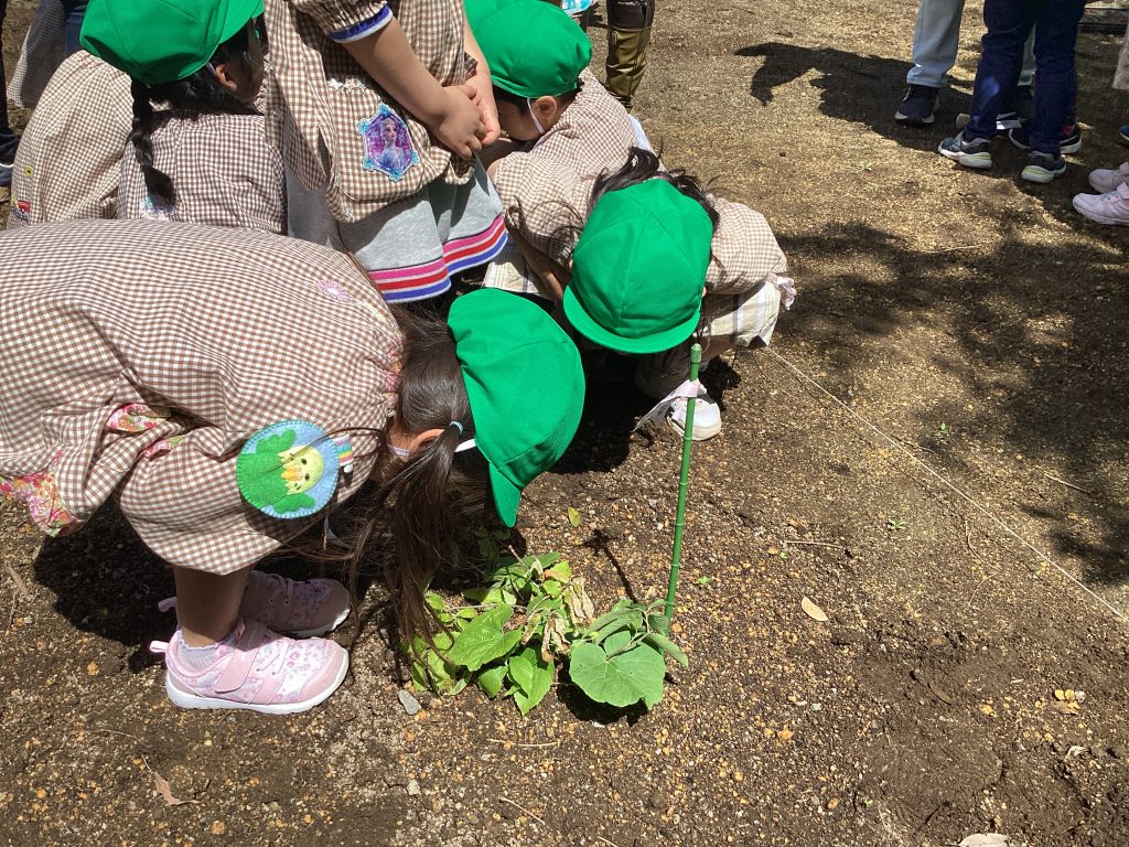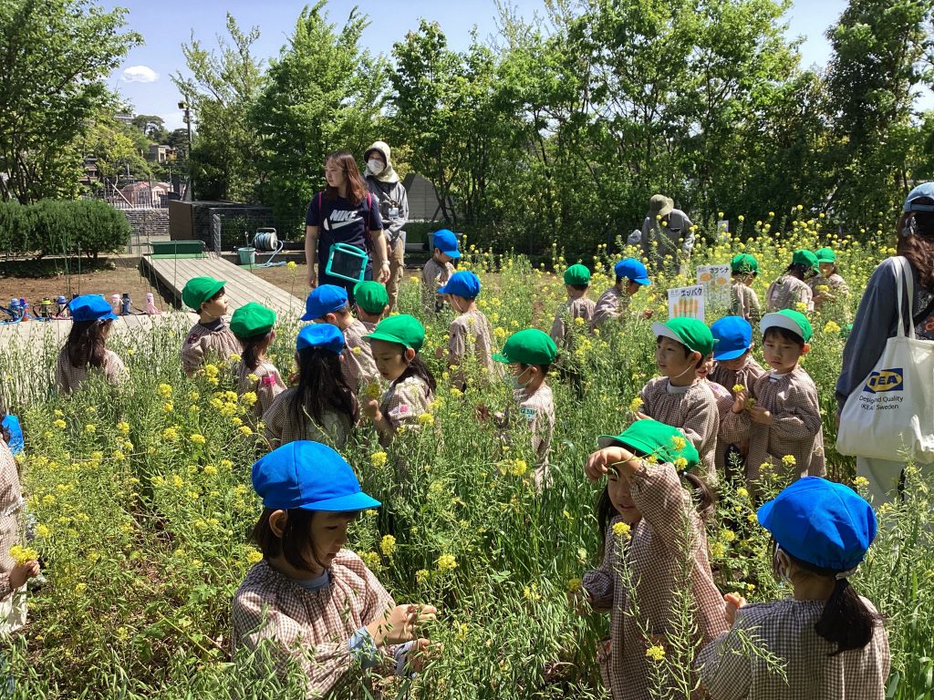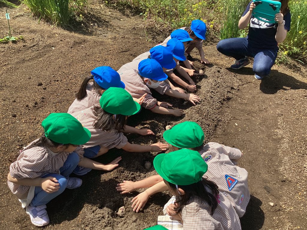 毎年年長組は、年間を通して二子玉川ライズにある屋上菜園で野菜等の栽培や観察、収穫をさせていただいています。今日は早速、幼稚園から歩いて15分くらいをかけて菜園まで出かけてきました。今月は、クウシンサイの種植え・ジャガイモの種芋植えです。