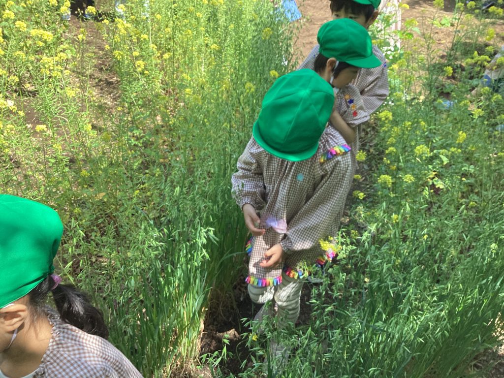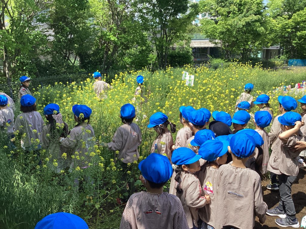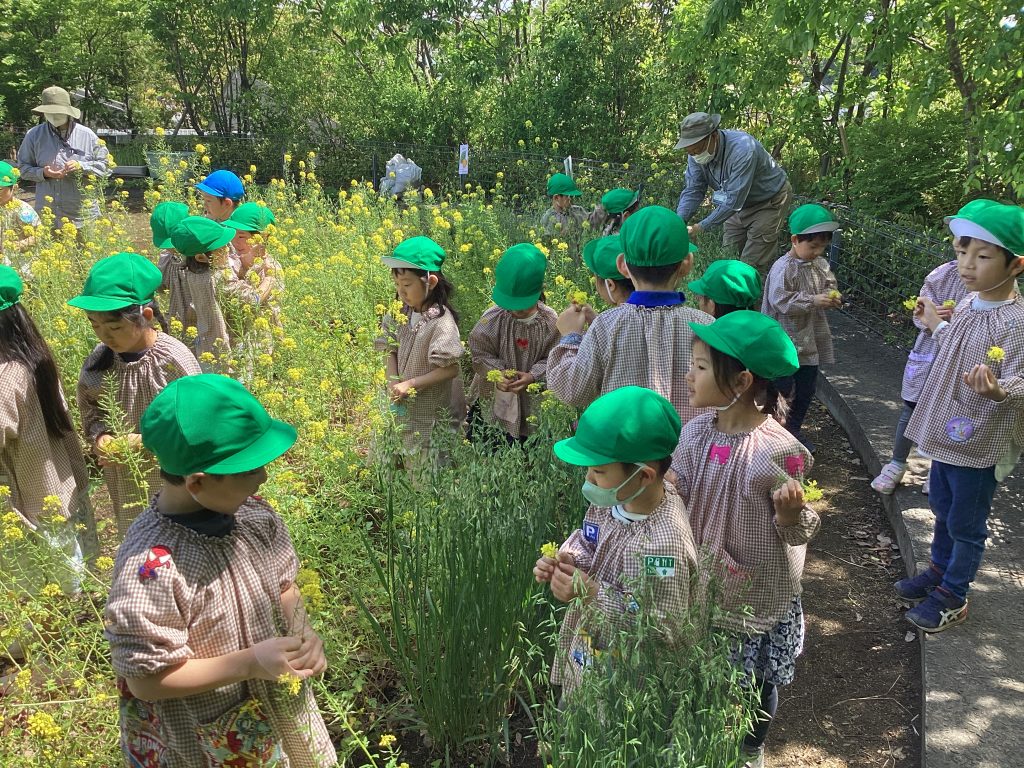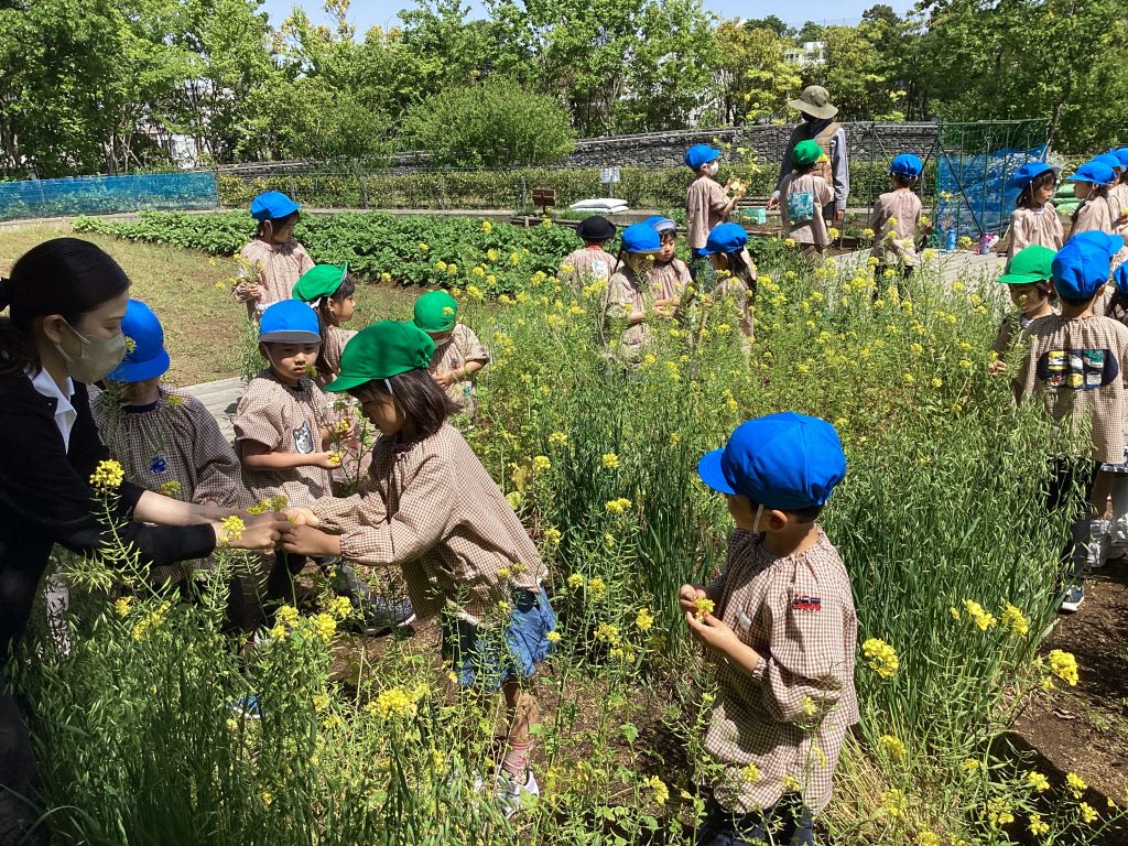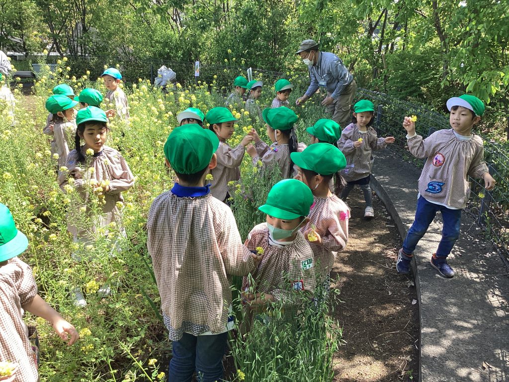 毎年年長組は、年間を通して二子玉川ライズにある屋上菜園で野菜等の栽培や観察、収穫をさせていただいています。今日は早速、幼稚園から歩いて15分くらいをかけて菜園まで出かけてきました。今月は、クウシンサイの種植え・ジャガイモの種芋植えです。