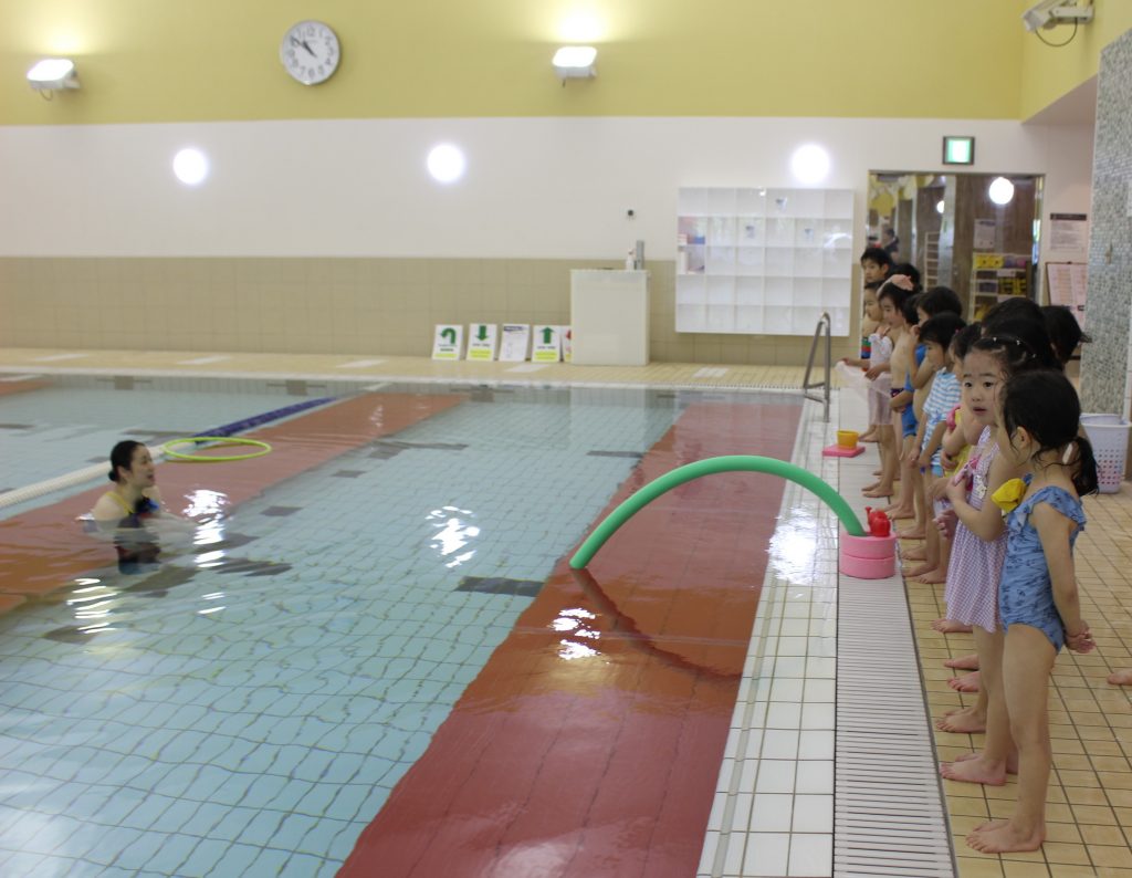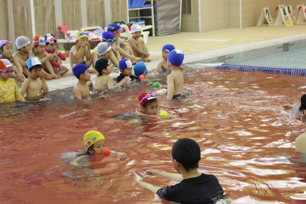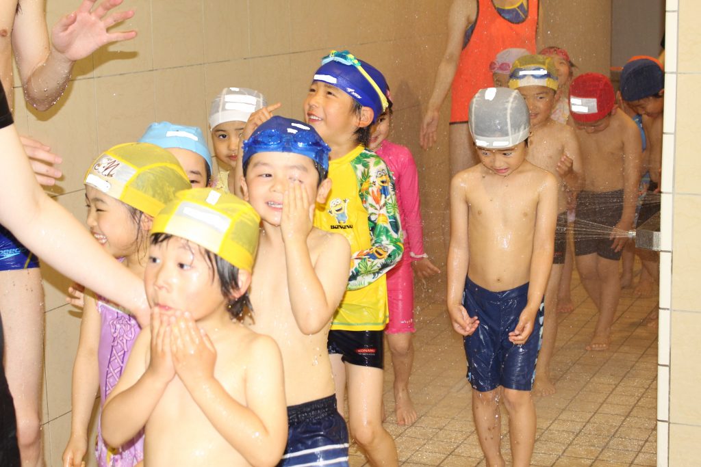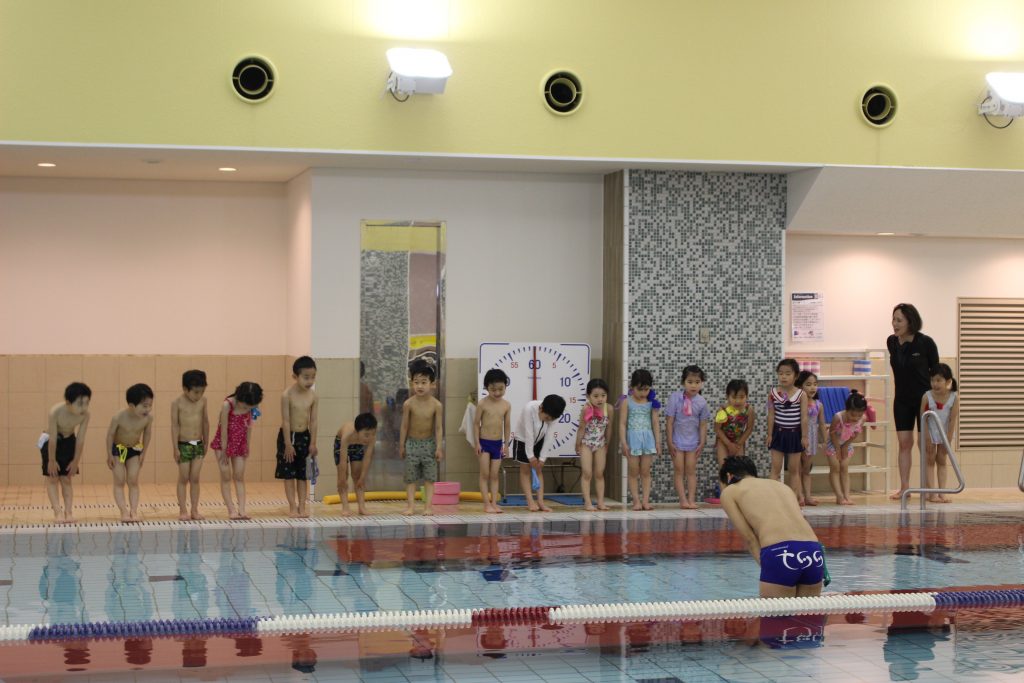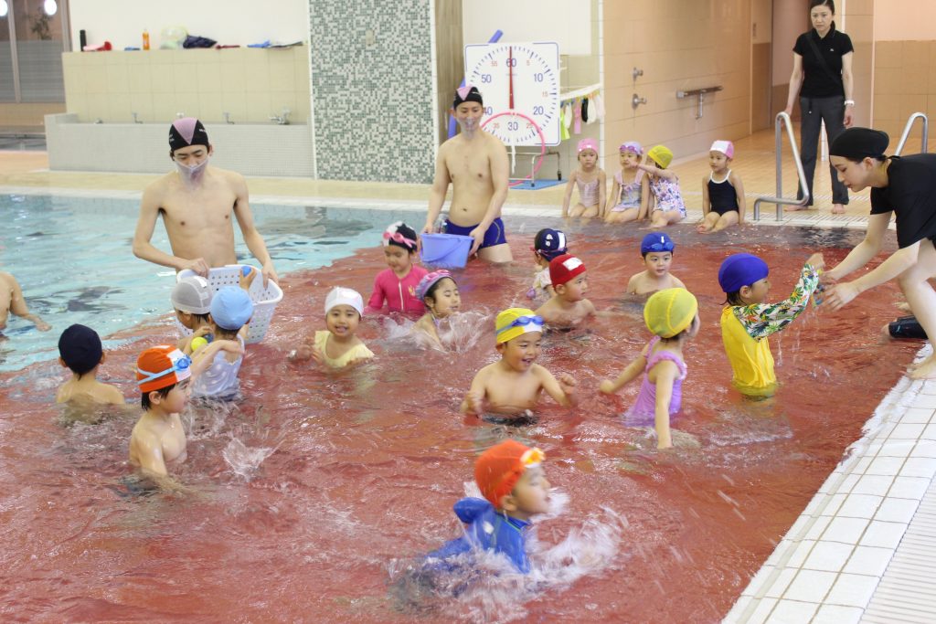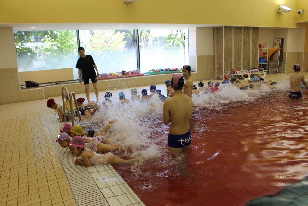 二子玉川ライズにあるアトリオドゥーエのプールをお借りして、今年度も年長組の水泳指導が始まりました。水泳指導の目的は、『水慣れを中心に楽しく、水中での活動に親しみながら小学校就学前に泳法習得に必要な基礎作りを目指す』です。