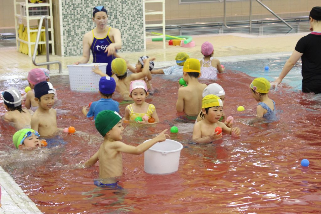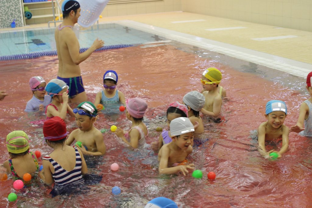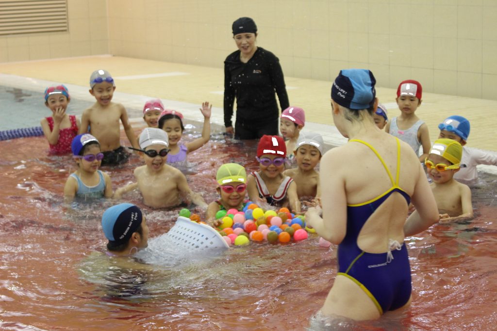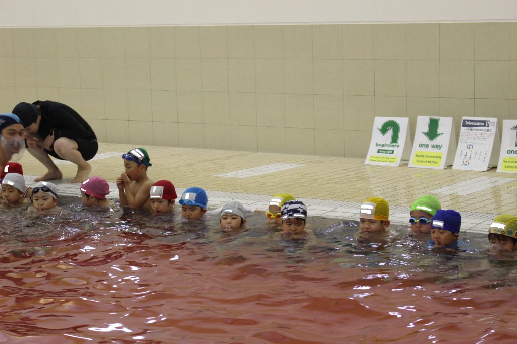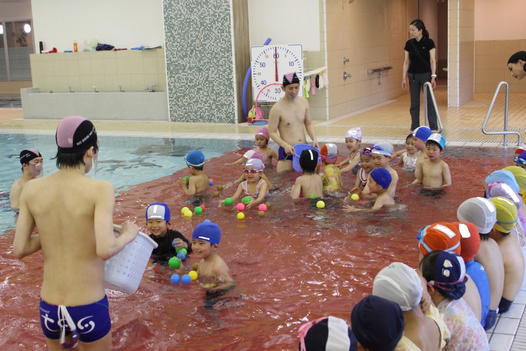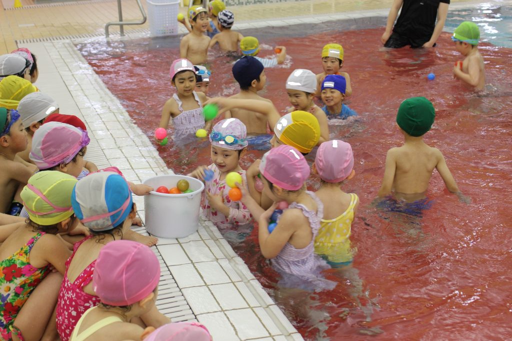 二子玉川ライズにあるアトリオドゥーエのプールをお借りして、今年度も年長組の水泳指導が始まりました。水泳指導の目的は、『水慣れを中心に楽しく、水中での活動に親しみながら小学校就学前に泳法習得に必要な基礎作りを目指す』です。