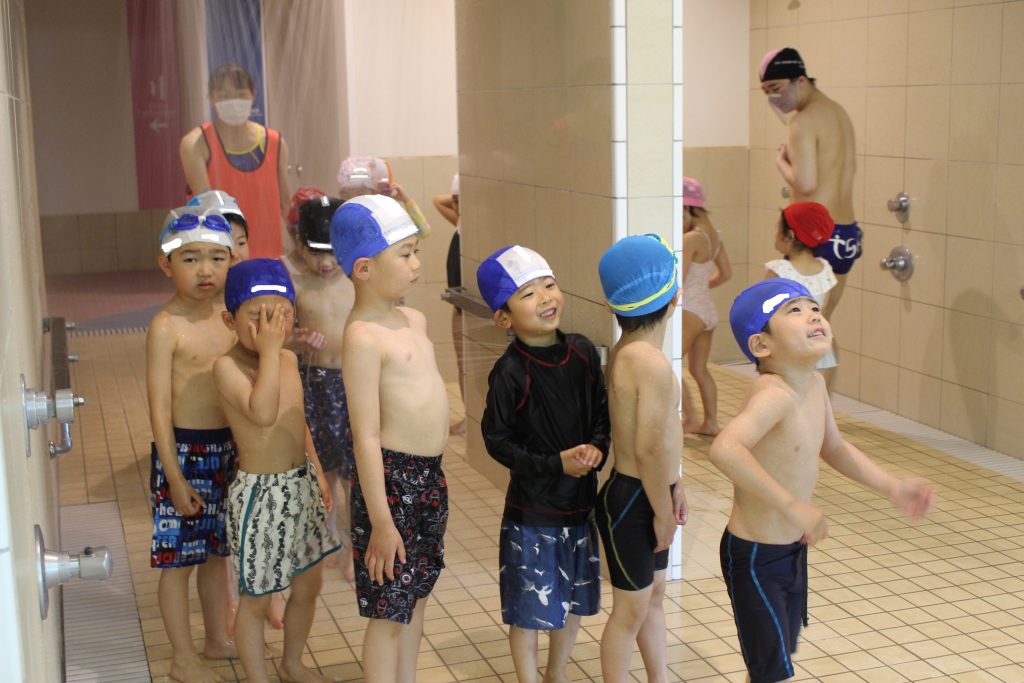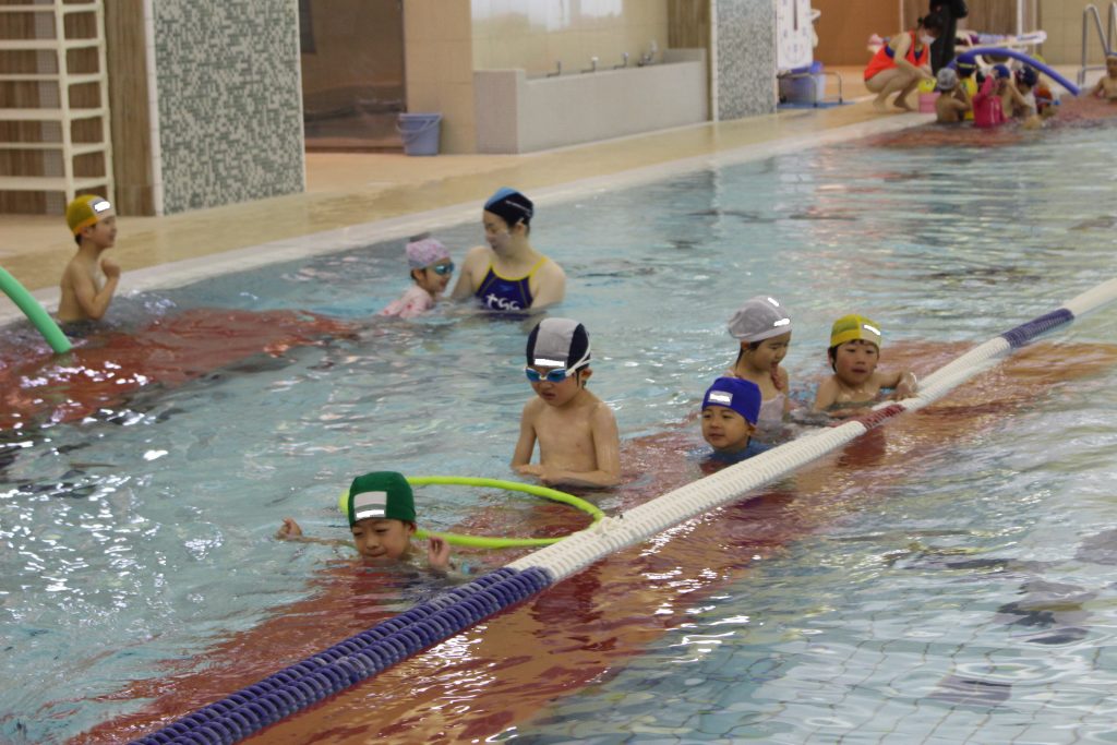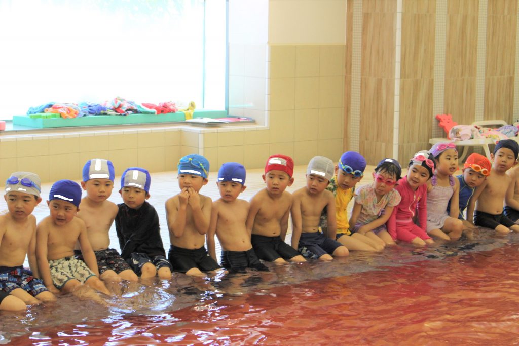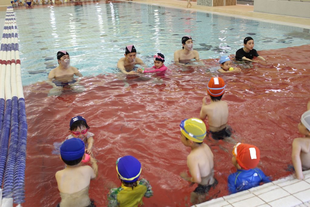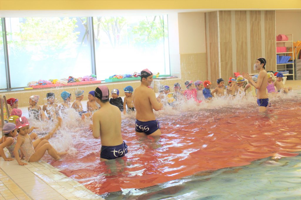 この日の活動テーマは、『プールや水の中の環境に慣れよう!』。初めてプールに入る子もいましたが、およそ1時間の活動中、楽しそうに参加する様子が印象的でした。これから少しずつ活動内容が変化していきますが、潜ったり、ジャンプをしたり、けのびをしたりなど、水の中ならでは感覚や動き、楽しさを味わえるように援助していきます。