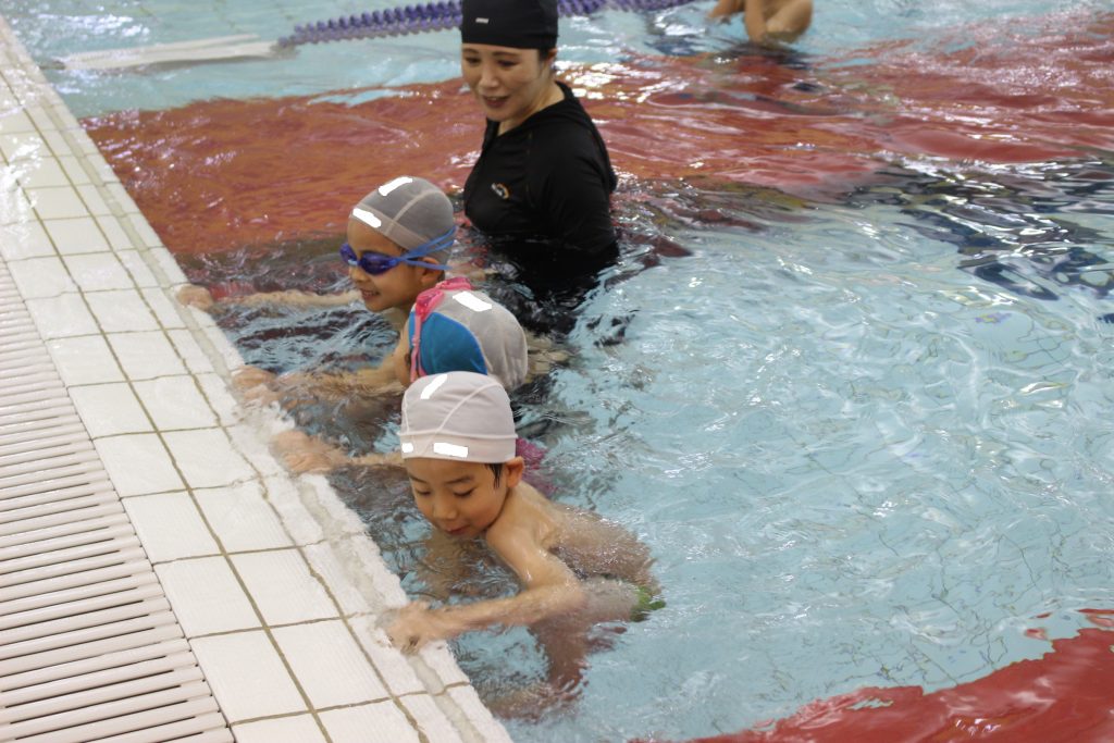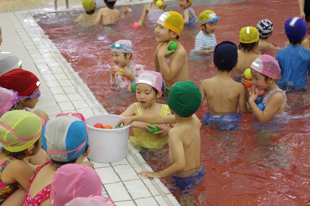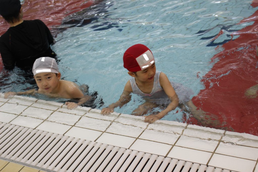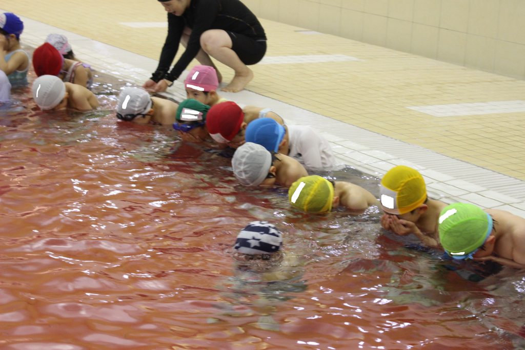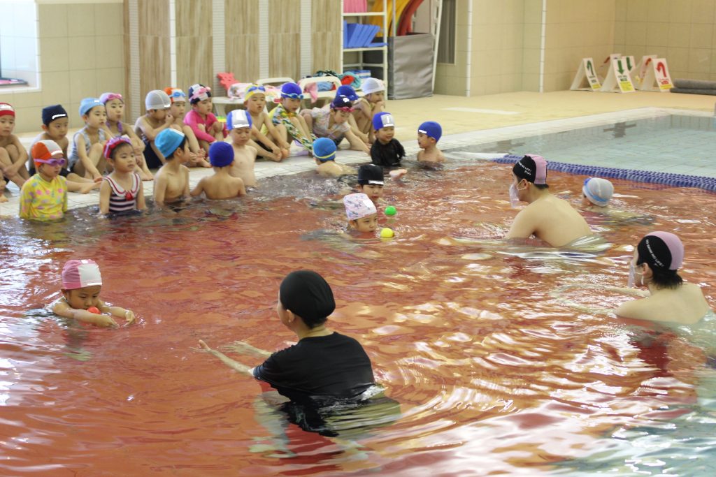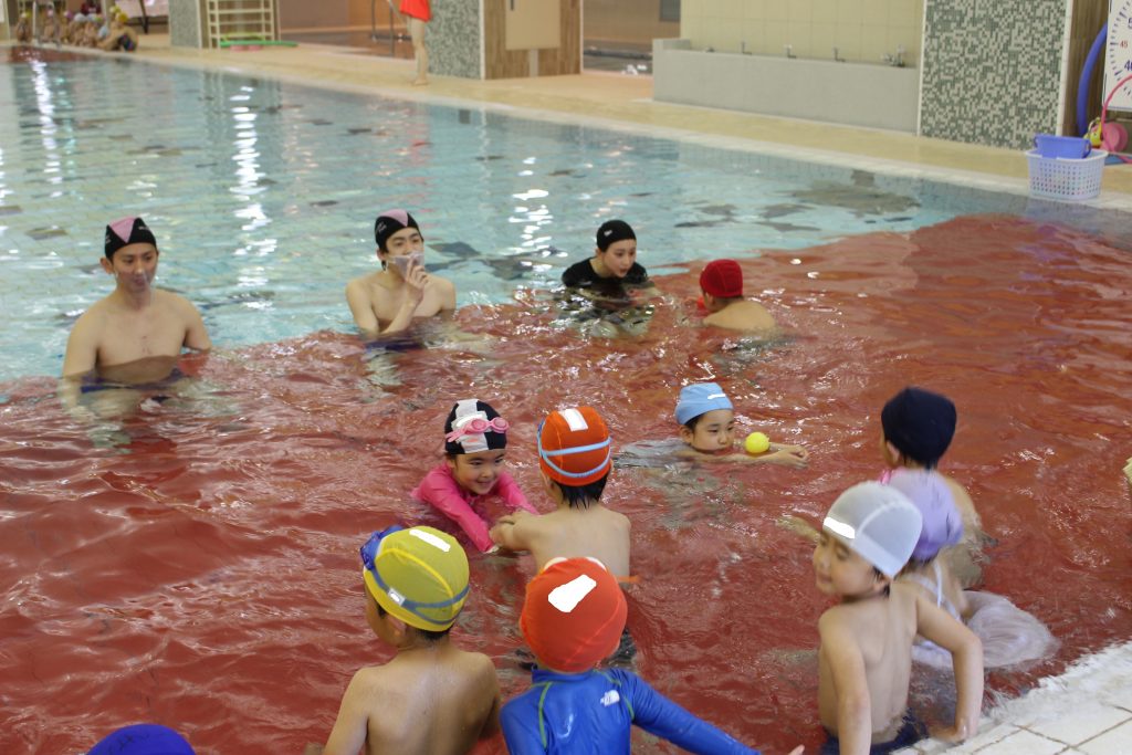 この日の活動テーマは、『プールや水の中の環境に慣れよう!』。初めてプールに入る子もいましたが、およそ1時間の活動中、楽しそうに参加する様子が印象的でした。これから少しずつ活動内容が変化していきますが、潜ったり、ジャンプをしたり、けのびをしたりなど、水の中ならでは感覚や動き、楽しさを味わえるように援助していきます。