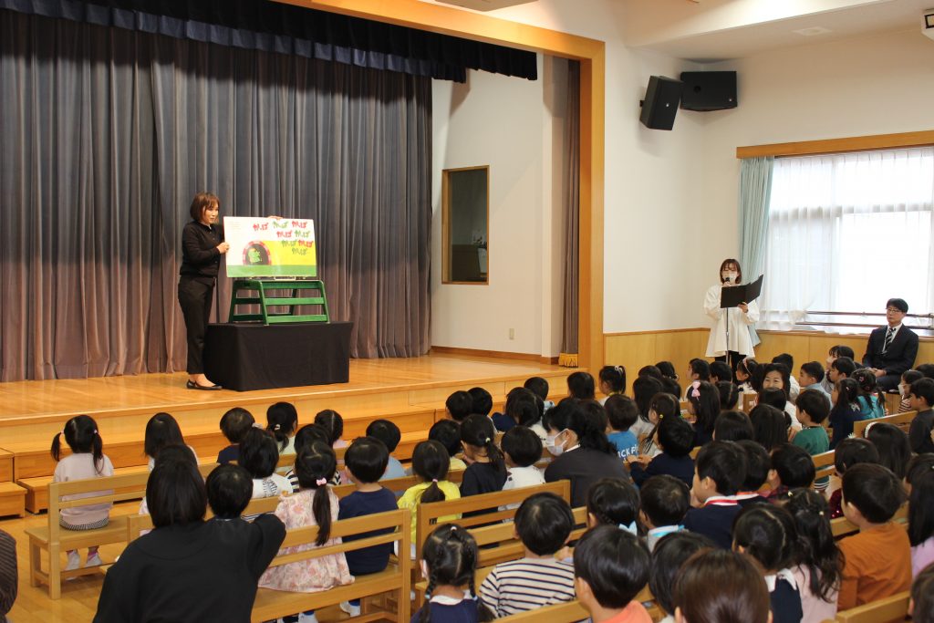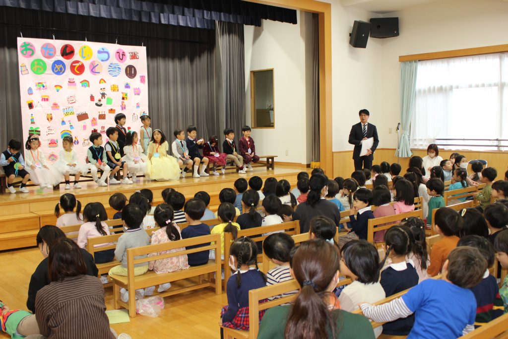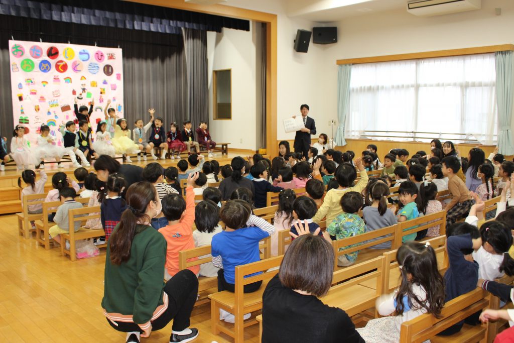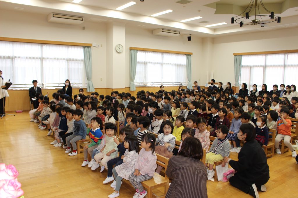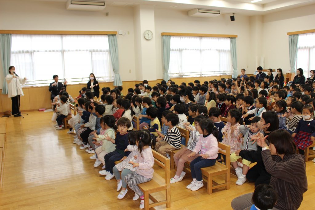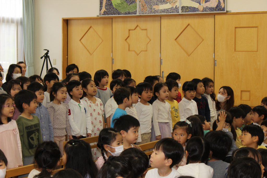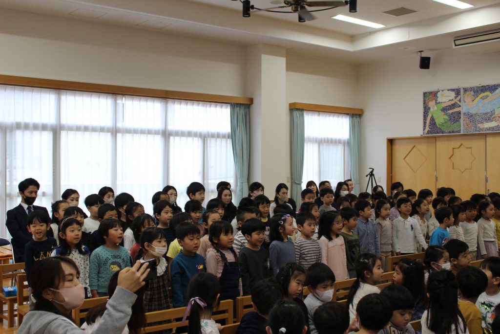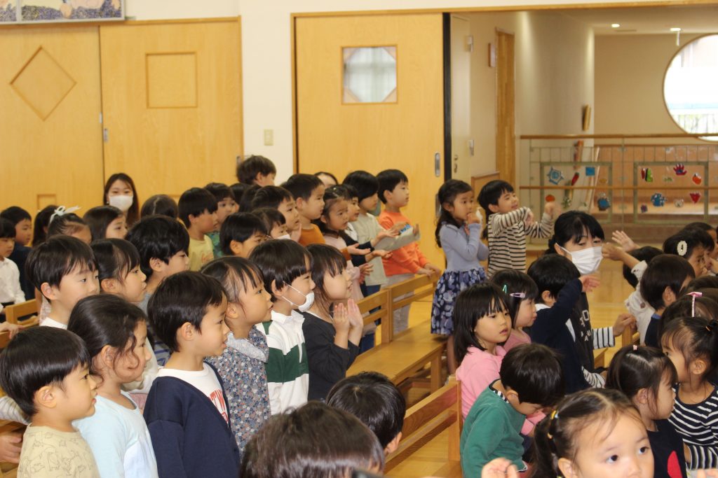 3学年一緒に誕生会をするのは、久しぶりでした。流れや内容もコロナ前と同じように進め、その中で歌う時間があり、何とも言えない感慨深い気持ちになりました。年少組は『チューリップ』、年中組は『ポンポンポンと春がきた』、年長組は『春がきたんだ』とどれも春にちなんだタイトルや歌詞。やはり子どもの歌う姿は、可愛らしく心が温かくなります。