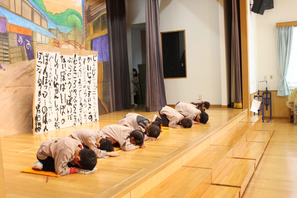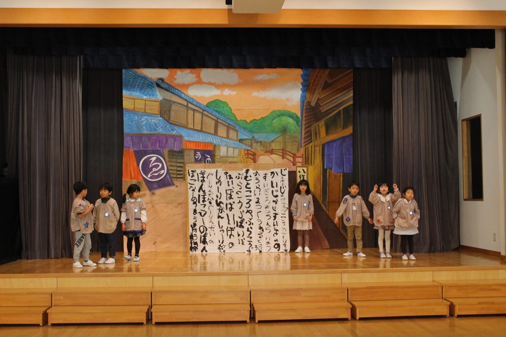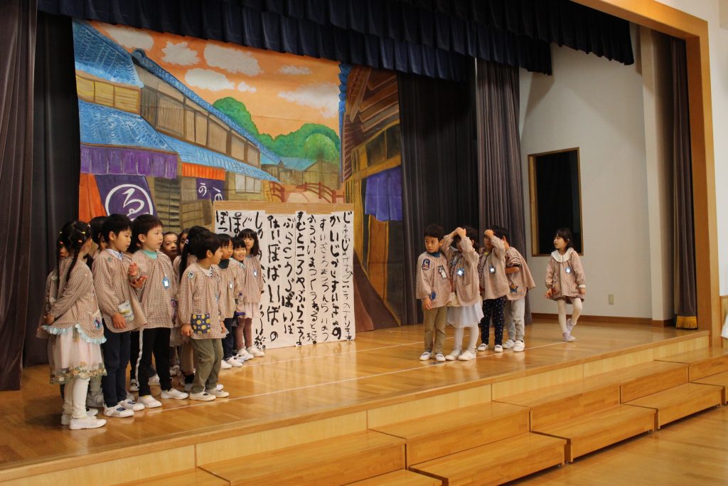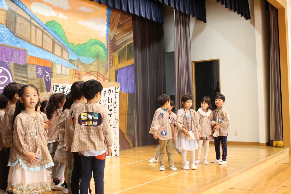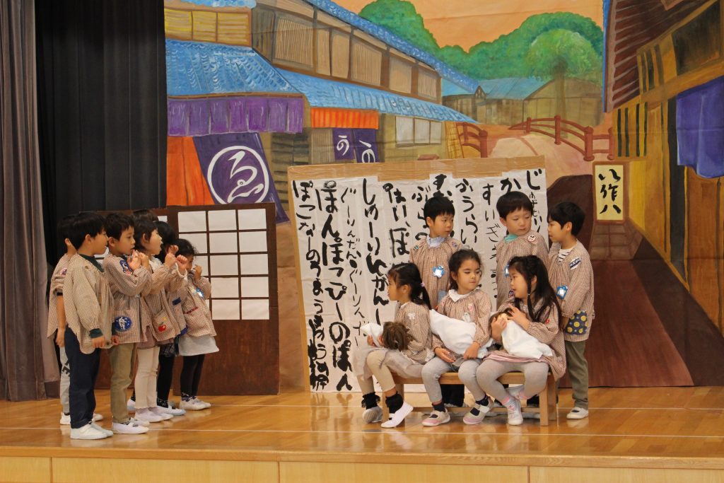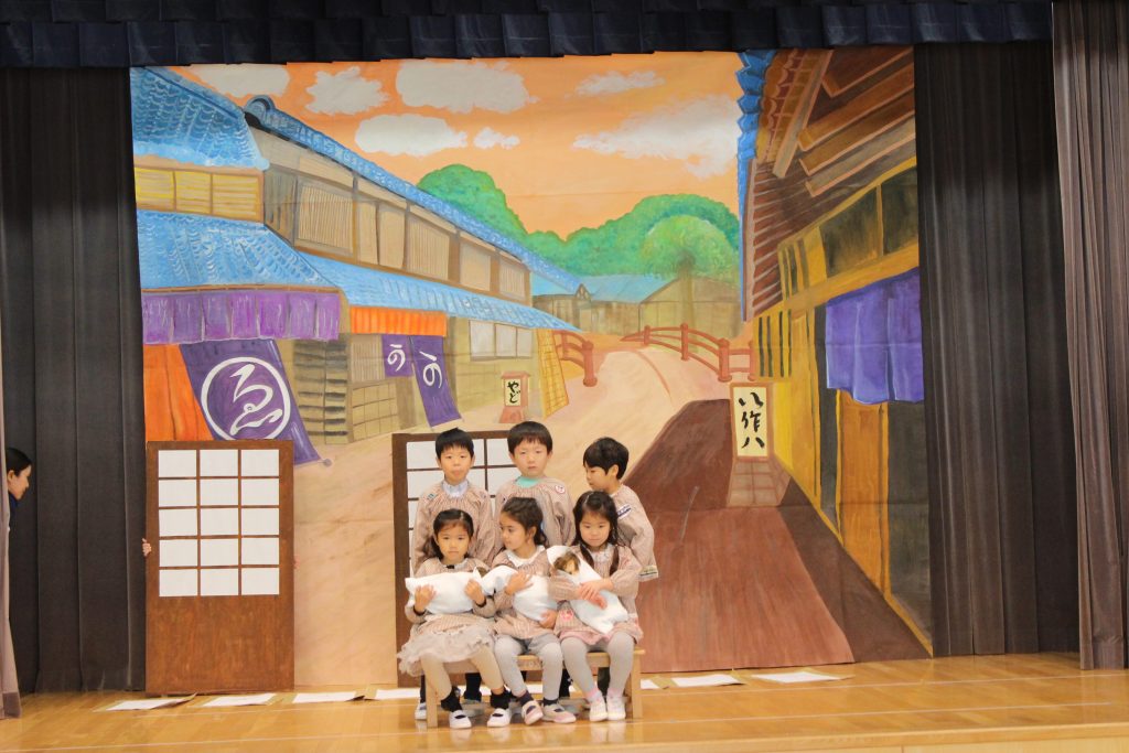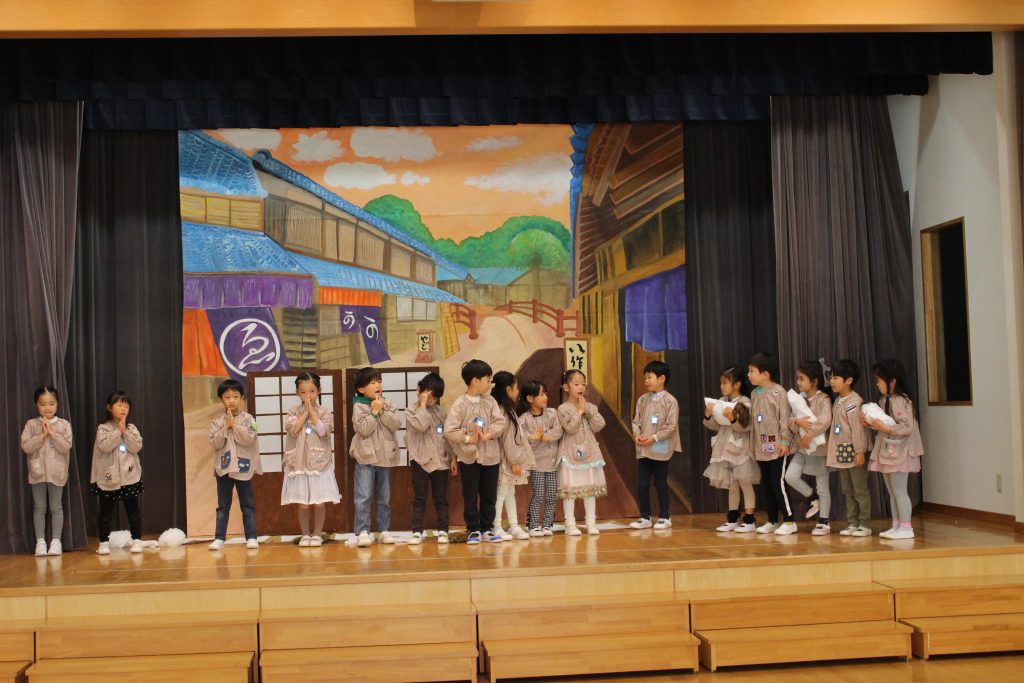 このような子ども達の育ちが見られてきたタイミングで、本園の三大行事の一つである『子どもの発表会』に向けた活動がはじまることになりました。年少組は遊戯、年中組は舞踊劇、年長組は言語劇を発表します。約一ヶ月半をかけて題材や役決め、表現活動に取り組みました。いよいよ当日を迎えますが、この日の年長組の活動を一部お伝えします。