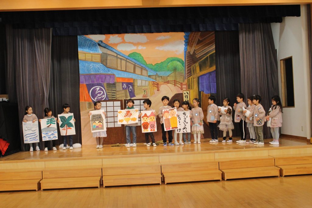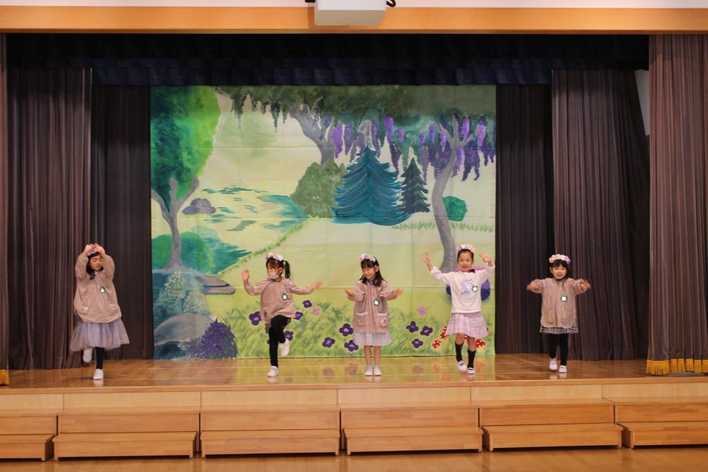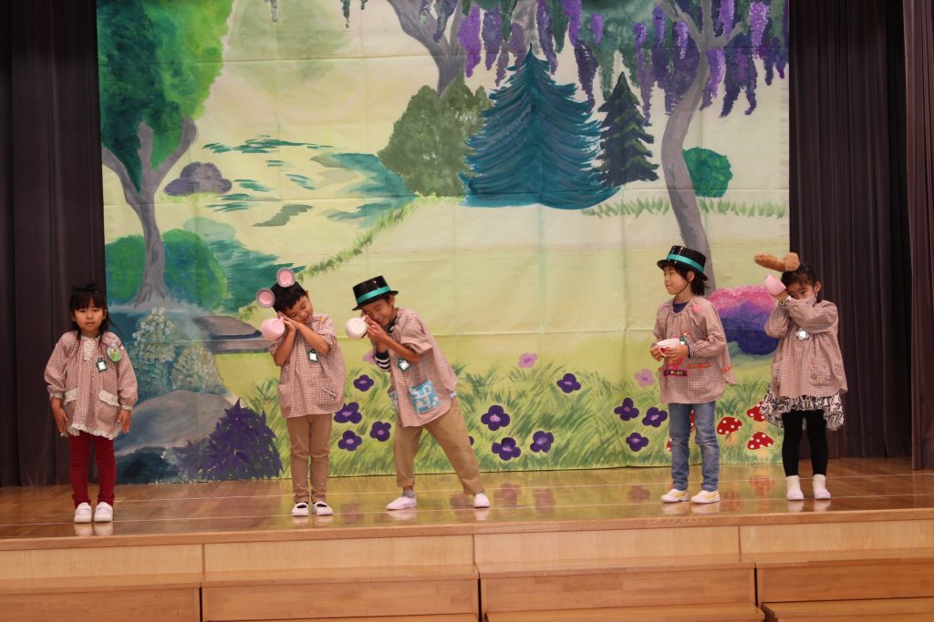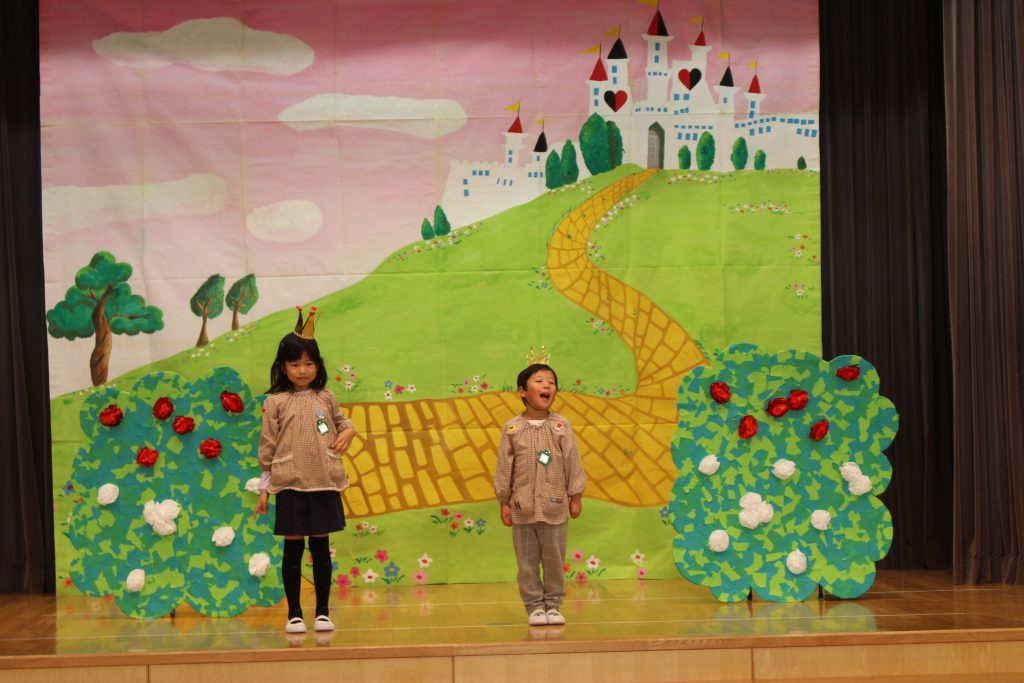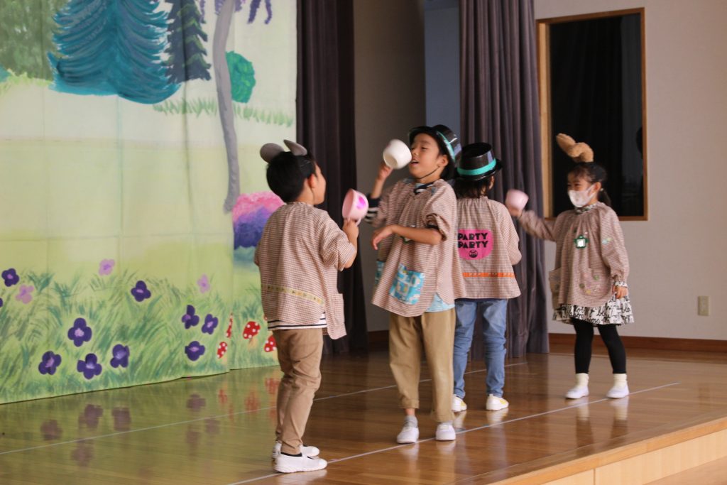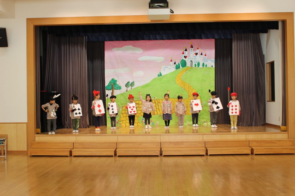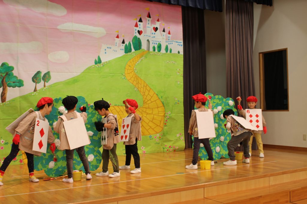 年長組は、『みんなで一つの劇を作ることに意欲をもち、自発的に参加する』『役になって表現することを楽しみ、自信をもって発表する』という2つのねらいに沿って活動を進めてきました。今年の題材は、『ふしぎの国のアリス』と『寿限無』です。