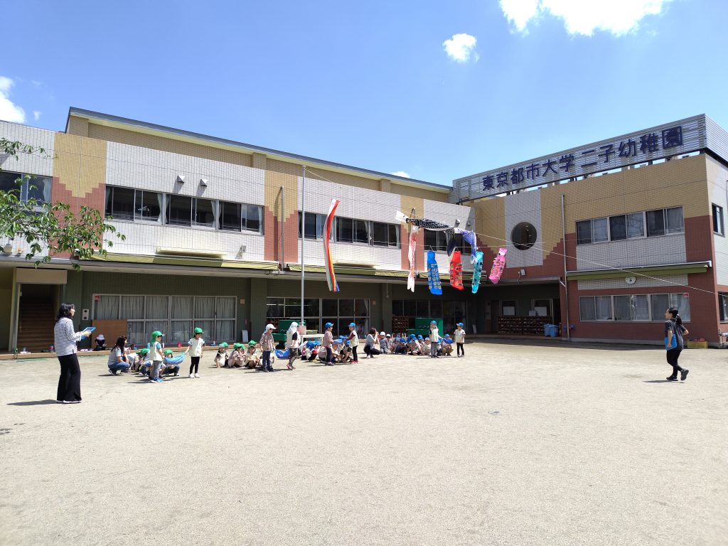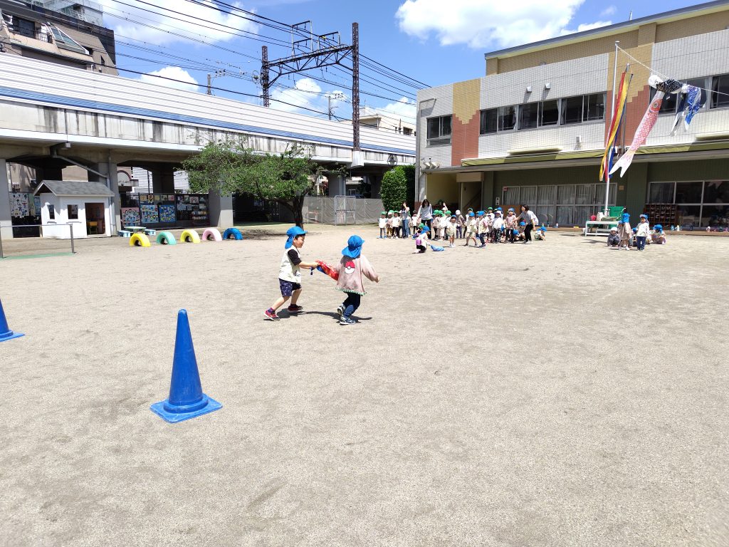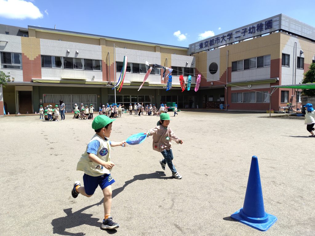 青空のもと、「こいのぼりリレー」をする年長組