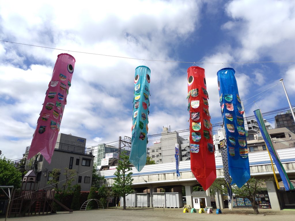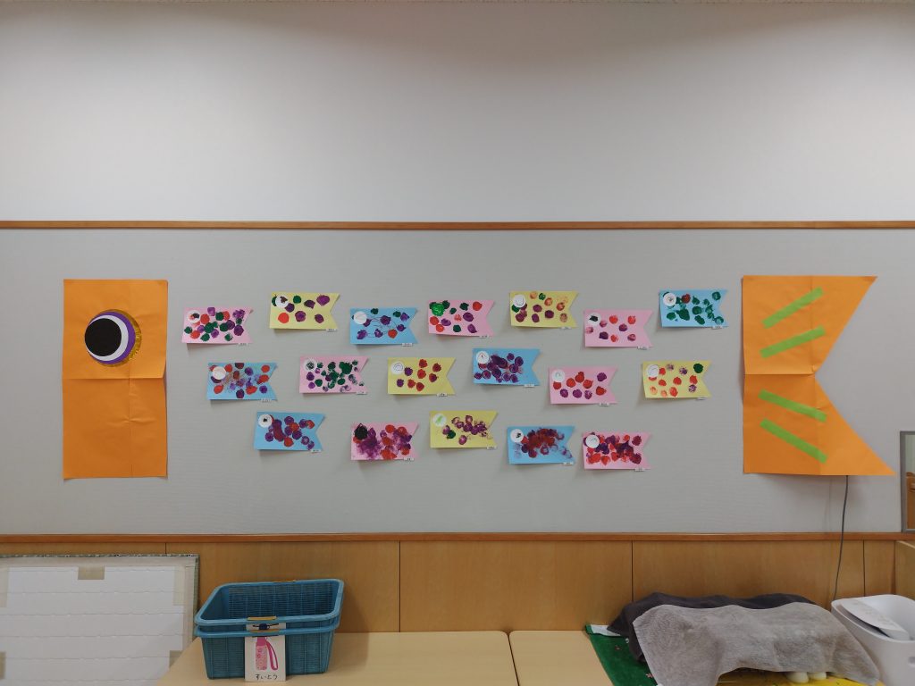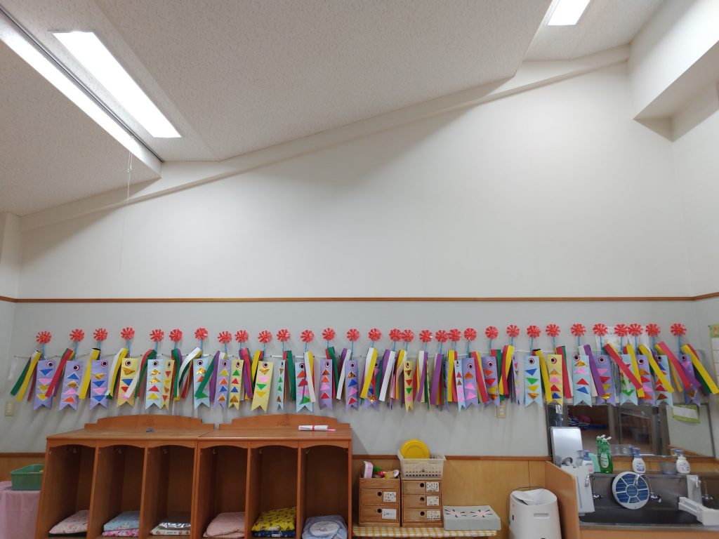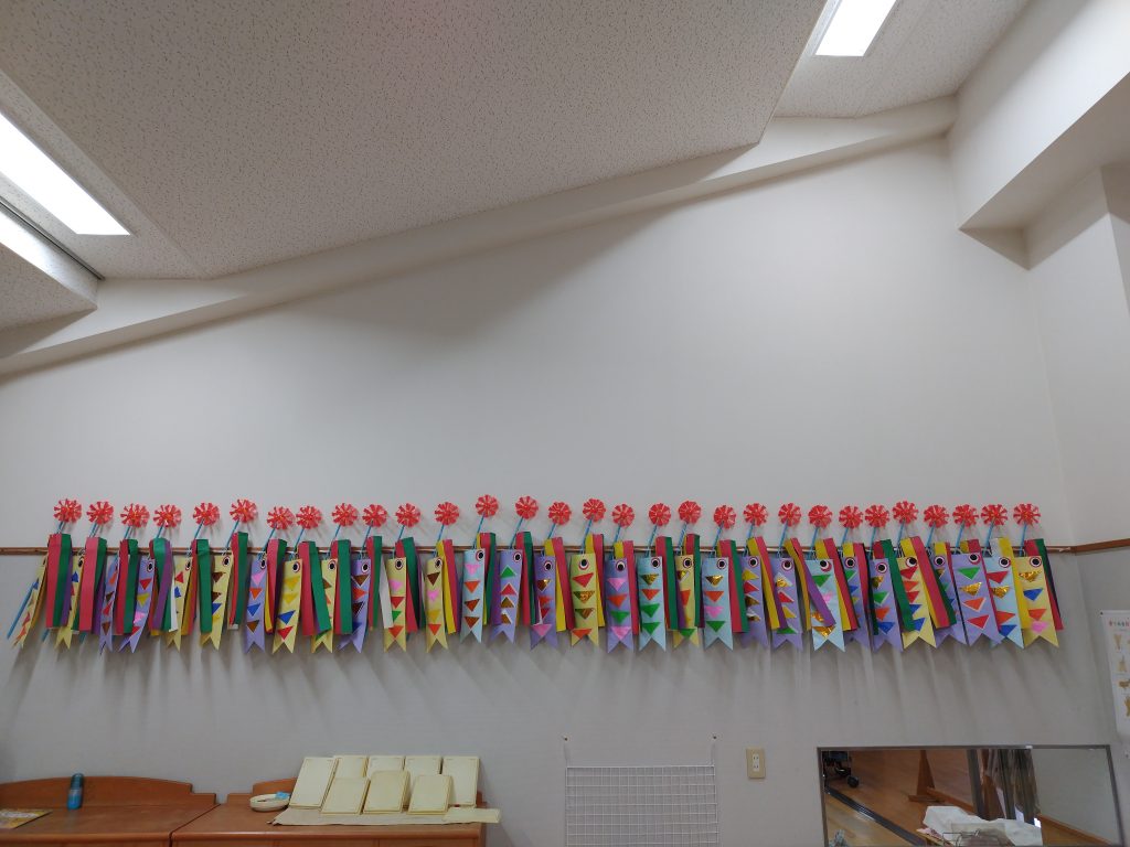 幼稚園では、子どもたちの健やかな成長を願って、こいのぼりがおよいでいます。どれもが上手に仕上がっていて、学年が上がるごとの成長が見られます。