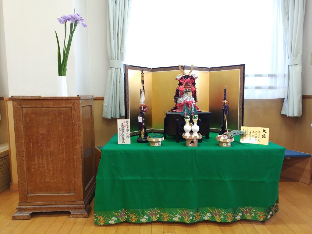 年長組 こいのぼり 図書室にかざられた兜