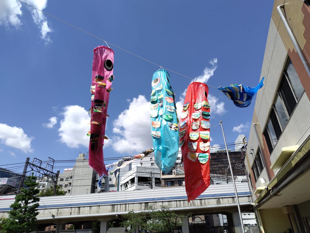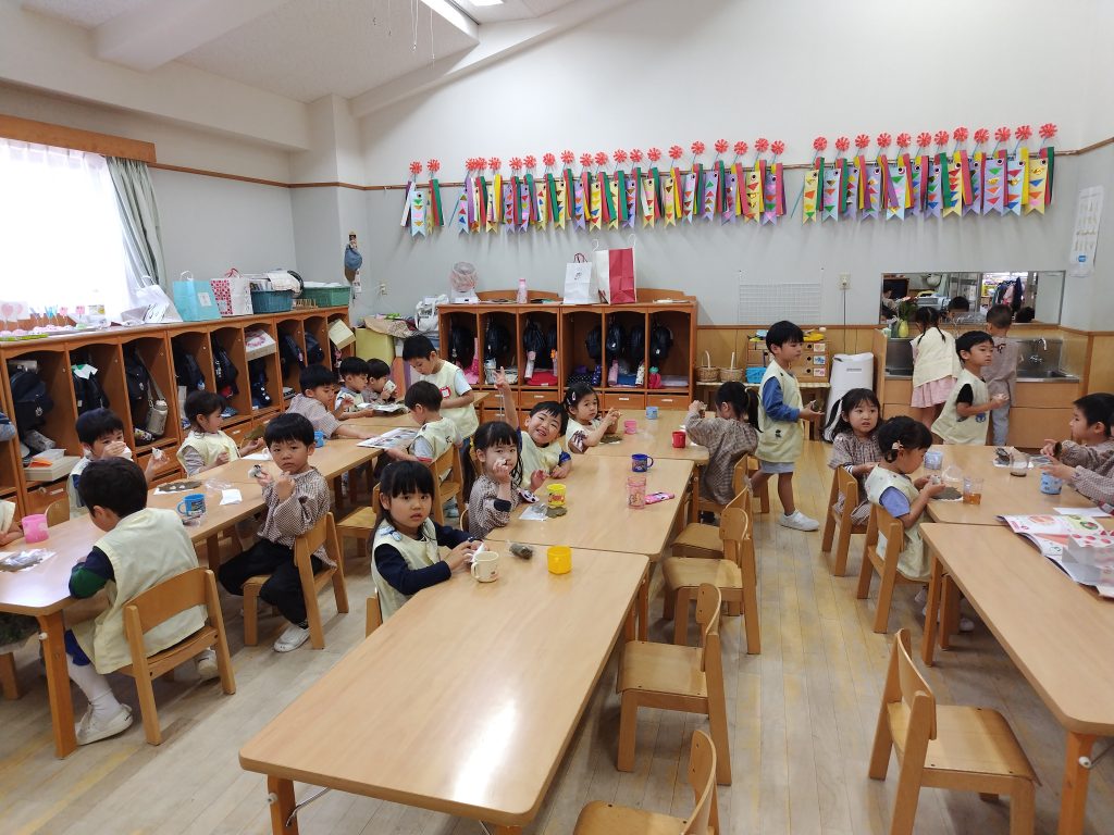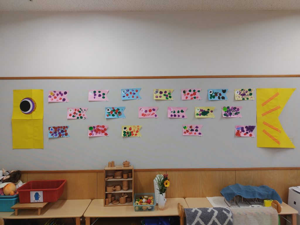 心の中にある思い、頭の中にある考えが、何かをつくることや何かを描くことに繋がります。思いや考えを形にすると、言葉や体の表現に繋がります。「これはこんなふうにつくったんだよ」「この形は強いんだよ」などなど。完成したこいのぼりを自慢げに見せてくれる子どもたち、たくさんのことを語ってくれました。作品をみていると、子どもたちの声が聞こえてきます・・・。