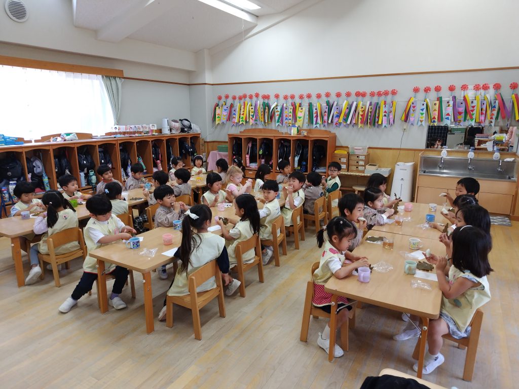 子どもの日のお祝いの柏餅。みんなで仲良く食べました。「おいしい」!