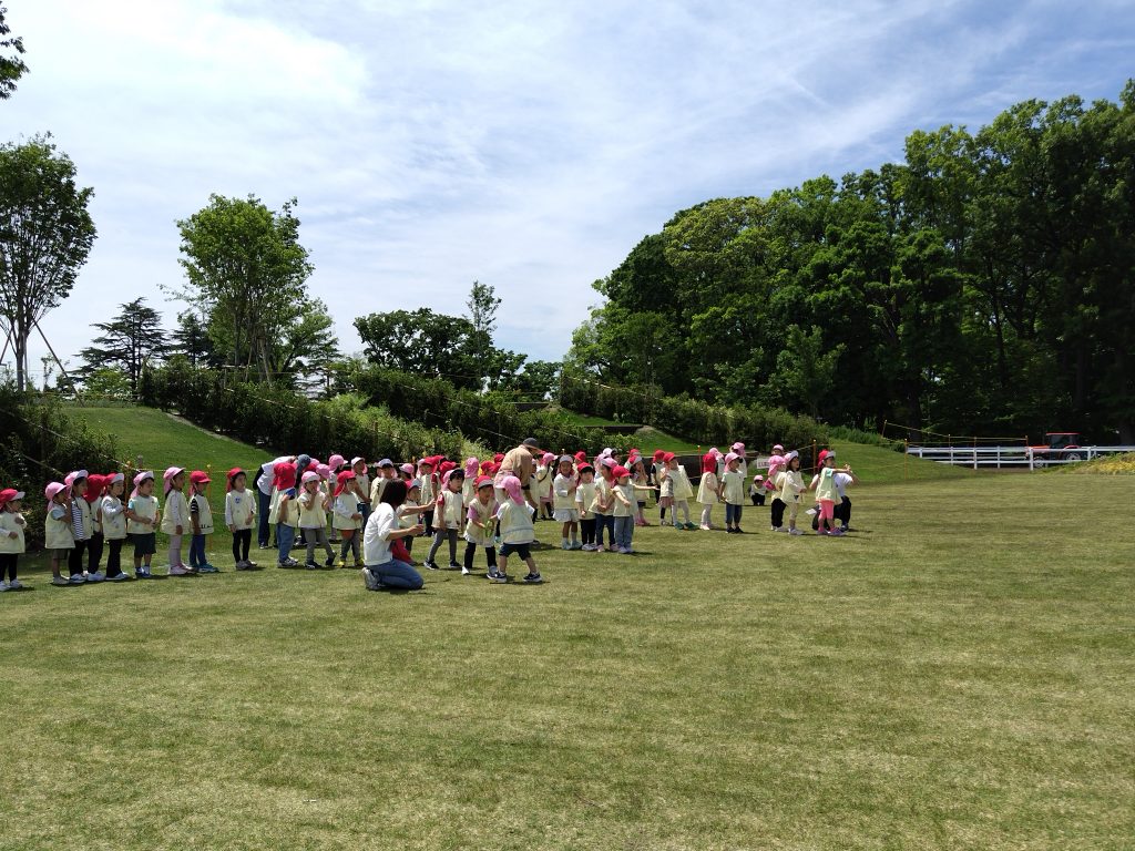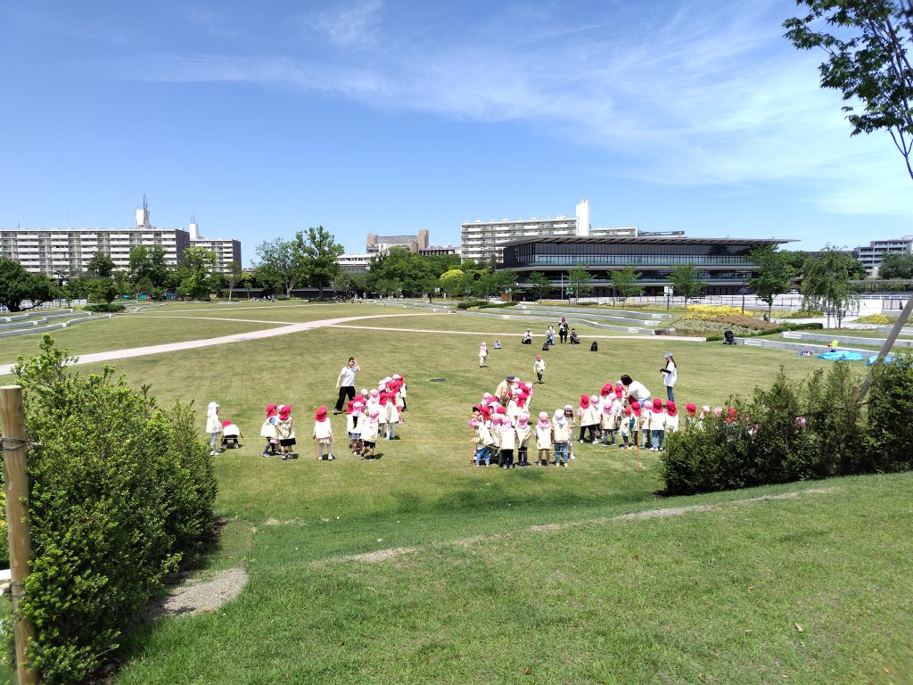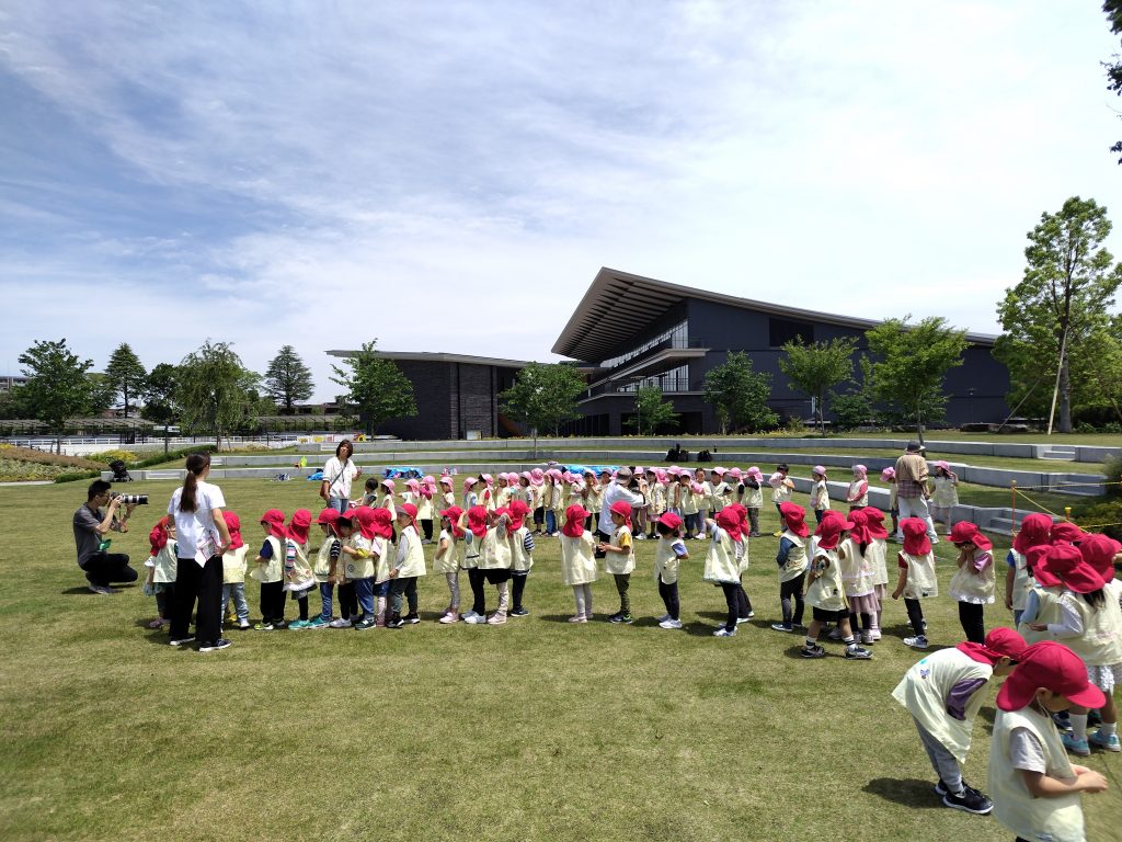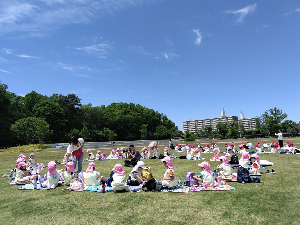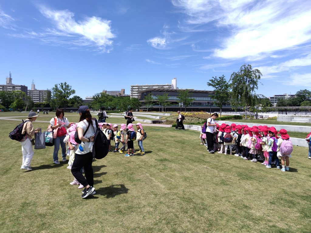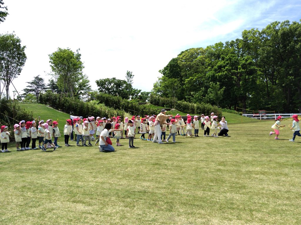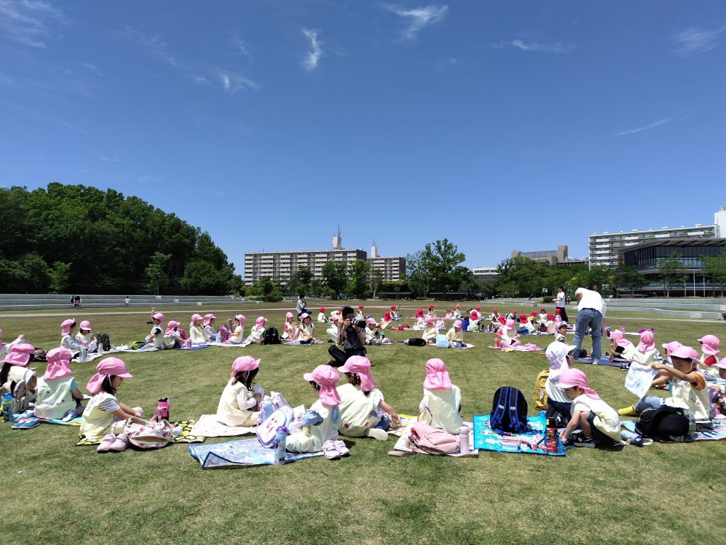 原っぱ広場では、年少時代の3つのクラスに分かれてリレーをしました。さながらミニ運動会です。芝生の上を思いっきり駆け回りました。自然の中で元気いっぱいにあそぶ子どもたち。多くの緑と広い、広い広場。お弁当を広げて、笑顔いっぱいで、遠足を満喫しました。お友だちとの関係が深まり、自然を五感で感じ、公共の場での過ごし方を知るよい機会となりました。
