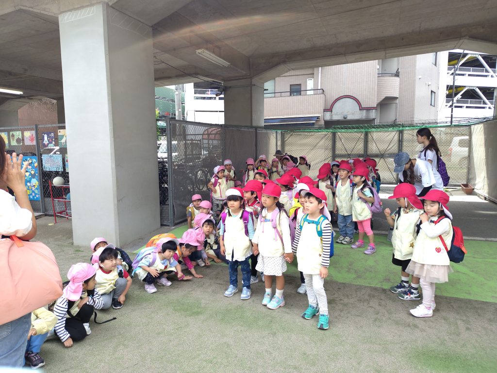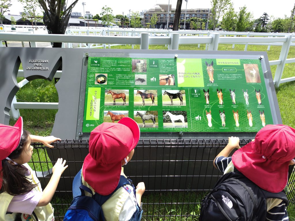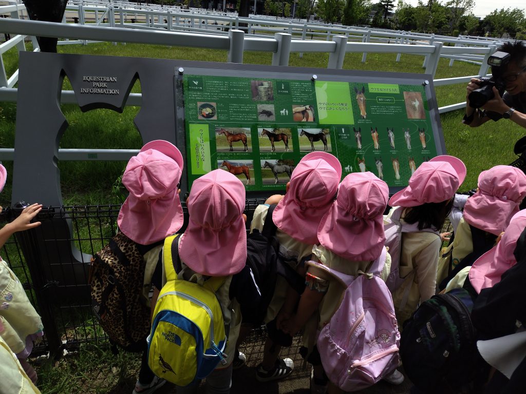 前日の嵐のような雨風がおさまり、晴天になりました。青空が広がり気持ちの良い朝です。元気に朝の挨拶をして出発しました。目指すは「馬事公苑」。バスの中では“お馬さんクイズ”をして過ごしました。何色のお馬さんにあえるのか・・・ドキドキ、ワクワク。目を輝かせてクイズに挑戦する子どもたちの姿が印象的でした。