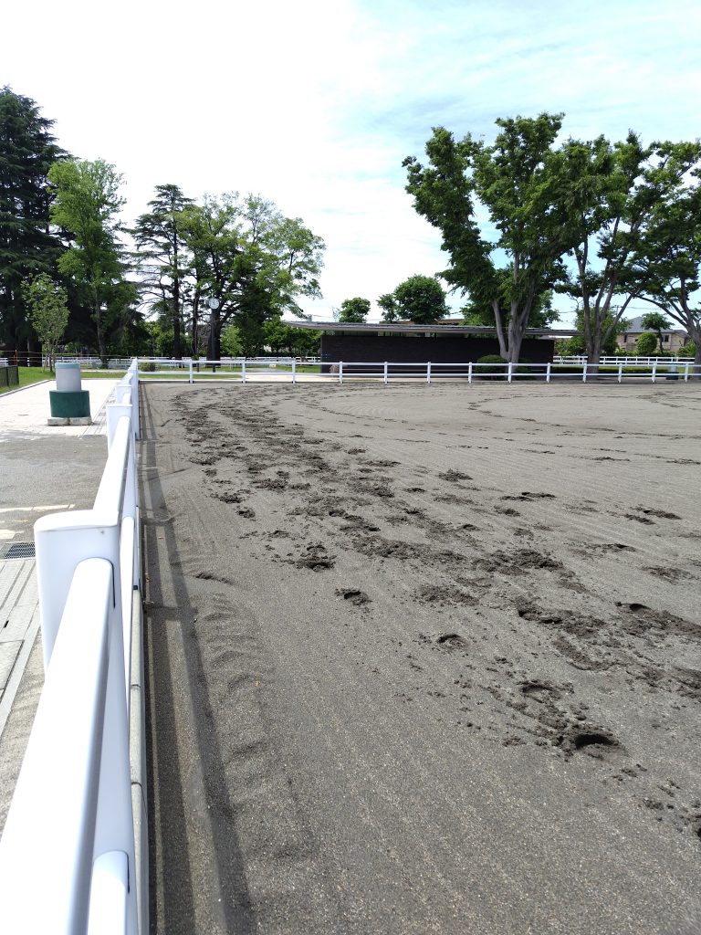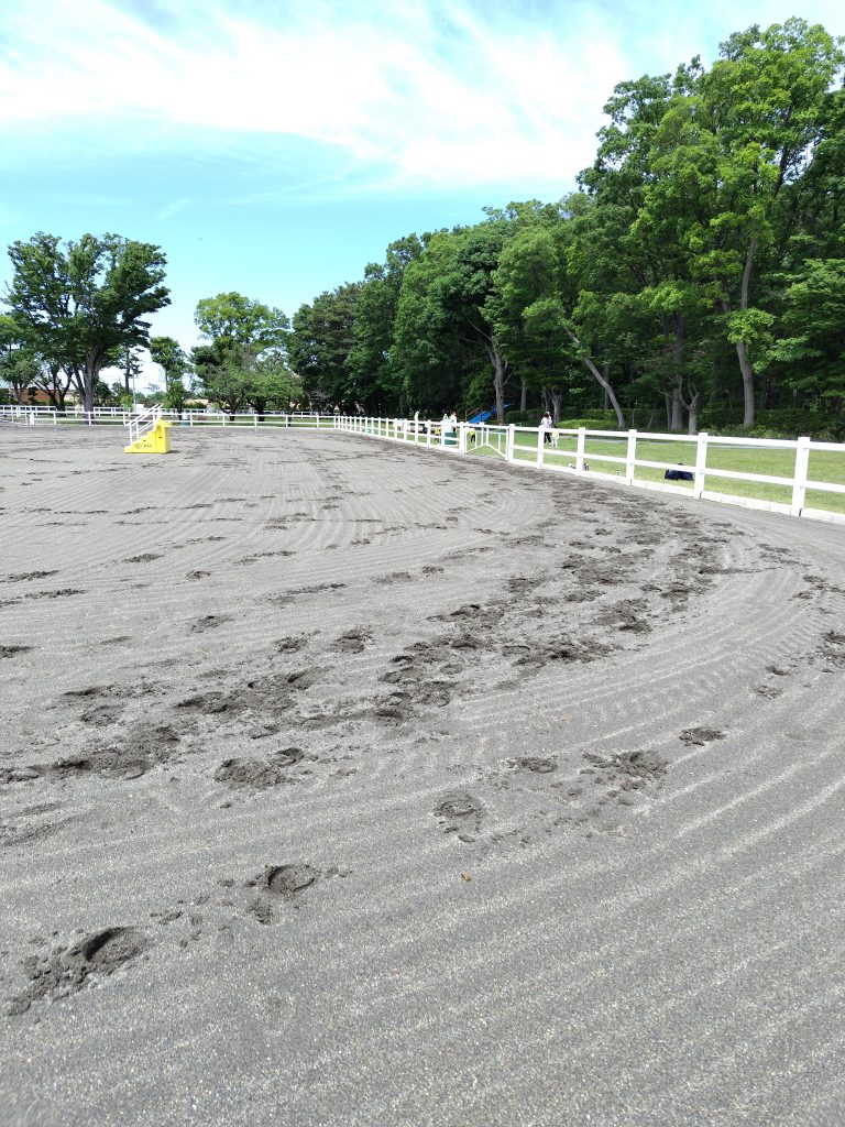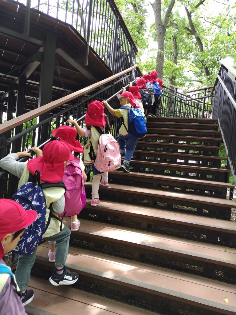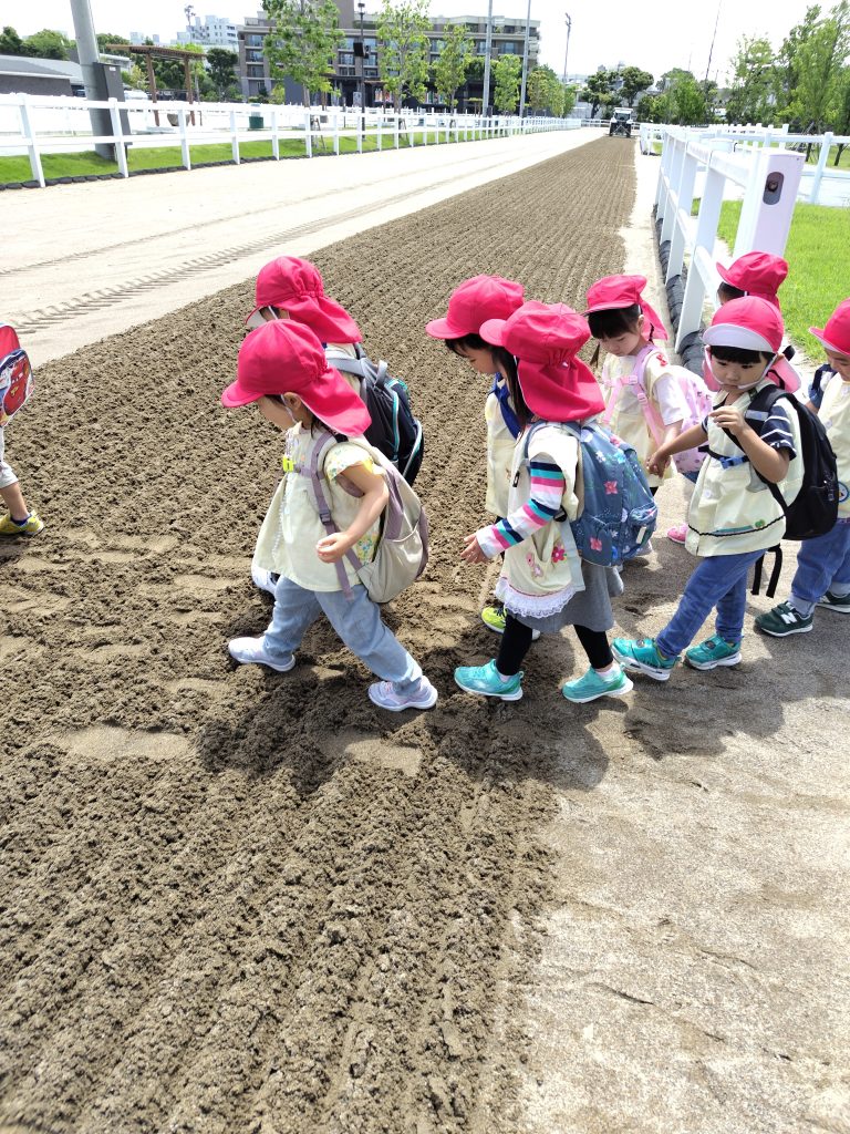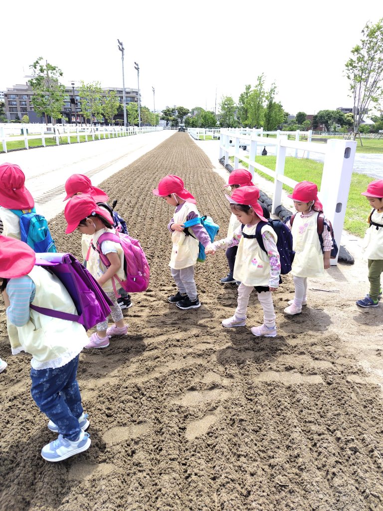 水分補給をして、馬事公苑探索が始まりました。爽やかな風が吹き、木々がさやさやと音を立てて揺れています。心地よい風を受けながら目的の広場まで手をつないで歩きます。「白いお馬さんがみれるかな」「足跡は見つけられるかな」という会話もあり、声がはずみます。空中歩廊(フォレストパス)を進み自然林を抜けて、放牧場に着きました。馬の姿はありませんでしたが、足跡を発見して大興奮。ダートコースを横断し、原っぱ広場に到着。