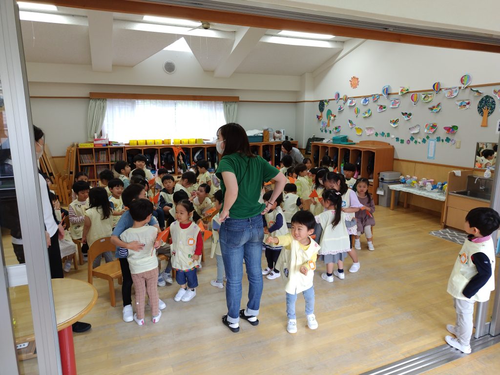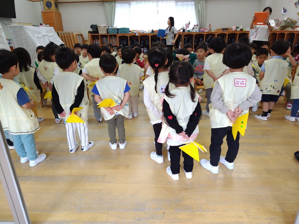 年長組のお姉さんお兄さんは、年少組の子どもたちの朝の身支度を手伝ってくれます。園庭で、いっしょにあそんでくれます。頼もしく、優しい“先輩”一人ひとりに、気持ちの伝達です。「ありがとう」のかわいらしい大きな声が園舎内に響きました。ちょっぴり照れたような笑顔の年長さん、プレゼントをもらって自分の成長を実感した様子。お部屋いっぱいにちょうちょうが舞いました。羽の音は嬉しさのあらわれです。