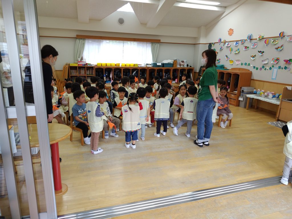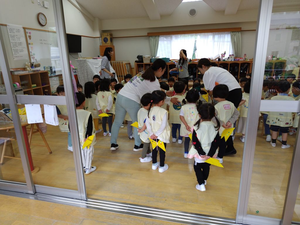 ことり1組、2組の子どもたちが、やま組、もり組のお姉さん、お兄さんに心を込めて作った「ちょうちょう」をプレゼントしました。