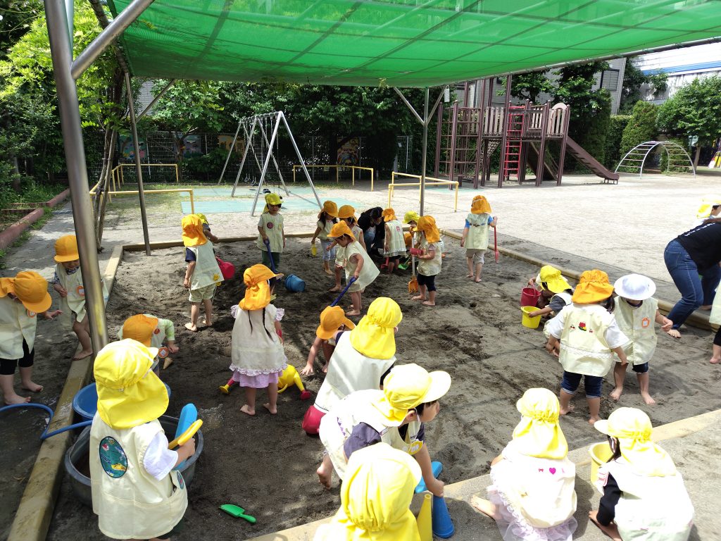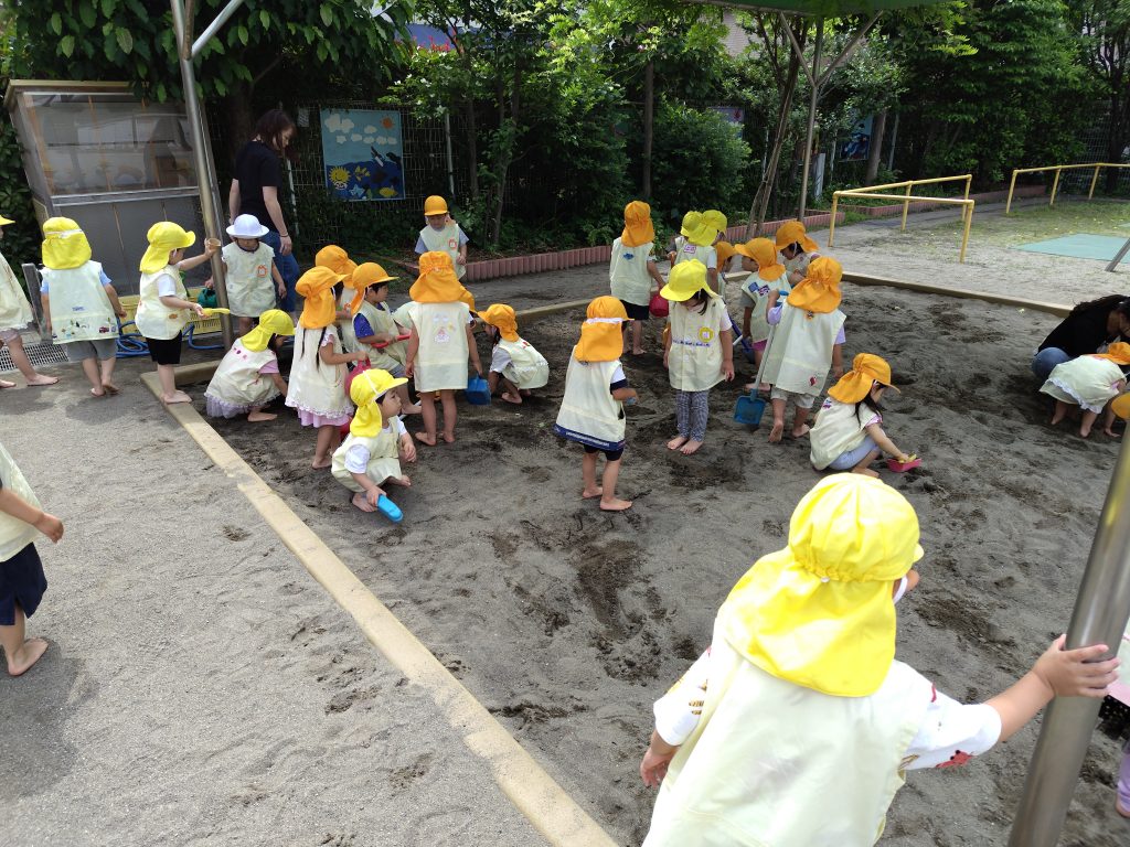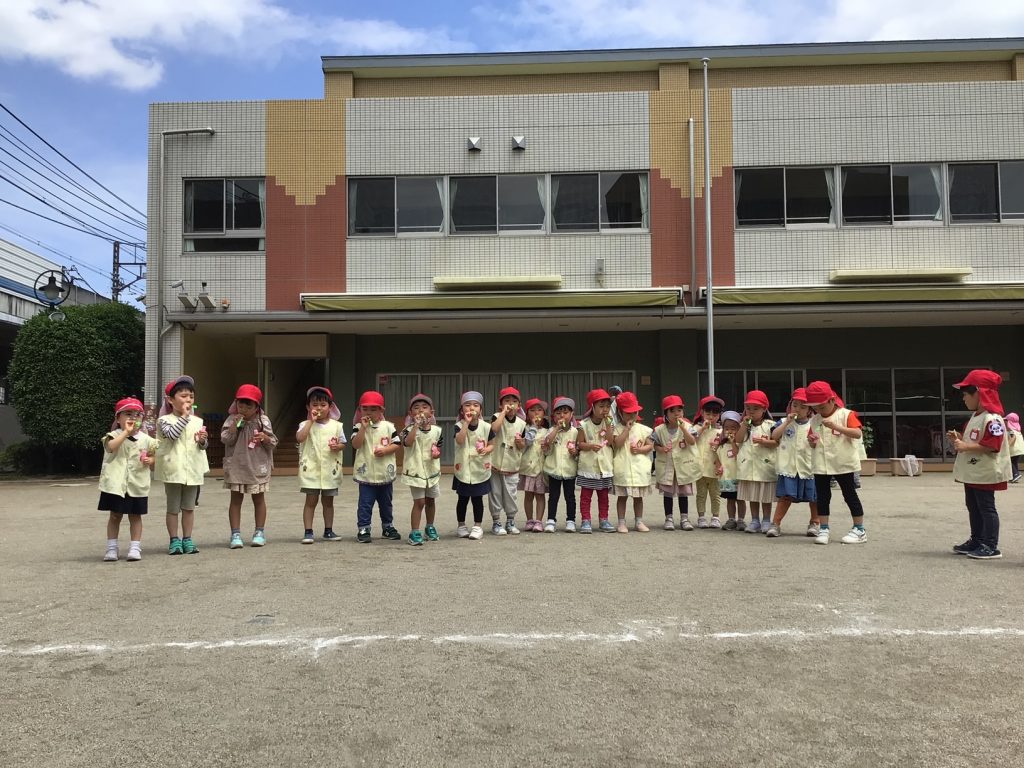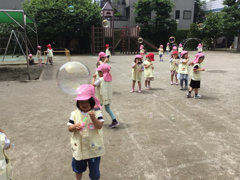 年中組は園庭でしゃぼん玉あそび。「しゃぼん玉の約束やあそび方を知り、楽しむ」のがねらいです。とんだ、とんだ、しゃぼん玉がとびました。おいかけて、おいかけて、消えます。お友だちといっしょに吹いて、どっちが大きくなるか競争したり、風に乗って空をとぶしゃぼん玉の追いかけっこをしたり、楽しい時間を過ごしました。