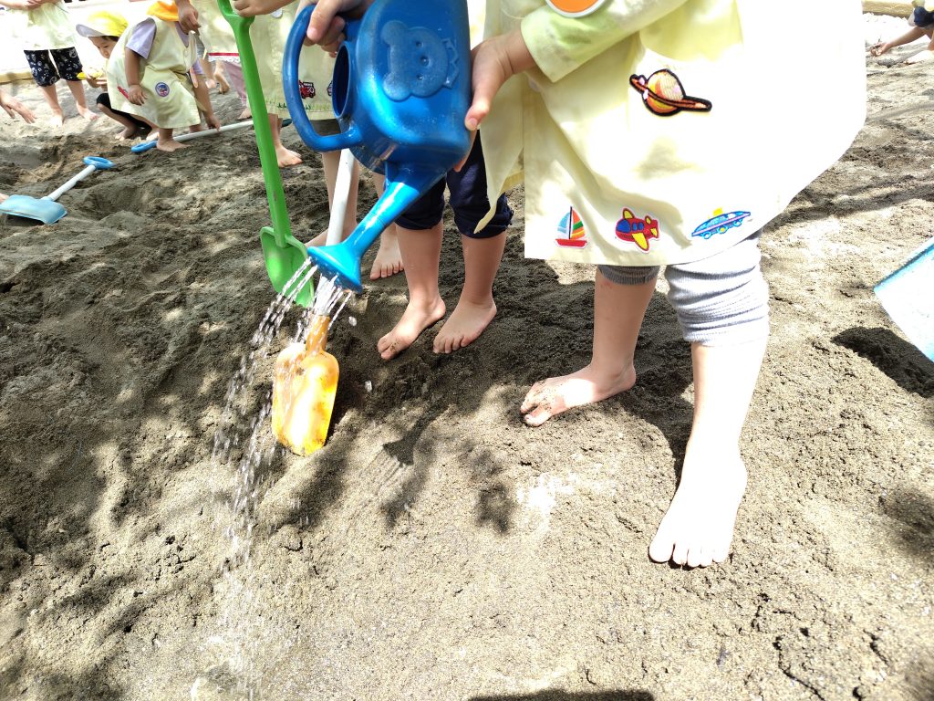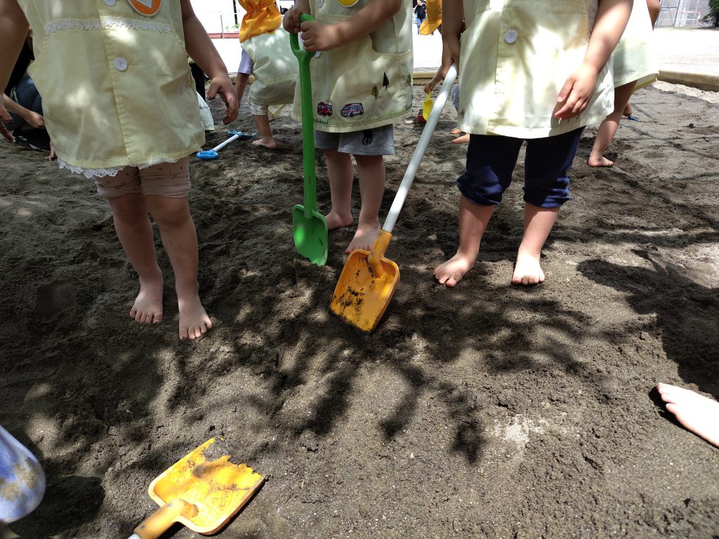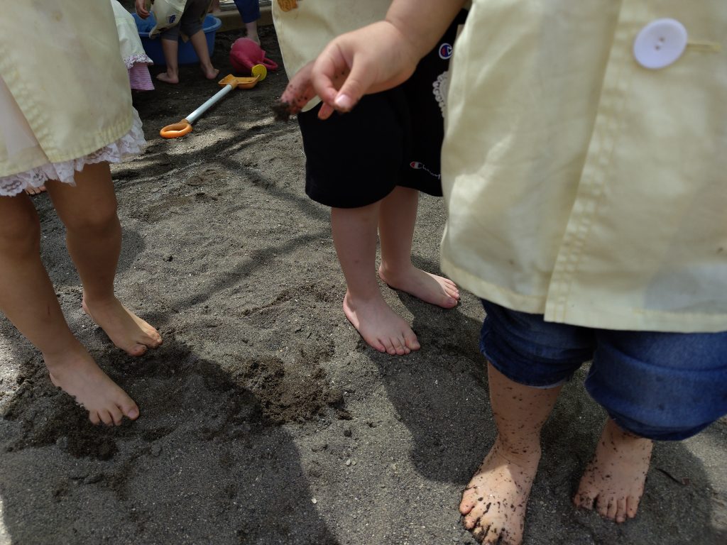 年少組が裸足で園庭あそび。砂場で水を流したり、園庭をかけたり。「痛い」「冷たい」「チクチクする」「気持ちいい」。どろんこや石ころの感覚が、足の裏から伝わってきます。子どもたちのあそび方は、ダイナミックで自由そのもの。汚れようが濡れようがおかまいなし。「園長先生、ここに池があるよ」と、砂の池に夢中になっていました。