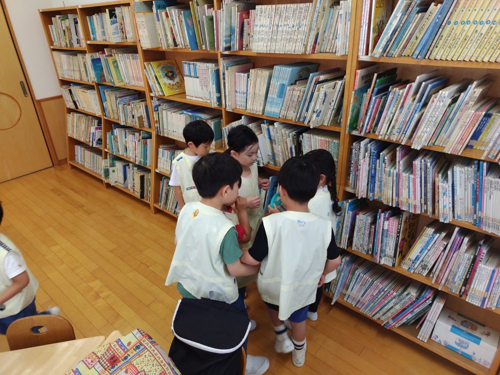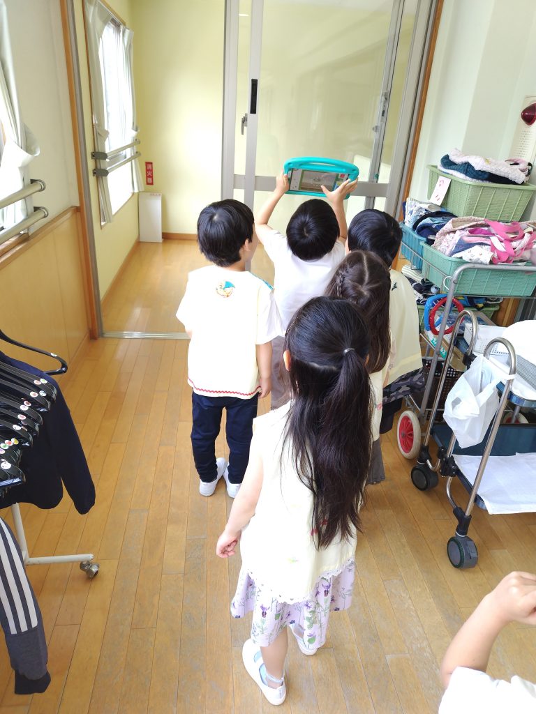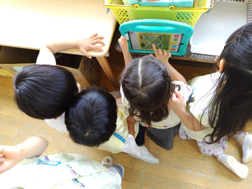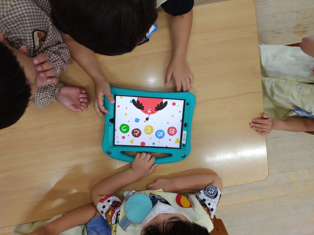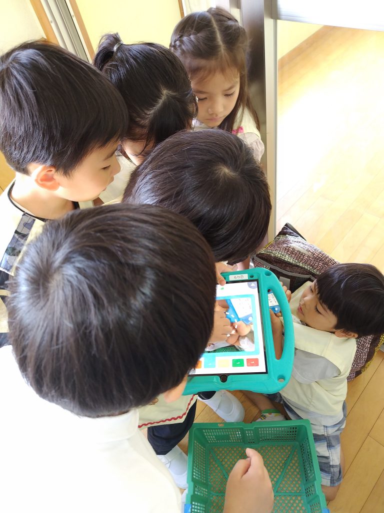ステンドグラスから逃げ出したタコとカエル(色)を探して、チームで園内大冒険。クッションパットに入ったタブレットをチームで駆使して探します。一人一台ではないので、コミュニケーションが活発です。気軽に繰り返しができるので、子どもたちは積極的に活動します。何度でもチャレンジできることが魅力。失敗をしない選択をすることは賢明なことですが、偶然得たものやその組み合わせで発見したものは、喜びとなります。
