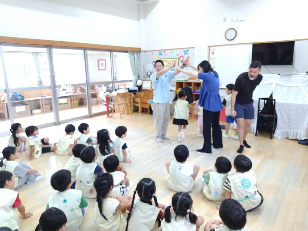 東京都市大学附属小学校から、お二人の先生がいらしてくださいました。先生方の自己紹介から始まりました。子どもたちは、だんだんと“英語あそび”の世界に引き込まれていきます。好きな食べ物の話し、ボールを使った数と色あて、小さなボールのつかみ取りから始まる数あそび・・・。静かに話を聞く姿勢をほめられ、質問にしっかりと応える姿をほめられ、元気な声が部屋中に響きます。最後に、通り道を先生側がつくり、子どもたちが通る側になり“London Bridge Is Falling Down”をしました。ドキドキ、ワクワクの楽しい時間。子どもの歌ですがちょっとした文法が織り込まれており、大人でも勉強になります。今日は、小学校の校長先生がやま組、もり組の子どもたちの様子をみてくださいました。終始笑顔で過ごされていました。