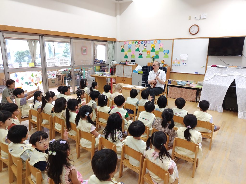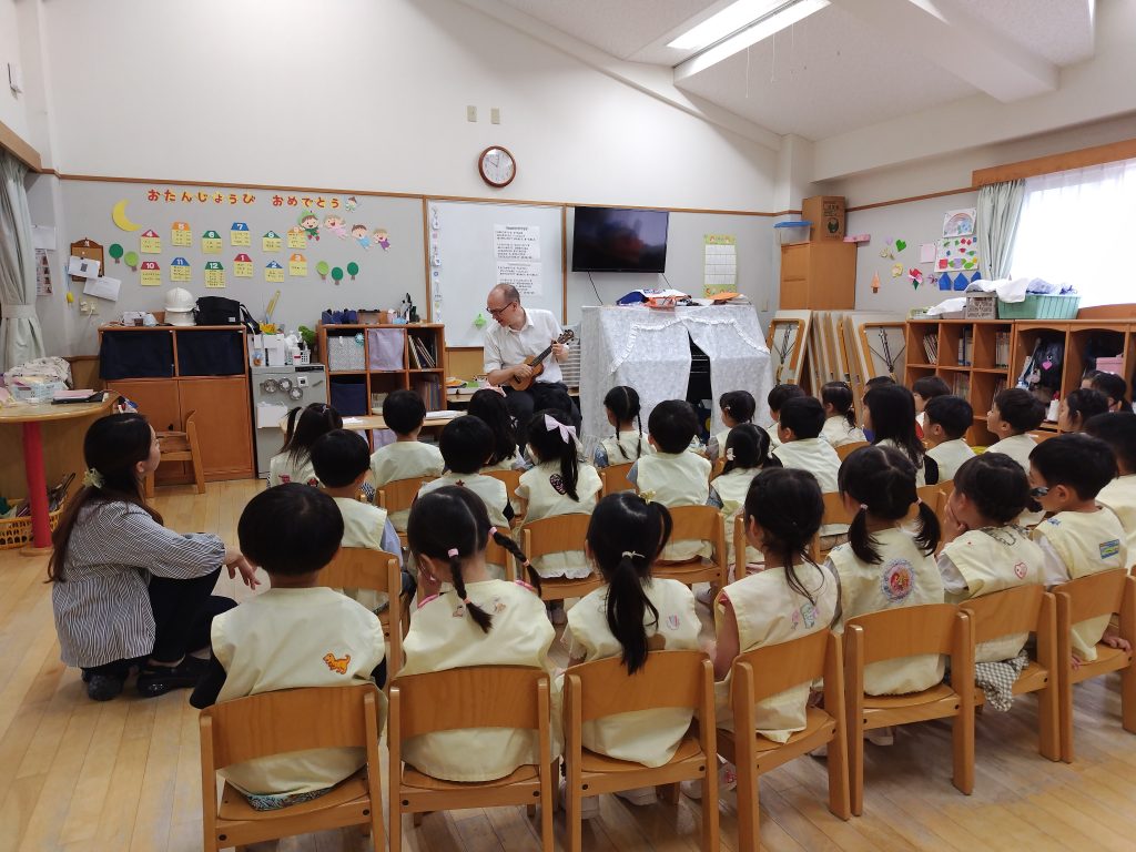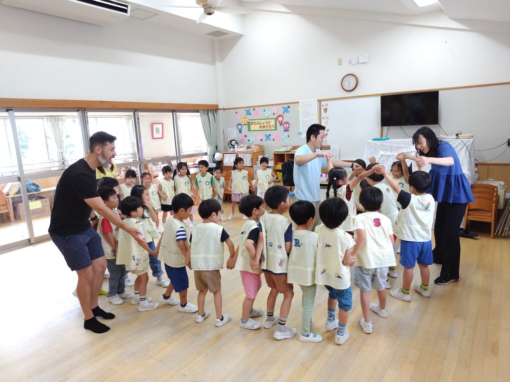 東京都市大学附属等々力中学校・高等学校から先生がいらしてくださいました。子どもたちは、朝からワクワク、ドキドキ。笑顔いっぱいで「Hello」。挨拶の基本がしっかりと出来ています。先生も満面の笑み。数の数え方、カードを使った動物あてクイズ・・・。子どもたちは、「ネズミの鳴き声の発音が難しい」と、感想を漏らしていました。最後は、ウクレレを弾きながら“London Bridge Is Falling Down”をして楽しい時間を過ごしました。橋にはさまって捕まった瞬間、みんな大興奮。汗びっしょりになった先生、みんなで笑顔で「good bye」とお別れをしました。