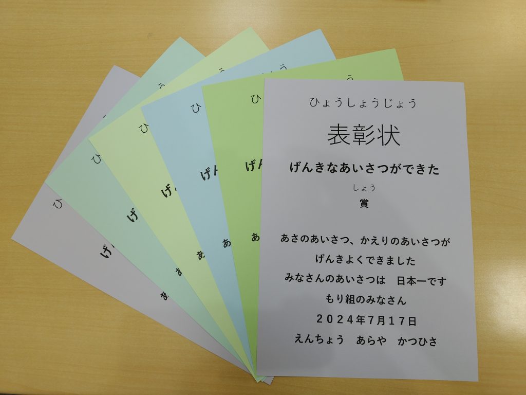 それぞれの子どもたちの心の動き、子どもたちの世界の中で多くのドラマがありました。振り返ると、子どもたち一人ひとりが人として豊かに育っていく姿が多く見られた一学期でした。“活気あふれる幼稚園”は、子どもたちがつくり出したものです。東京都市大学二子幼稚園の子どもたちの挨拶は、日本一!終業式で、各クラスに『げんきなあいさつができた賞』の表彰状を授与しました。