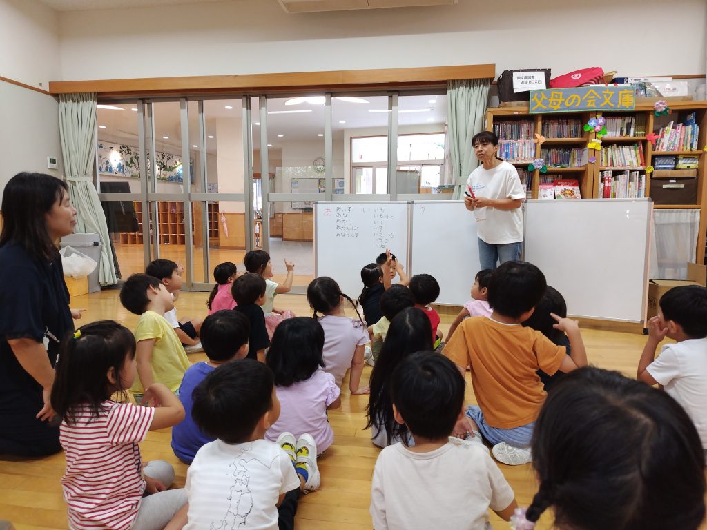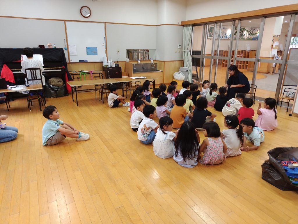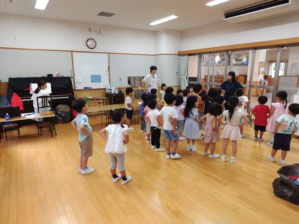 しっかりと声を出して、目を輝かせて歌っています。「手をたたこう」「にじのむこうに」。子どもたちの歌声は、心に喜びをもたらすすてきな響きがあります。かわいらしく、感動的です。みんなで歌った夏のひととき、よい思い出となることでしょう。