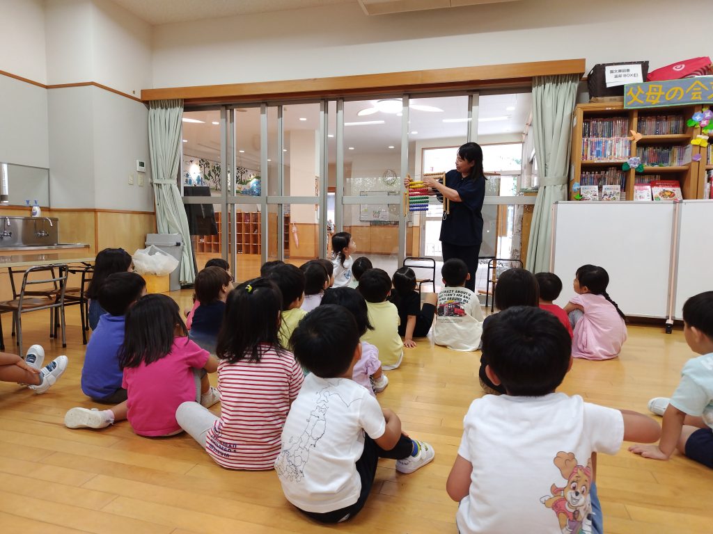 園長室に子どもたちの歌声が響いてきました。夏休み、預かり保育で園を訪れた子どもたちです。元気な歌声に誘われて、子どもたちに会いに行きました。