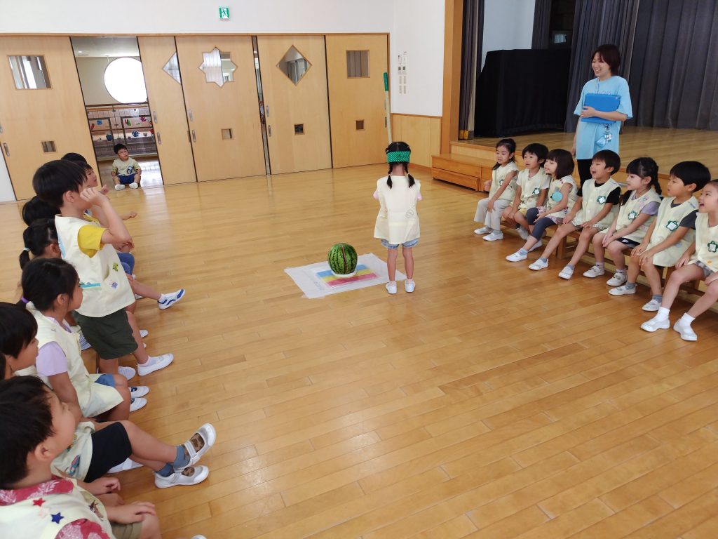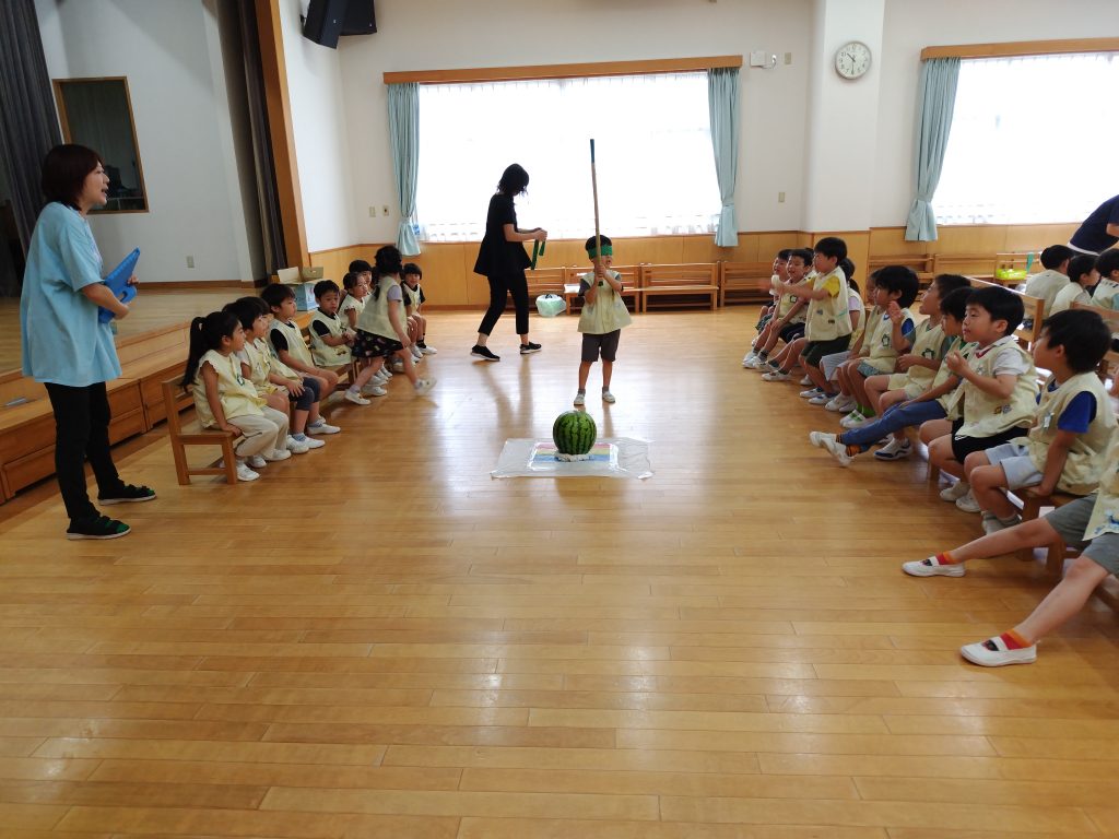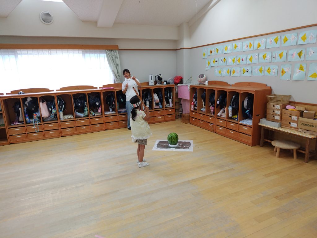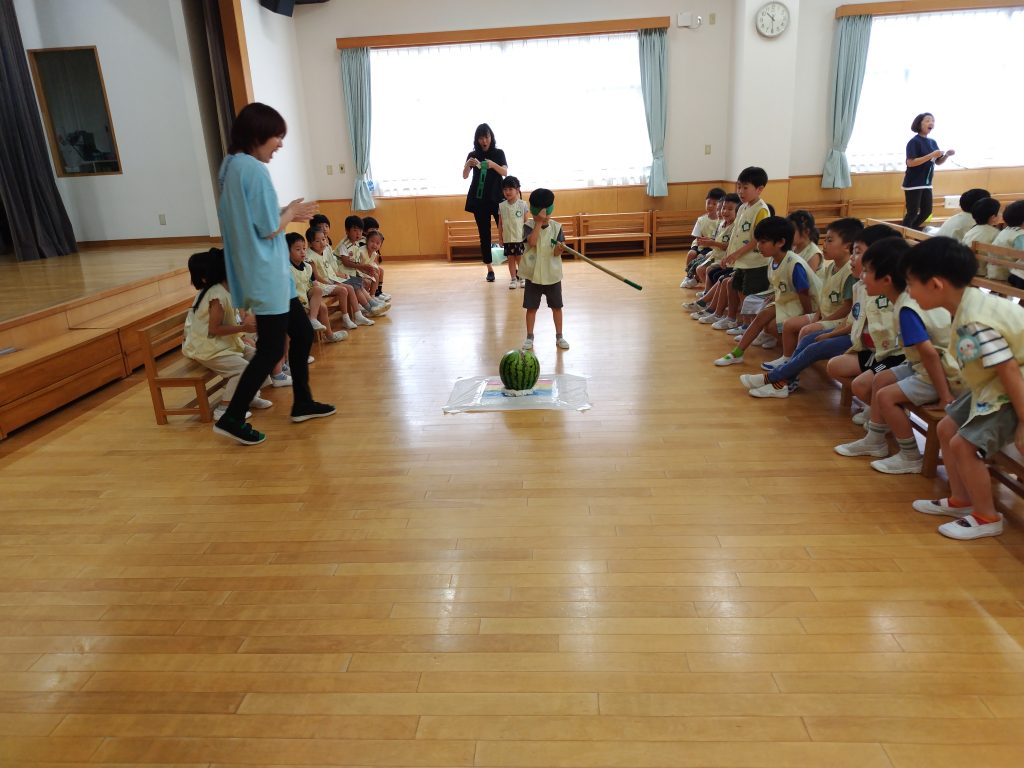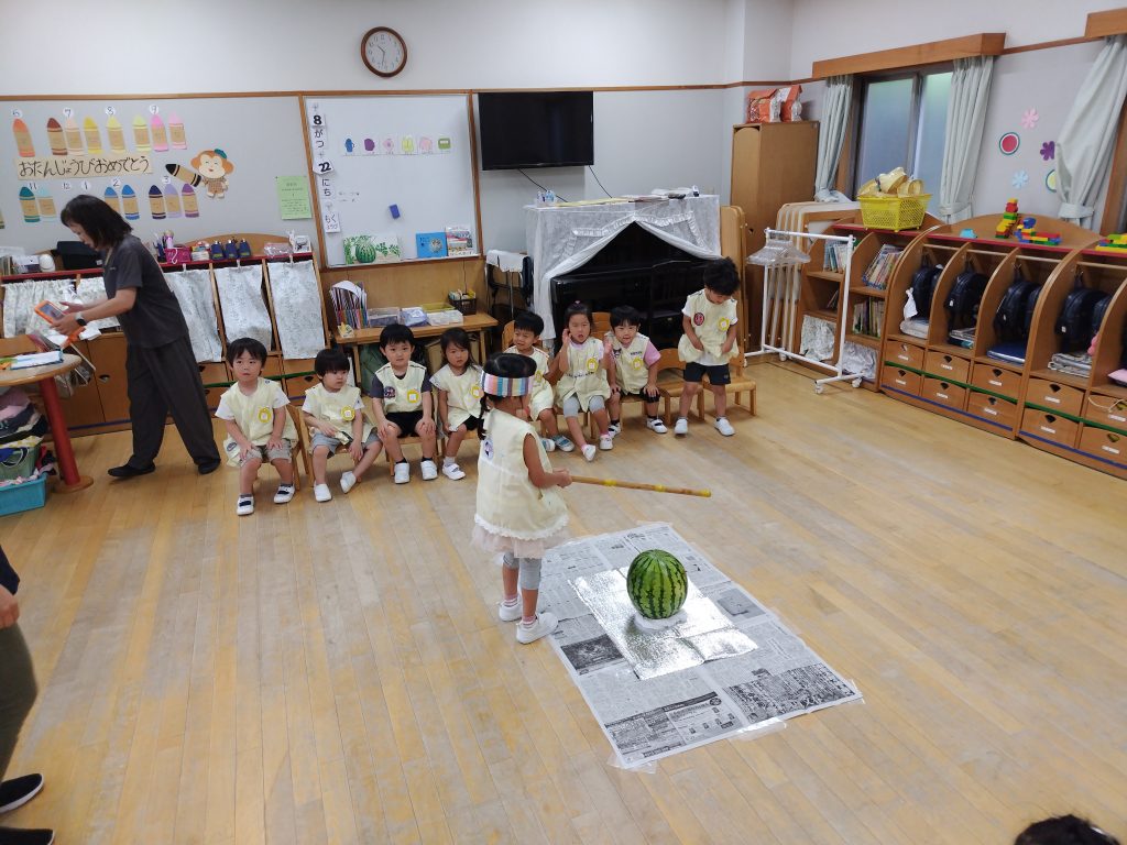 年長組、会場の遊戯室が熱気に包まれています。やま組、もり組の2会場。ルールは単純ですが、想像以上の盛り上がり。まるで“すいか割り選手権”です。「がんばれー」「もっと右、右」「真ん中で振って」…、どちらの会場も大きな声援が飛び交います。「ええっ~い!」、半分に割れて、「わぁ~」。大喜びの子どもたち。3年間で最後のすいか割り、夏の良い思い出となりました。