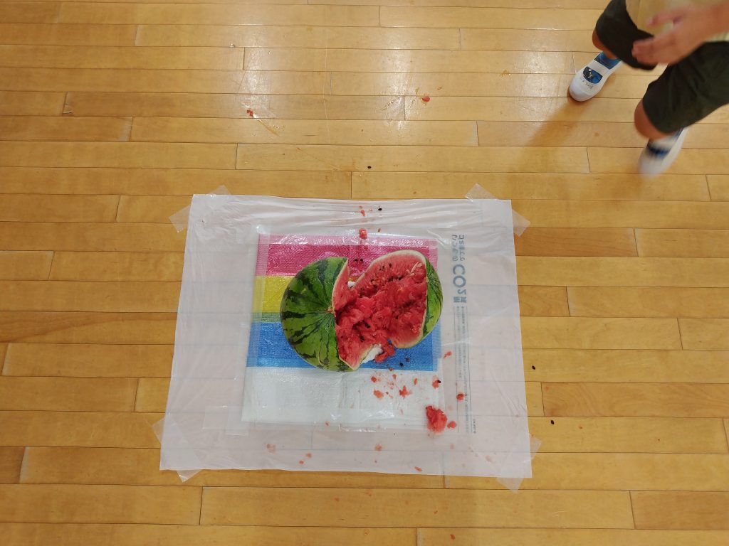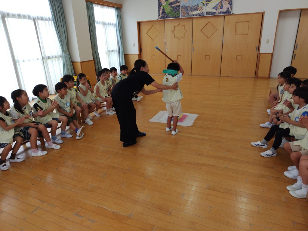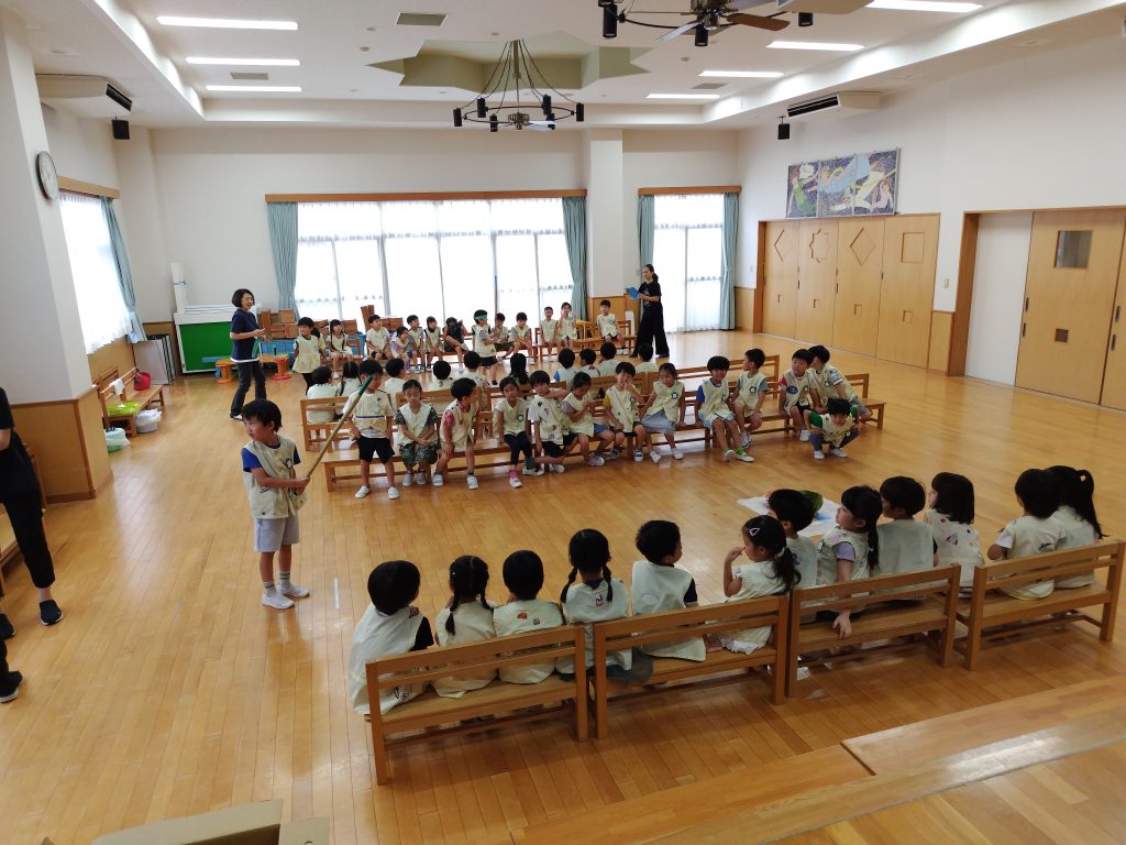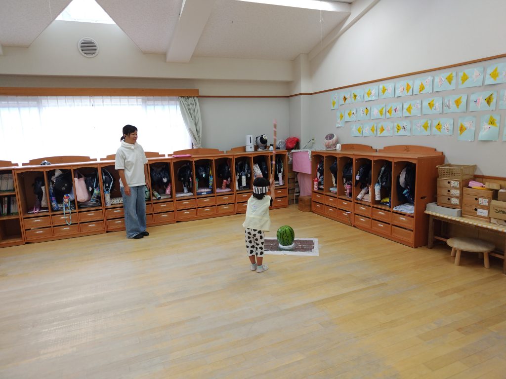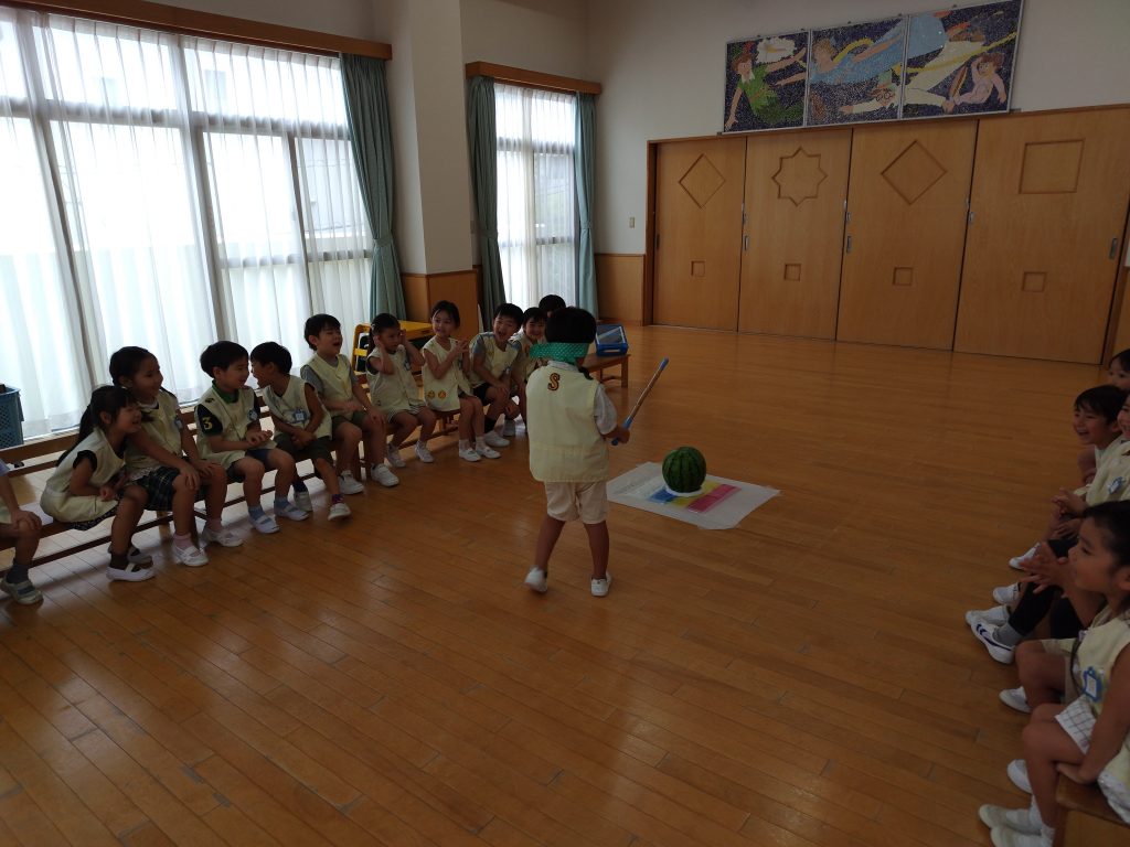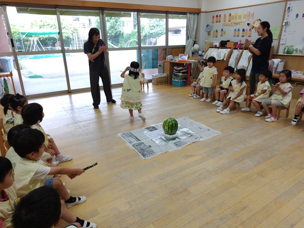 年長組、会場の遊戯室が熱気に包まれています。やま組、もり組の2会場。ルールは単純ですが、想像以上の盛り上がり。まるで“すいか割り選手権”です。「がんばれー」「もっと右、右」「真ん中で振って」…、どちらの会場も大きな声援が飛び交います。「ええっ~い!」、半分に割れて、「わぁ~」。大喜びの子どもたち。3年間で最後のすいか割り、夏の良い思い出となりました。
