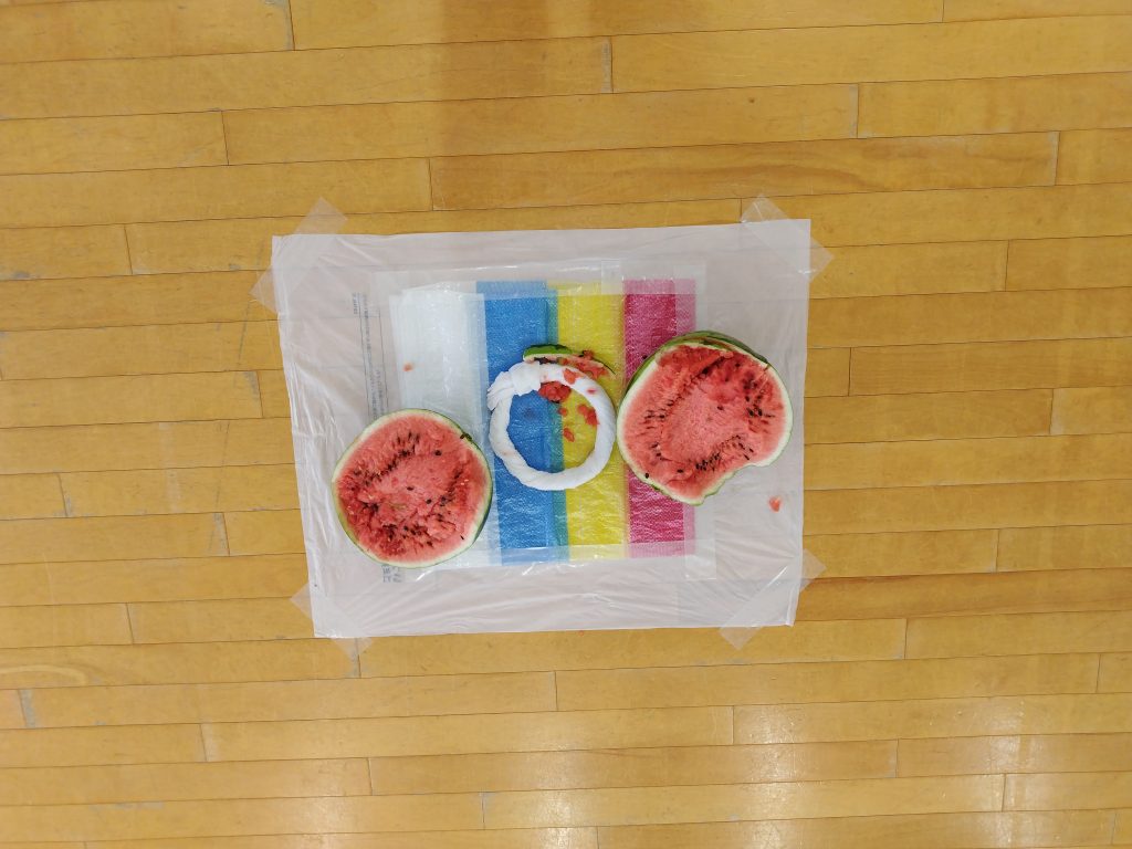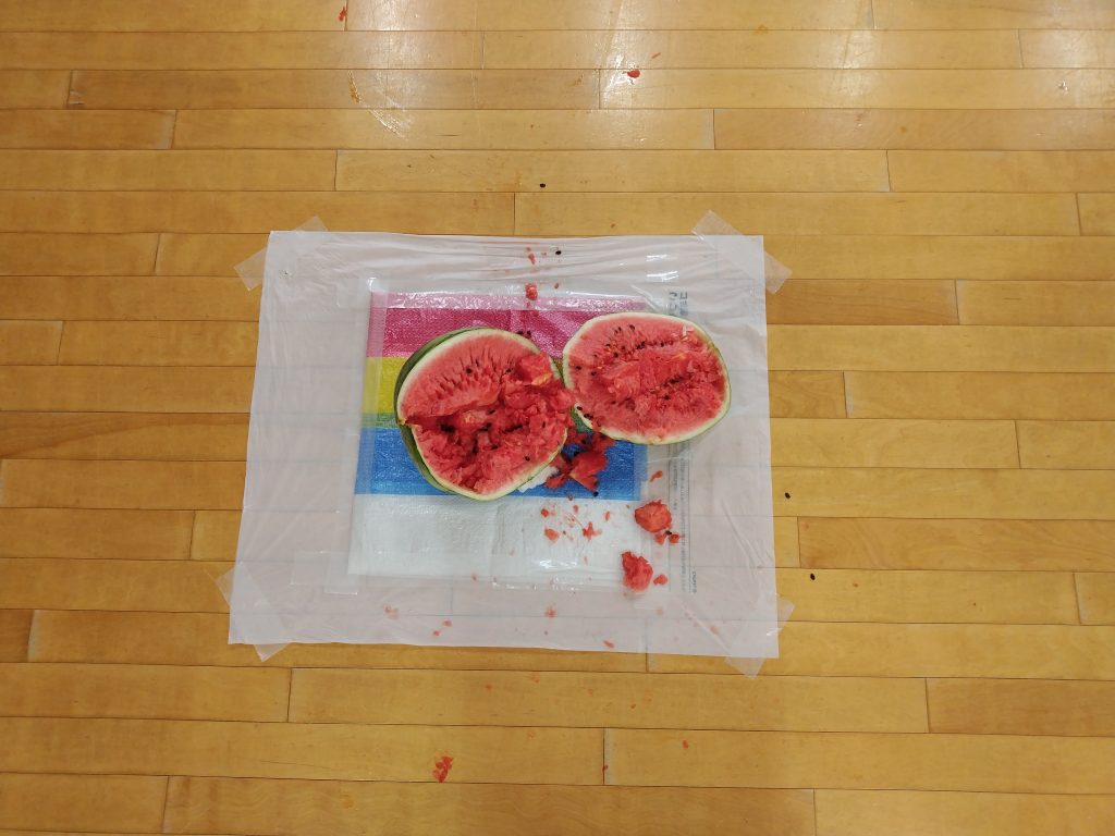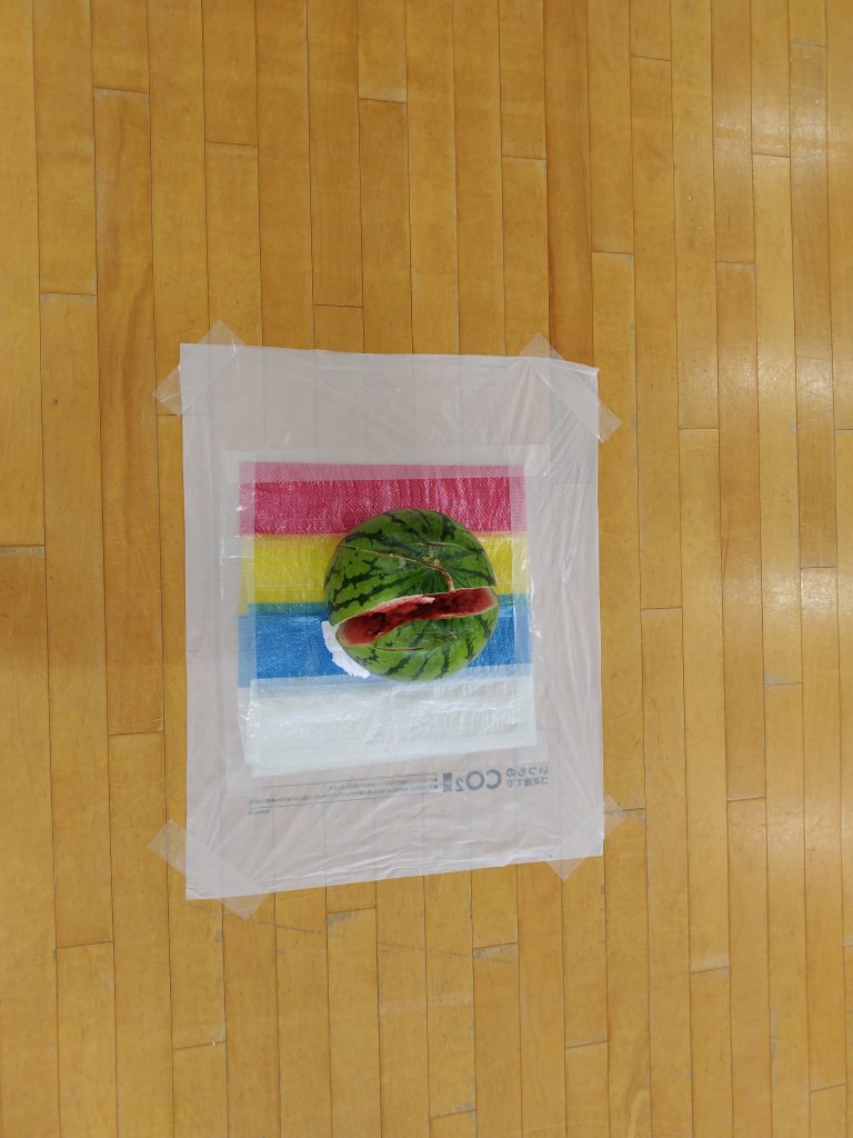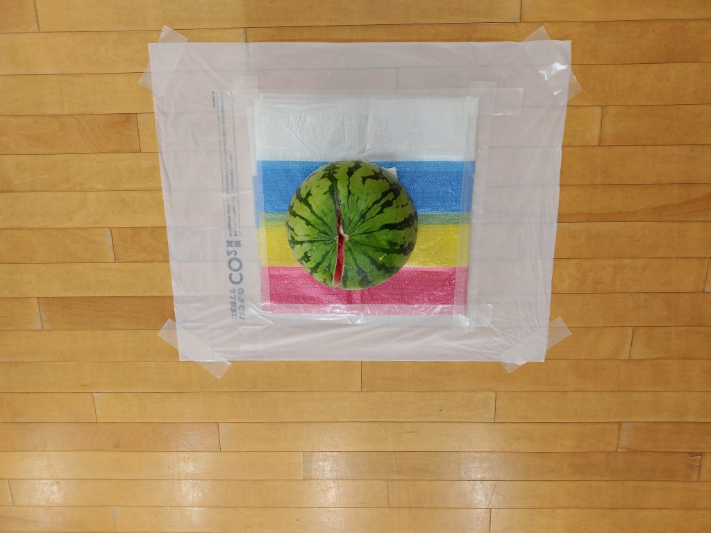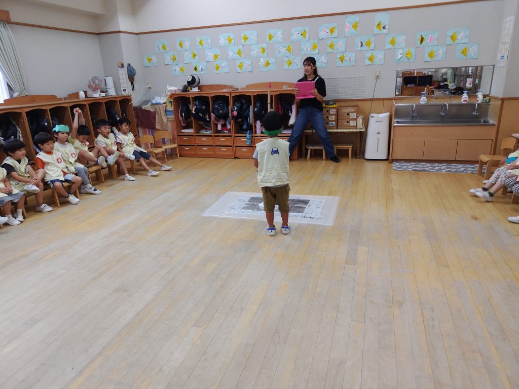 年長組、会場の遊戯室が熱気に包まれています。やま組、もり組の2会場。ルールは単純ですが、想像以上の盛り上がり。まるで“すいか割り選手権”です。「がんばれー」「もっと右、右」「真ん中で振って」…、どちらの会場も大きな声援が飛び交います。「ええっ~い!」、半分に割れて、「わぁ~」。大喜びの子どもたち。3年間で最後のすいか割り、夏の良い思い出となりました。