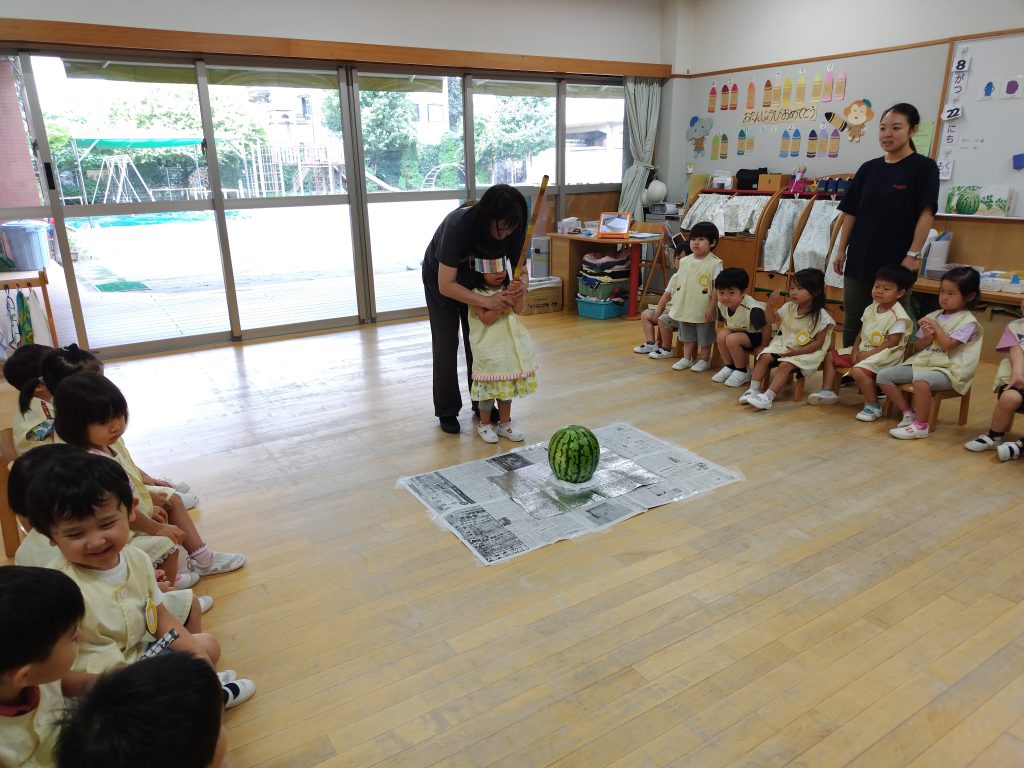 夏といえば“すいか割り”、夏期保育二日目のメインイベントです。一つの大きなすいかをみんなで割って、みんなで食べます。目隠しの仕方、すいかを割る方法、順番、応援の仕方のお話しを聞いて、いよいよ開始です。会場は各クラス。年長組は遊戯室が会場です。どの会場も安全対策は万全です。