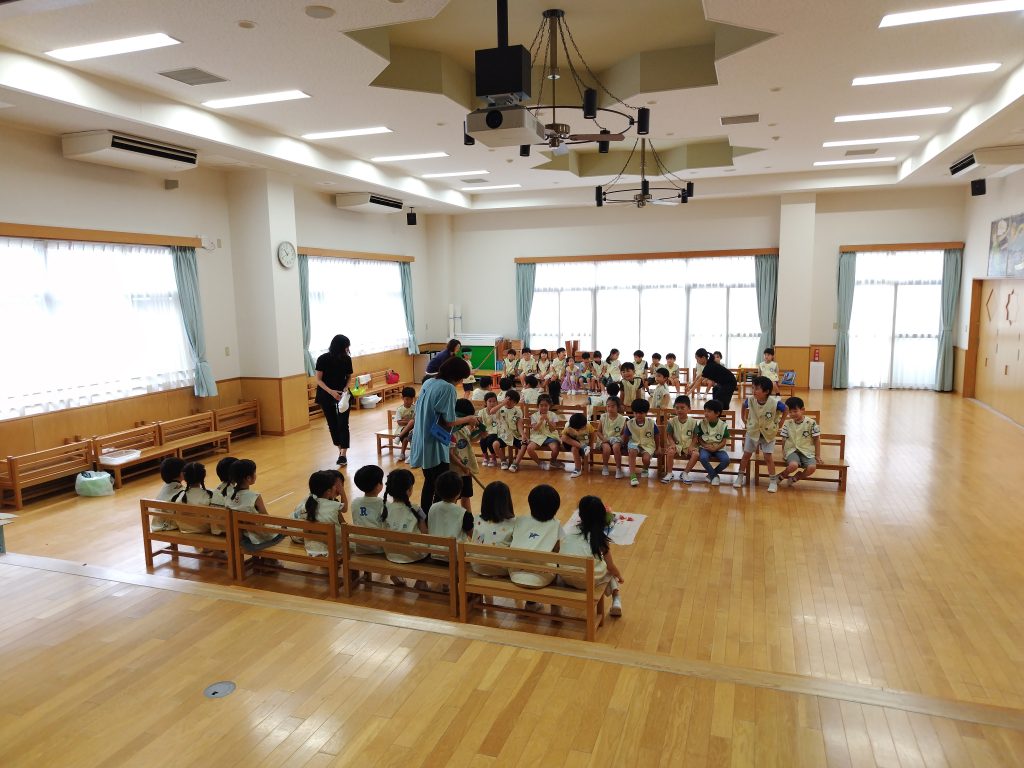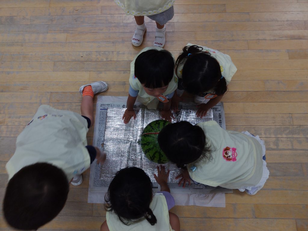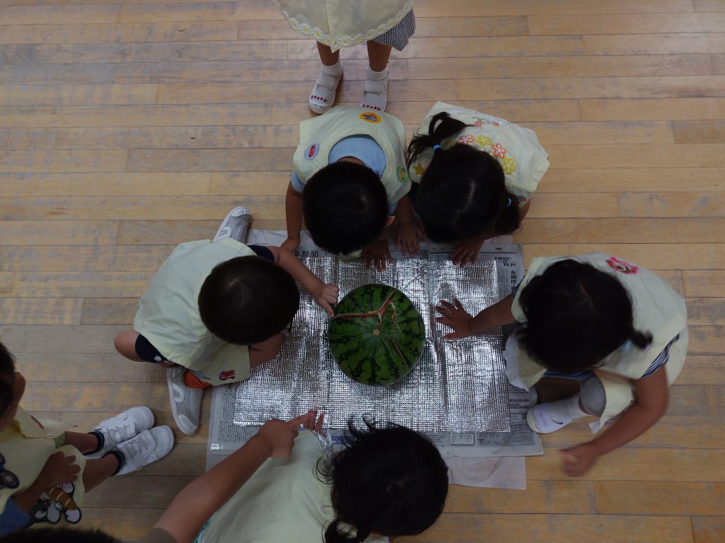 「スイカ割り」は、楽しむだけではなく、“スイカを割る”という目的のために、お友だちと協力し合い、お互いを応援し合って健闘を称え合う…といったことを体験します。みんなでルールを守ることも、大切な経験です。「見て、触って、たたいて、また見て、また触って、臭いを味わって、食べて楽しむ」…。夏の暑さを吹き飛ばす子どもたちの笑顔がいっぱいでした。