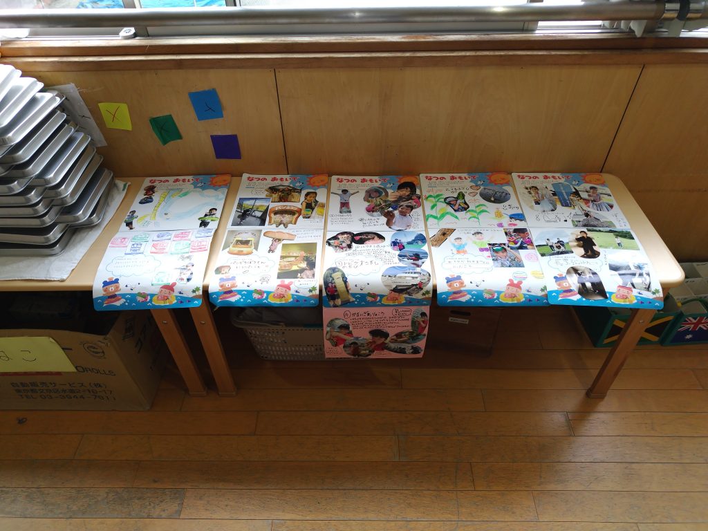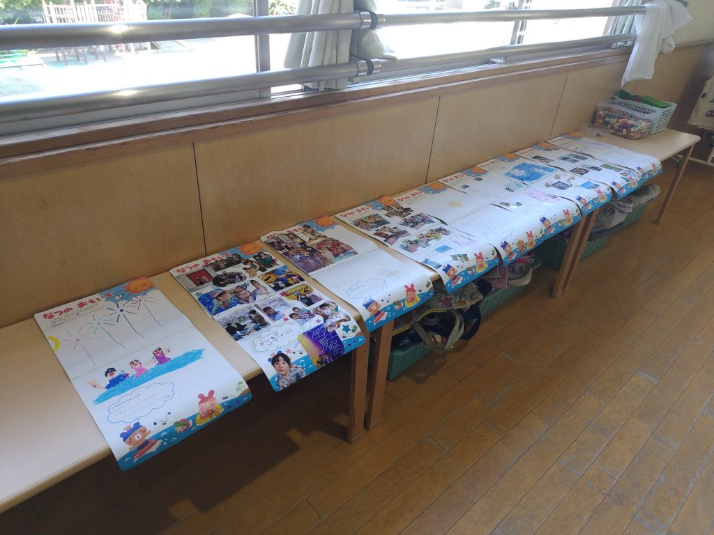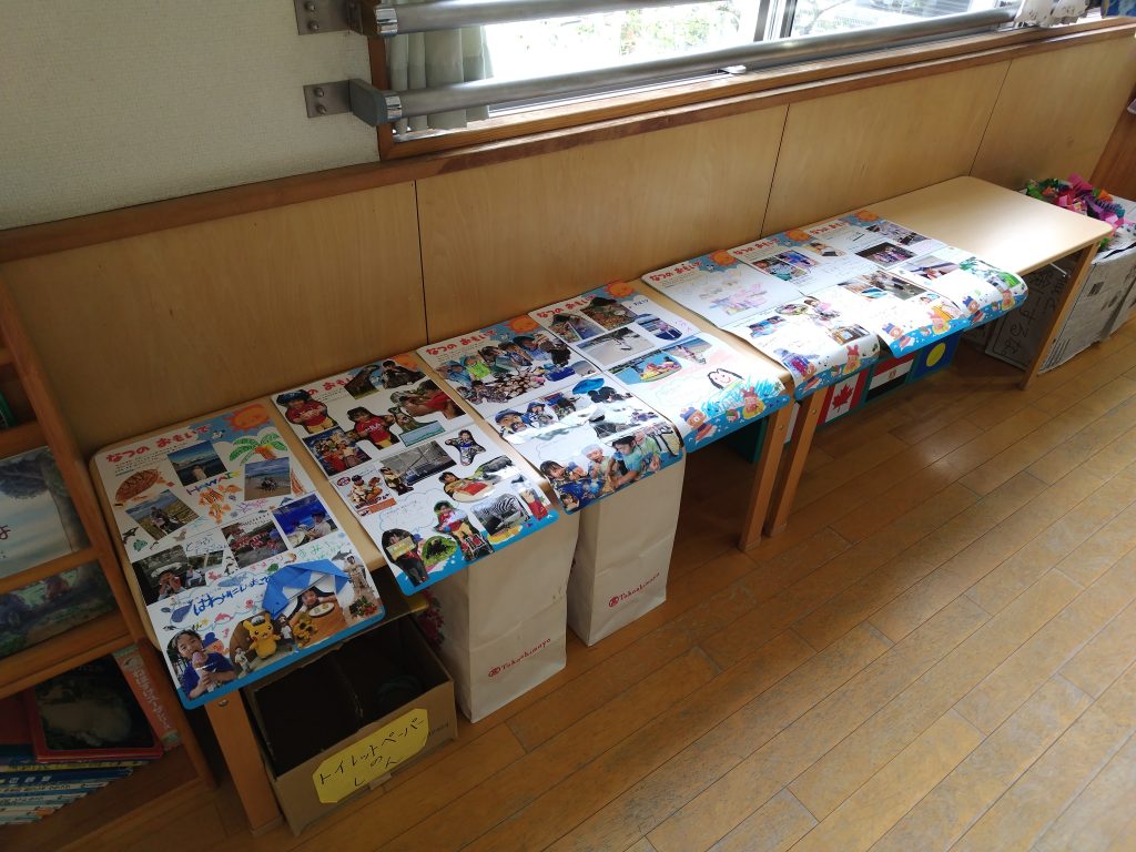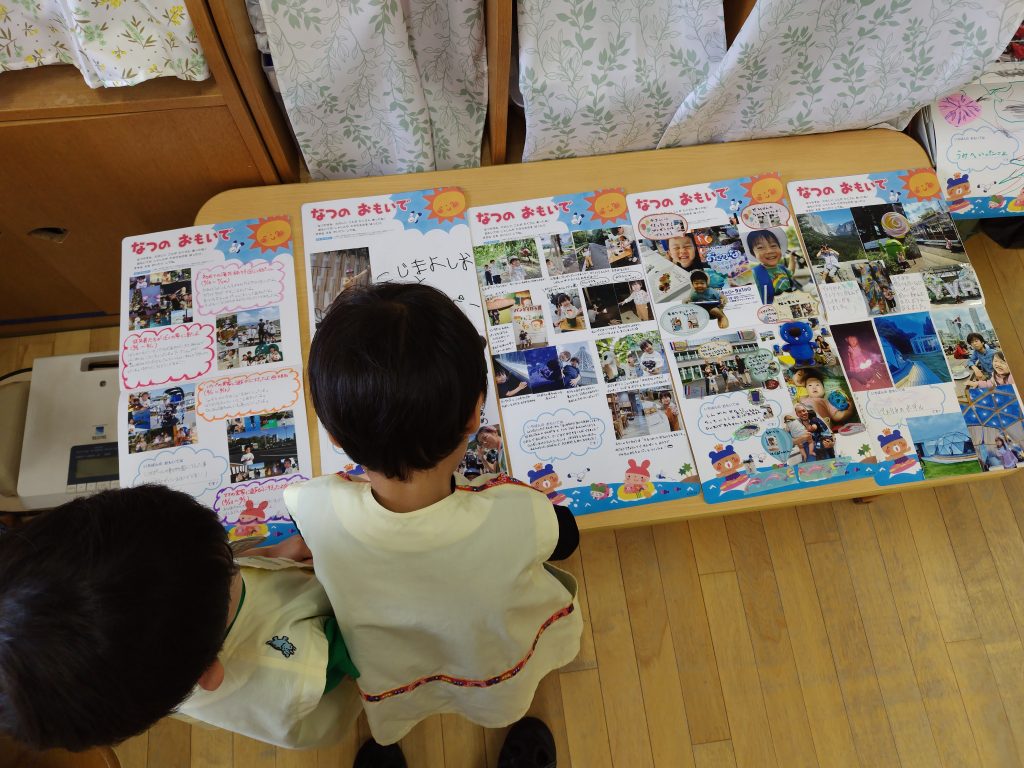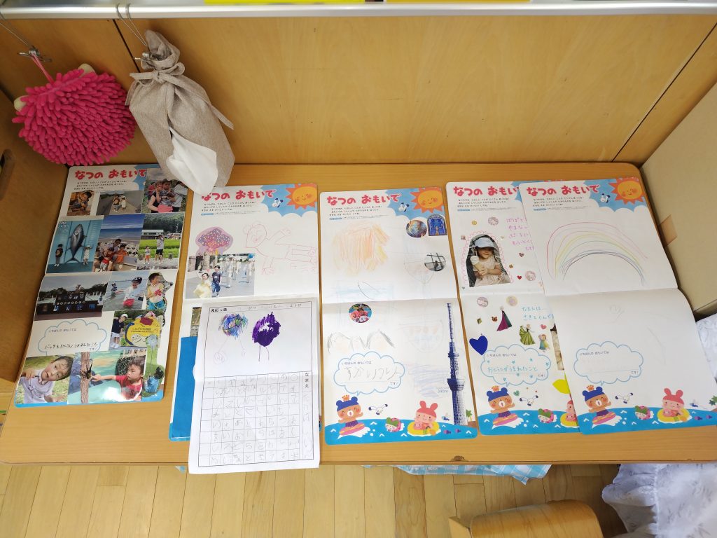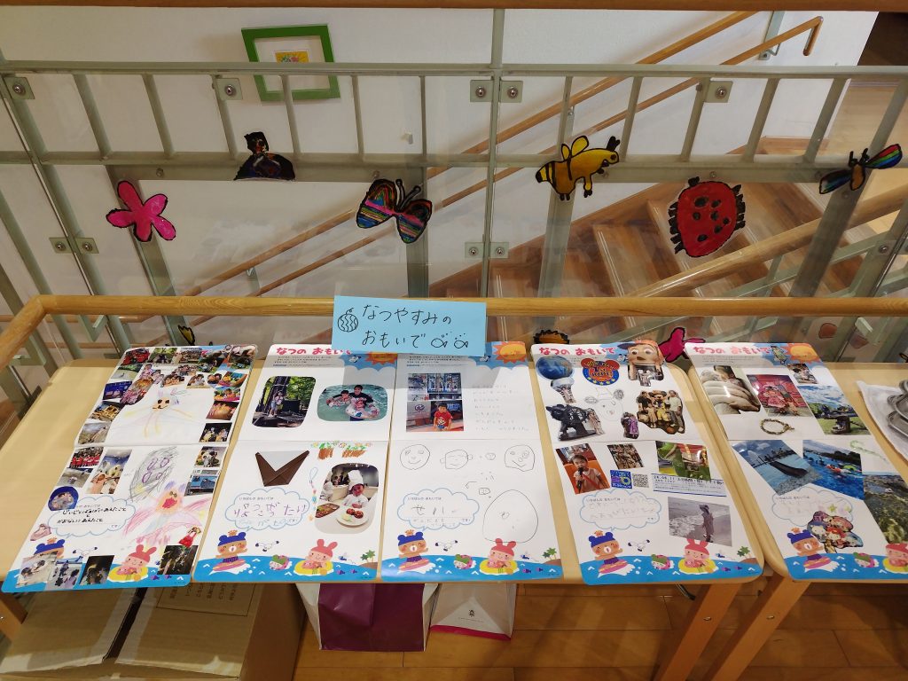 「なつのおもいで」が、クラスや廊下のテーブルに飾られています。一つ一つ見てみると、それぞれに、あそびのことや旅行のこと、キャンプや花火のこと、プールや海のこと、楽しく、嬉しく、面白く、びっくりしたことなどがつづられています。子どもたちの気持ちが絵になったり、写真になったりしています。