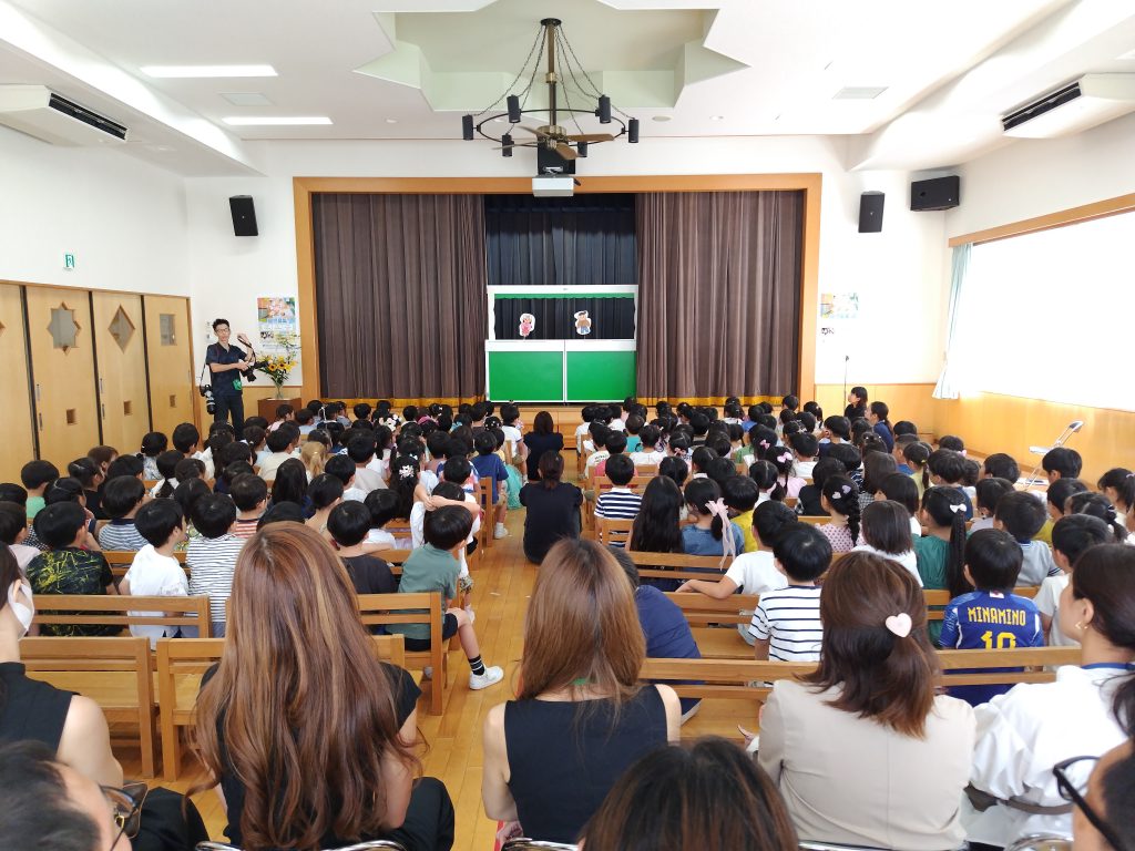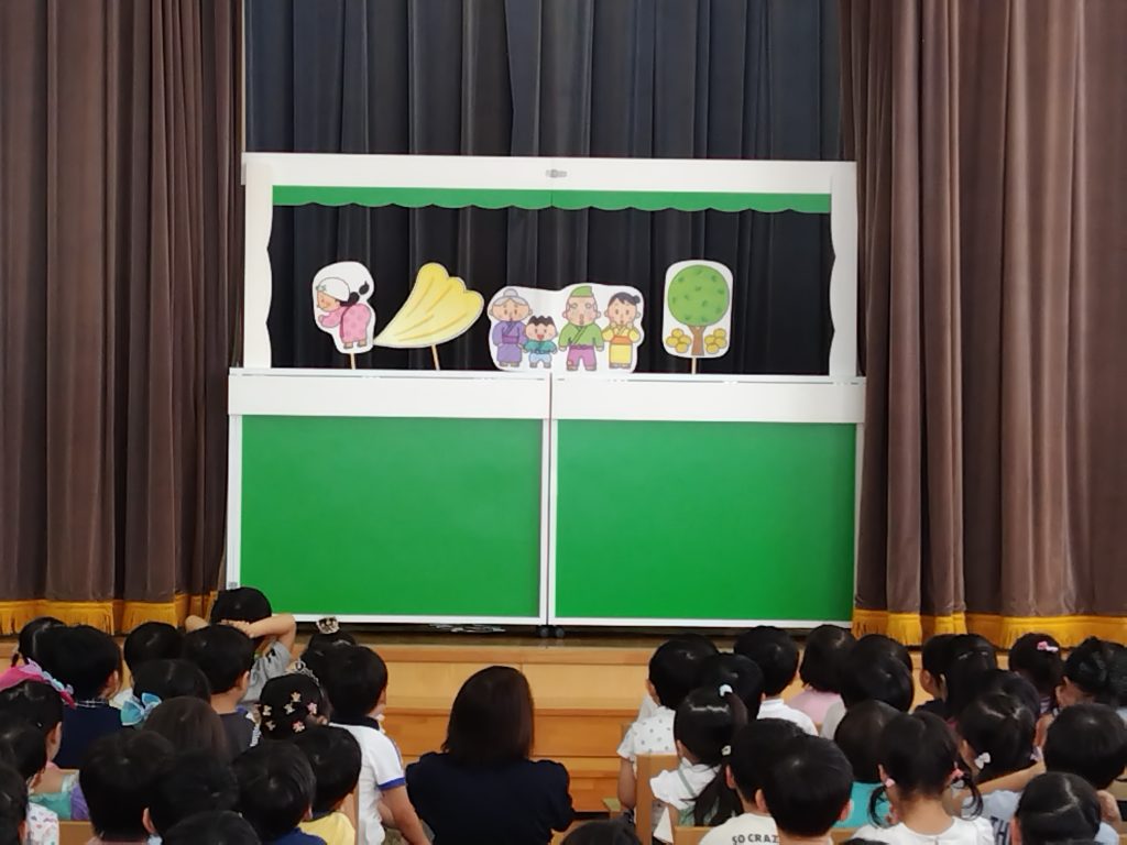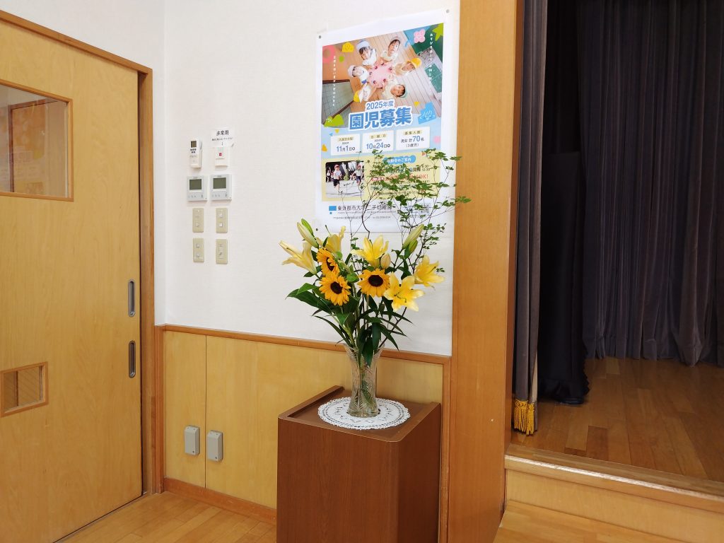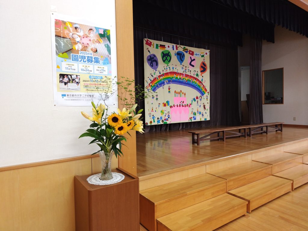 お誕生日おめでとう~8月・9月の誕生会~ 9月18日 2024 9/19 2024.09.18 2024.09.19 8月、9月生まれのお友達の誕生日をみんなでお祝いしました。会場は遊戯室。お誕生会の日には、お花が飾られます。鮮やかな黄色が魅力のひまわりと淡い黄色の百合。お祝いの時間が華やかに彩られました。「おめでとう」「ありがとう」の言葉は、今は見えない未来を豊かにする言葉です。 先生たちからのプレゼント、「おたのしみ」はペープサートでした。 おじいちゃん おばあちゃん だいすき~敬老の日の集い~ 9月14日 お月見だんご作り~中秋の名月の日に~ 9月19日