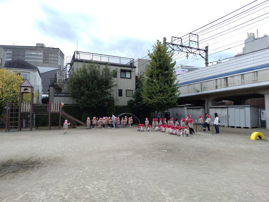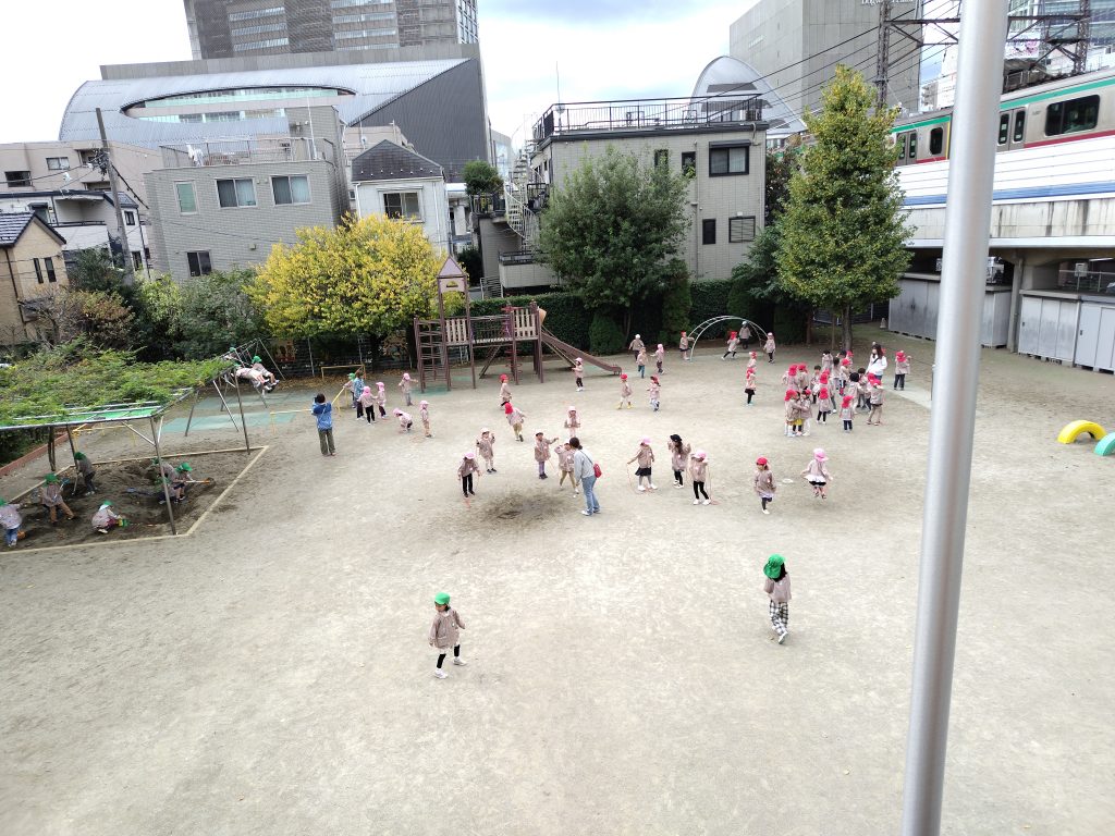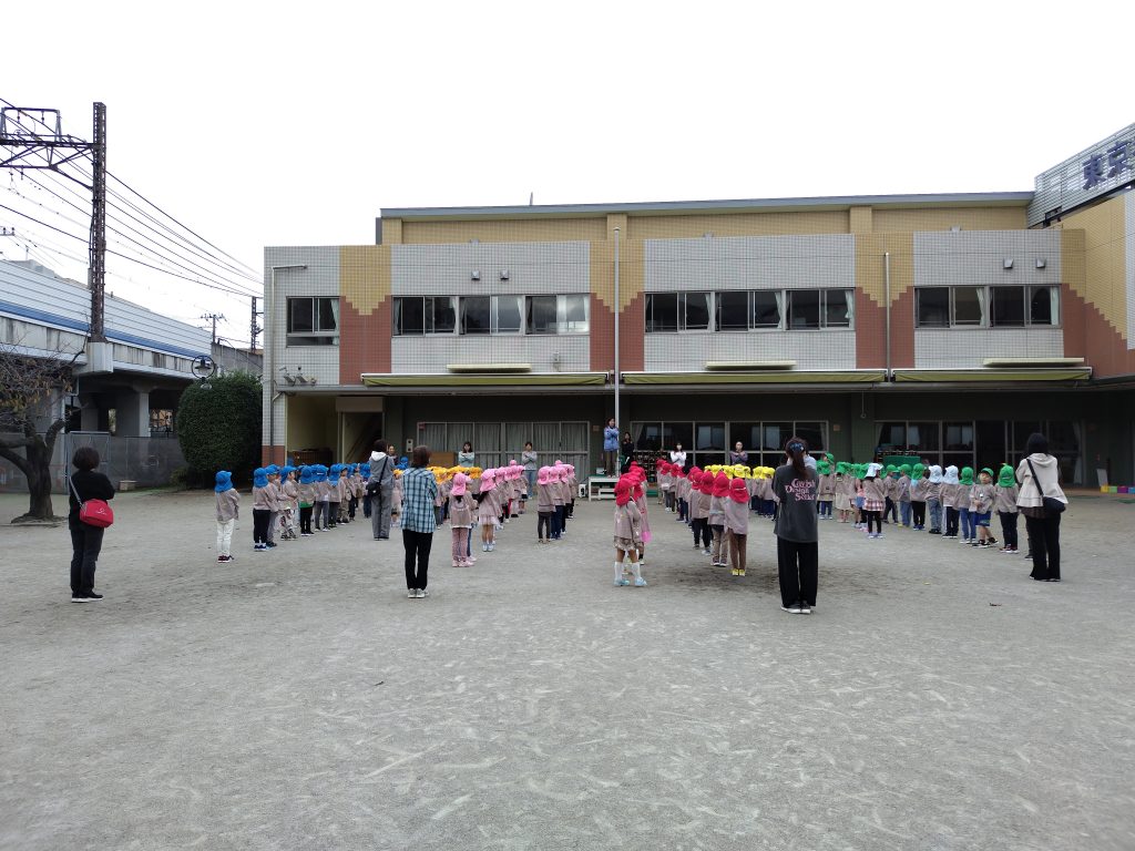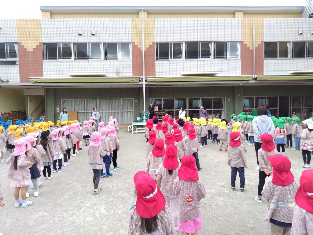 一週間が始まりました。園庭に3学年がそろい体操です。年少組の整列、まっすぐに、かっこよく並ぶことができました。運動会を経験し、歩き遠足を体験し、成長は目を見張るものがあります。年中組、年長組はお手本です。メロディは幼児向け体操音楽。園庭に笑顔と戯れはしゃぐ声が響きます。とくに、ケンケンしながら手をたたくときが大盛り上がり。手足を大きく振って、心も体も柔らかくなりました。
