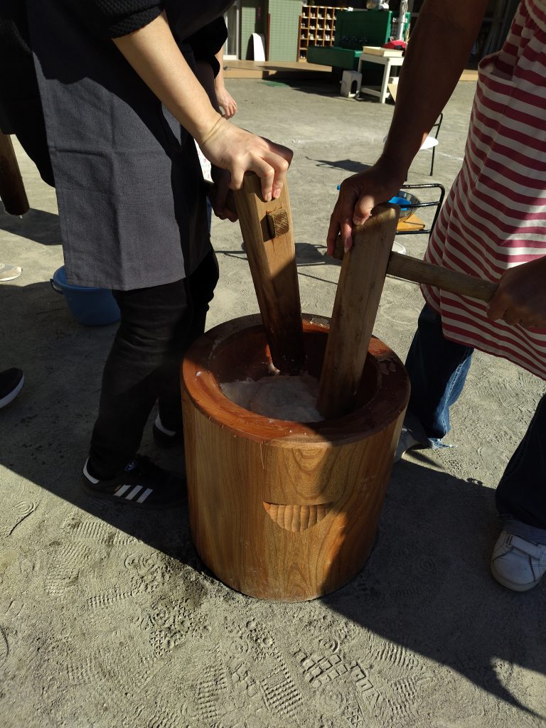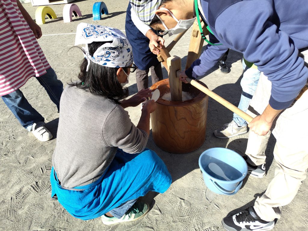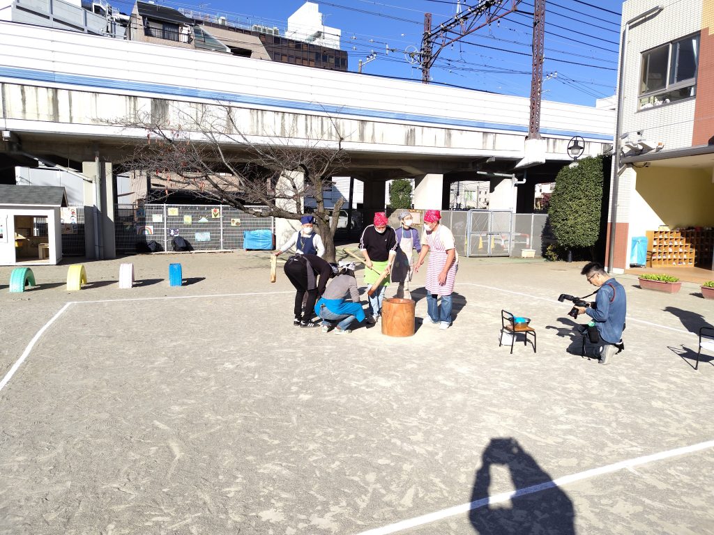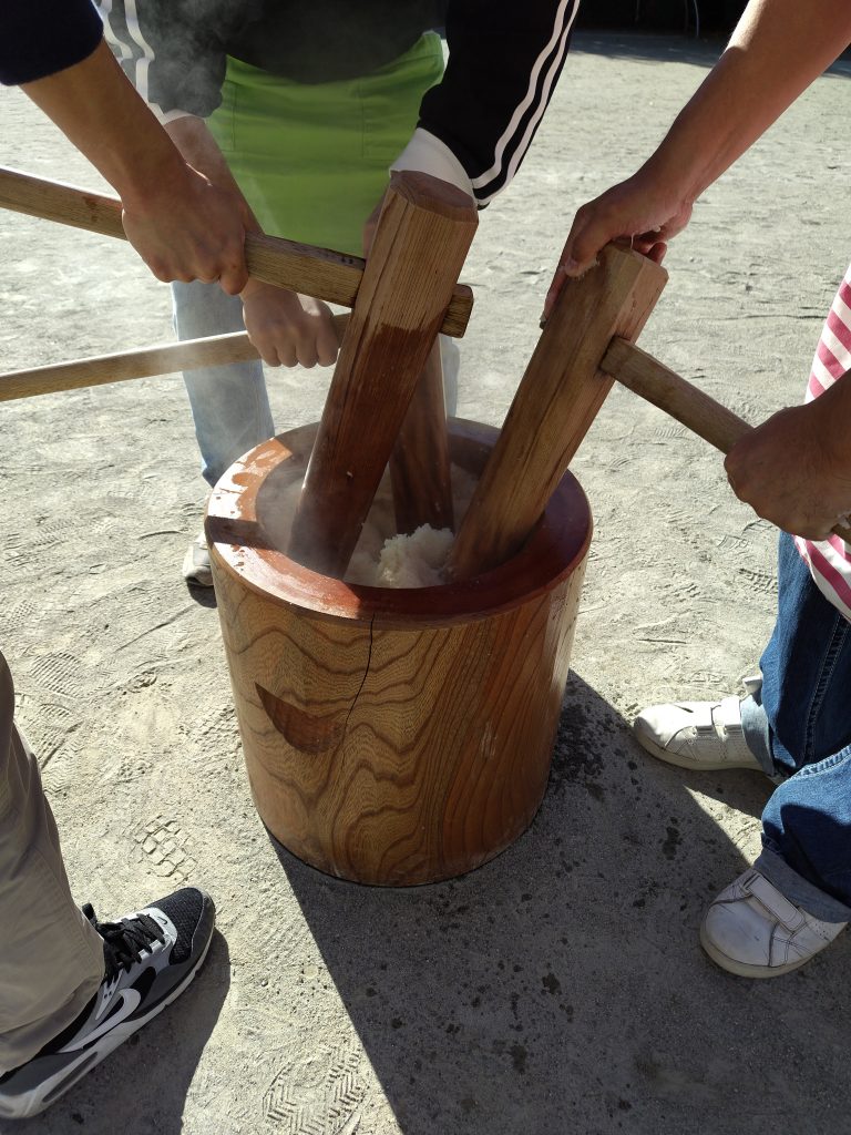 もちつきは、子どもたちにとって貴重な経験です。臼や杵、かまどや羽釜など、普段見ることのない珍しい道具に触れます。重い杵は、両手で持って使うことを体験します。もち米を蒸して、こねて、ついて、おもちが出来上がる過程を知ります。「餅をつく」という経験が難しい時代ですが、いつか、いつか、「楽しかった」と思い出す日が来ることを願います。