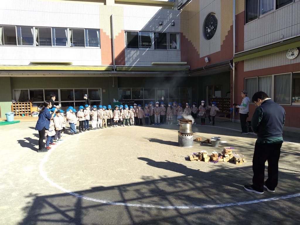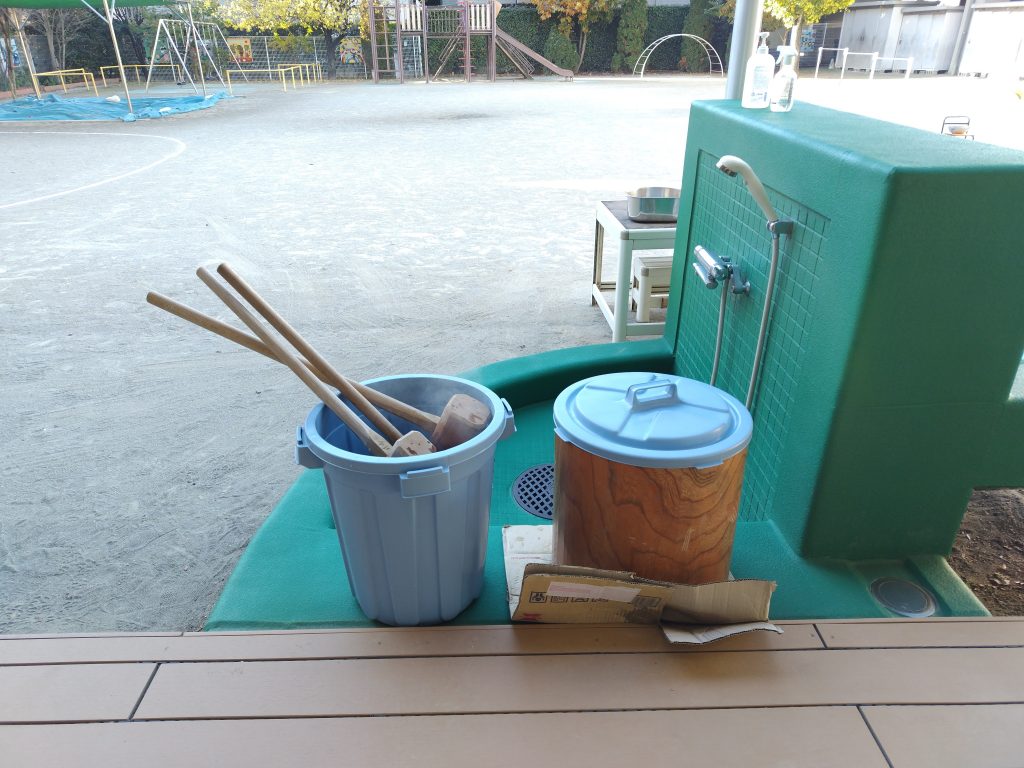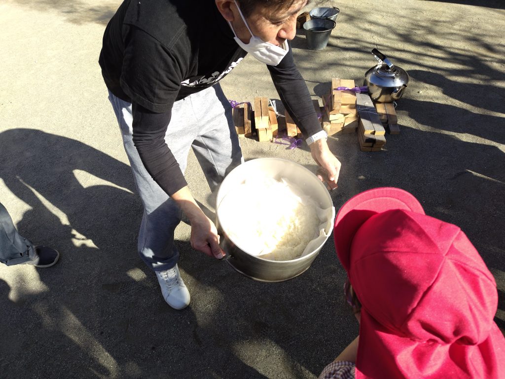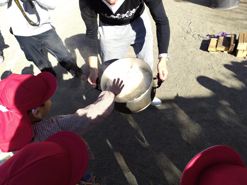 登園後、いつもと違う園庭の様子に子どもたちは興味津々。晴天に恵まれた“おもちつき”の日。かまどで薪が燃され、炎が見えます。釜のお湯が沸騰し、もち米を蒸していきます。もち米は、水に浸して一晩おきました。“火守り”が重要です。かたわらで、臼や杵がお湯で温められています。大きなやかんで、何度も何度もお湯を沸かし足します。だんだんと、もちをつく準備が整っていきます。