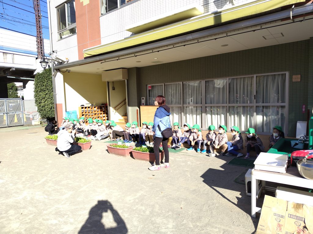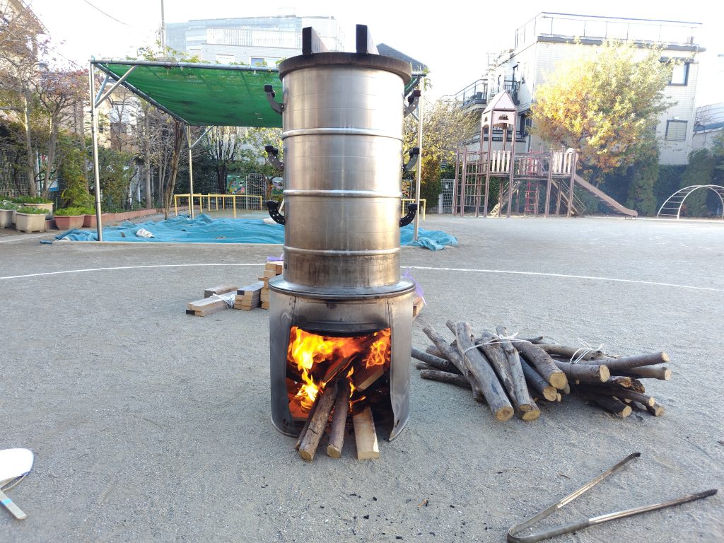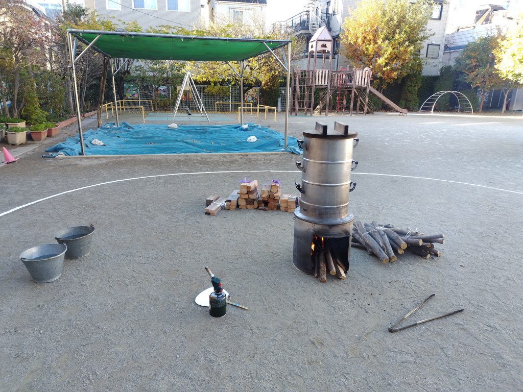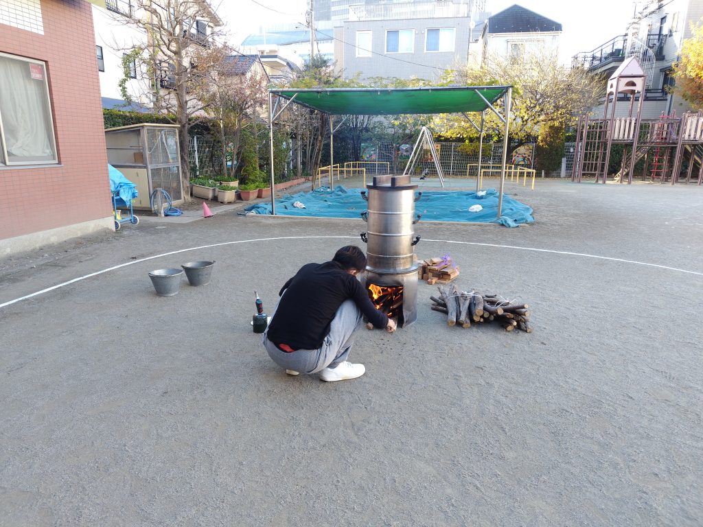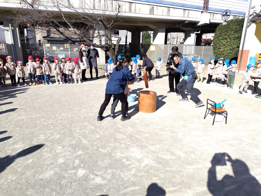 登園後、いつもと違う園庭の様子に子どもたちは興味津々。晴天に恵まれた“おもちつき”の日。かまどで薪が燃され、炎が見えます。釜のお湯が沸騰し、もち米を蒸していきます。もち米は、水に浸して一晩おきました。“火守り”が重要です。かたわらで、臼や杵がお湯で温められています。大きなやかんで、何度も何度もお湯を沸かし足します。だんだんと、もちをつく準備が整っていきます。