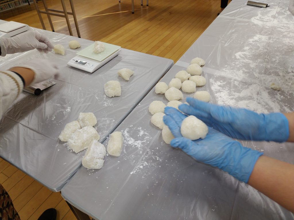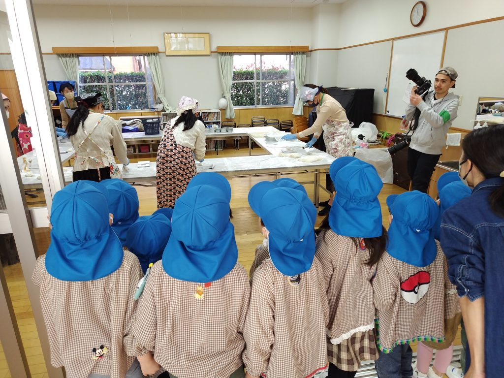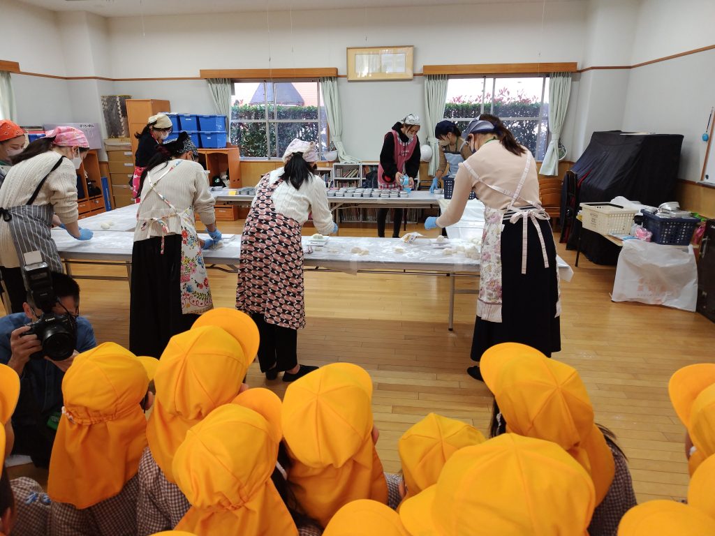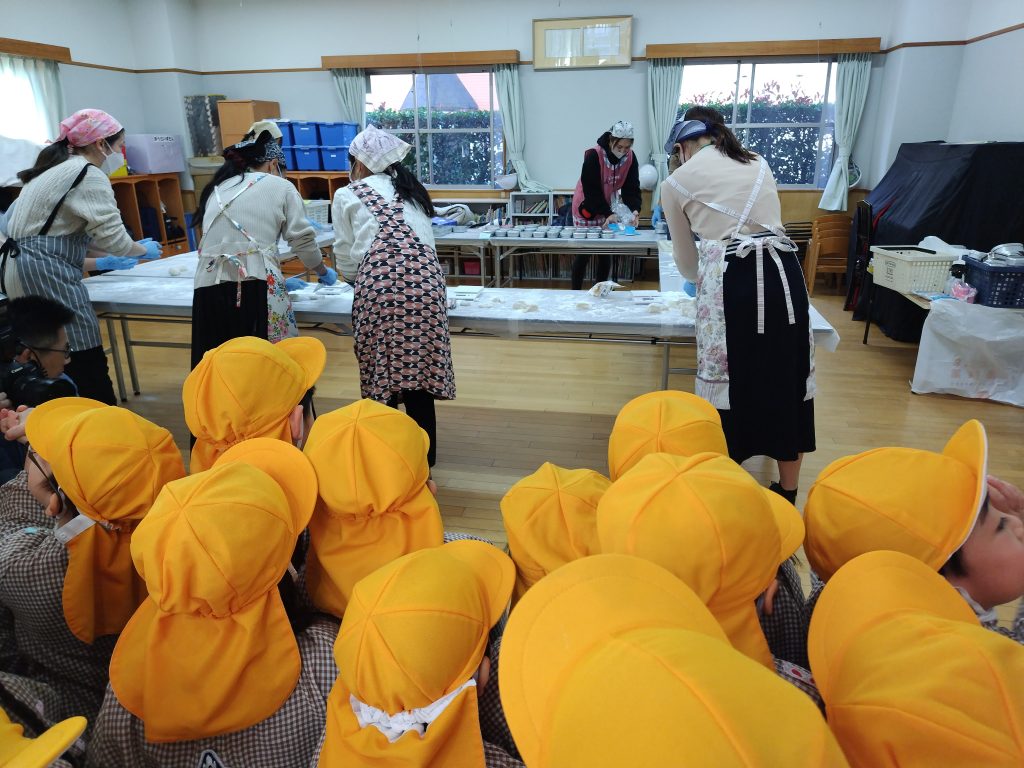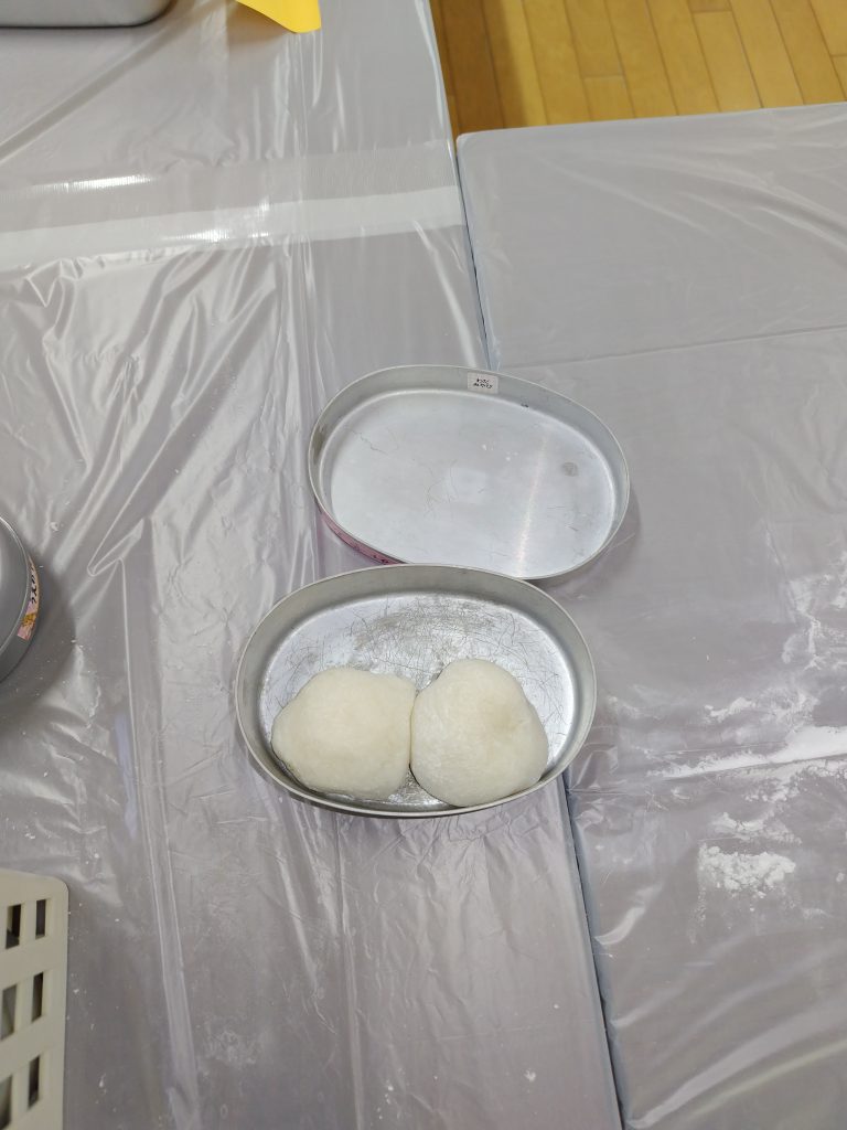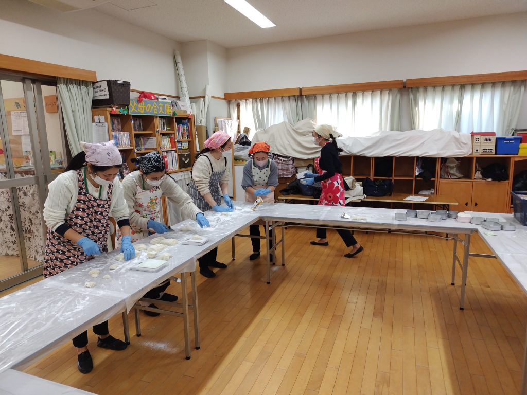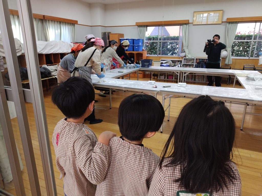 保育室では、お母様方が子どもたちのお弁当箱に分ける作業を行っています。大きな塊をだんだん小さくして、同じ大きさに丸めてお弁当箱へ。おうちでの楽しみです。