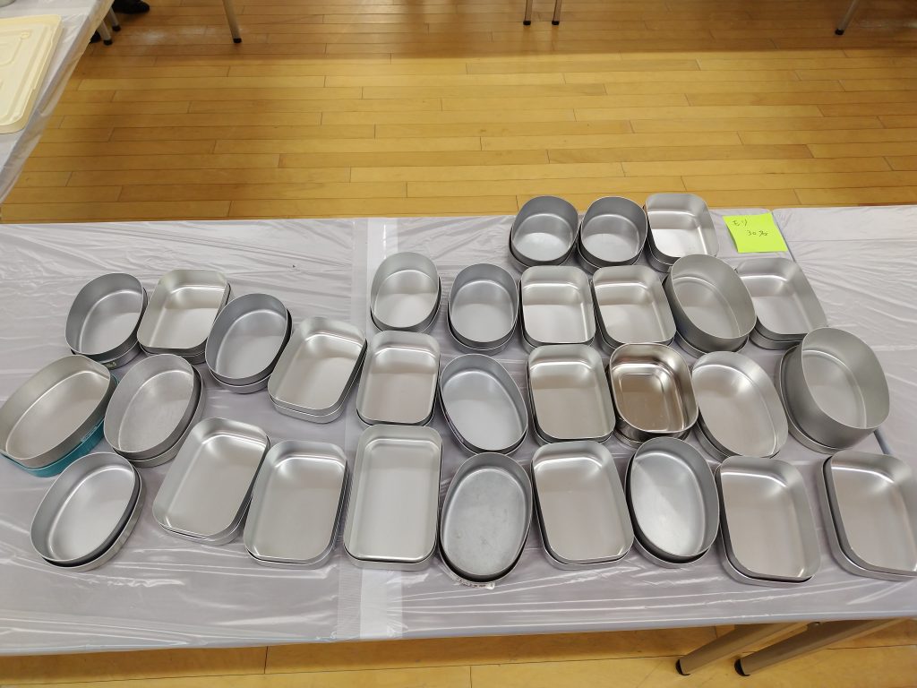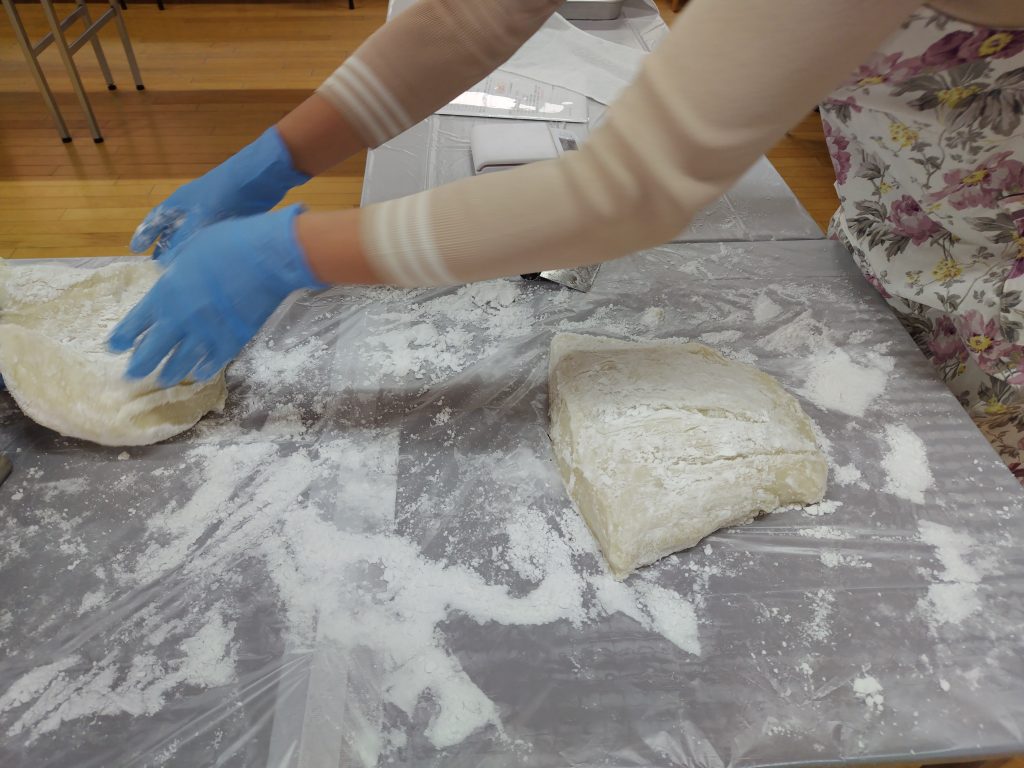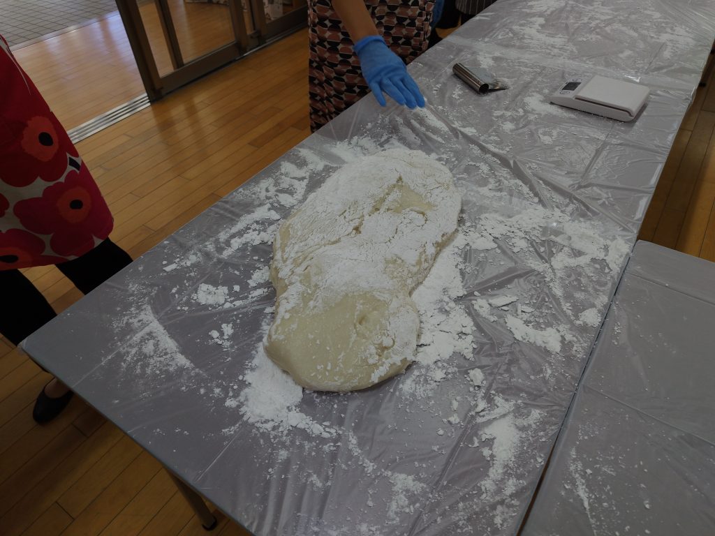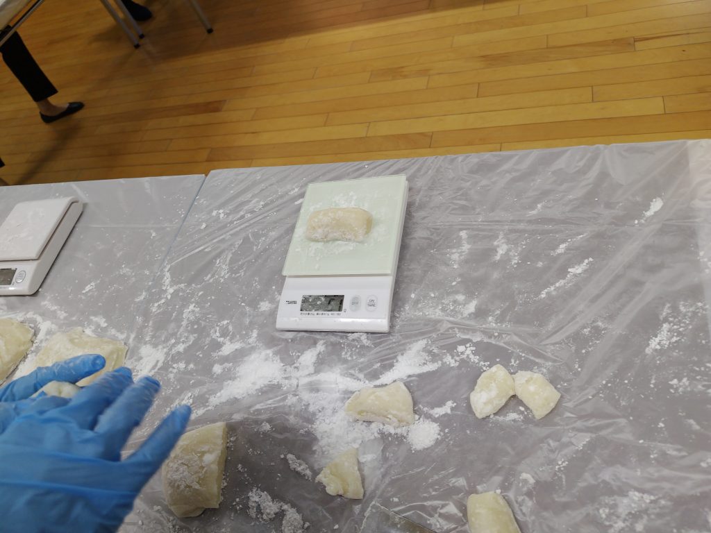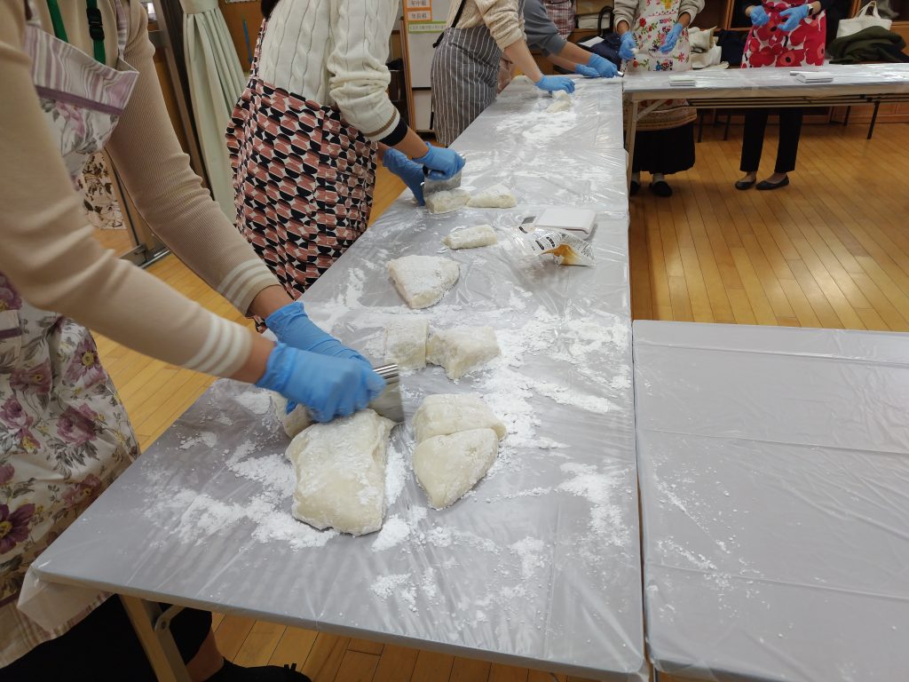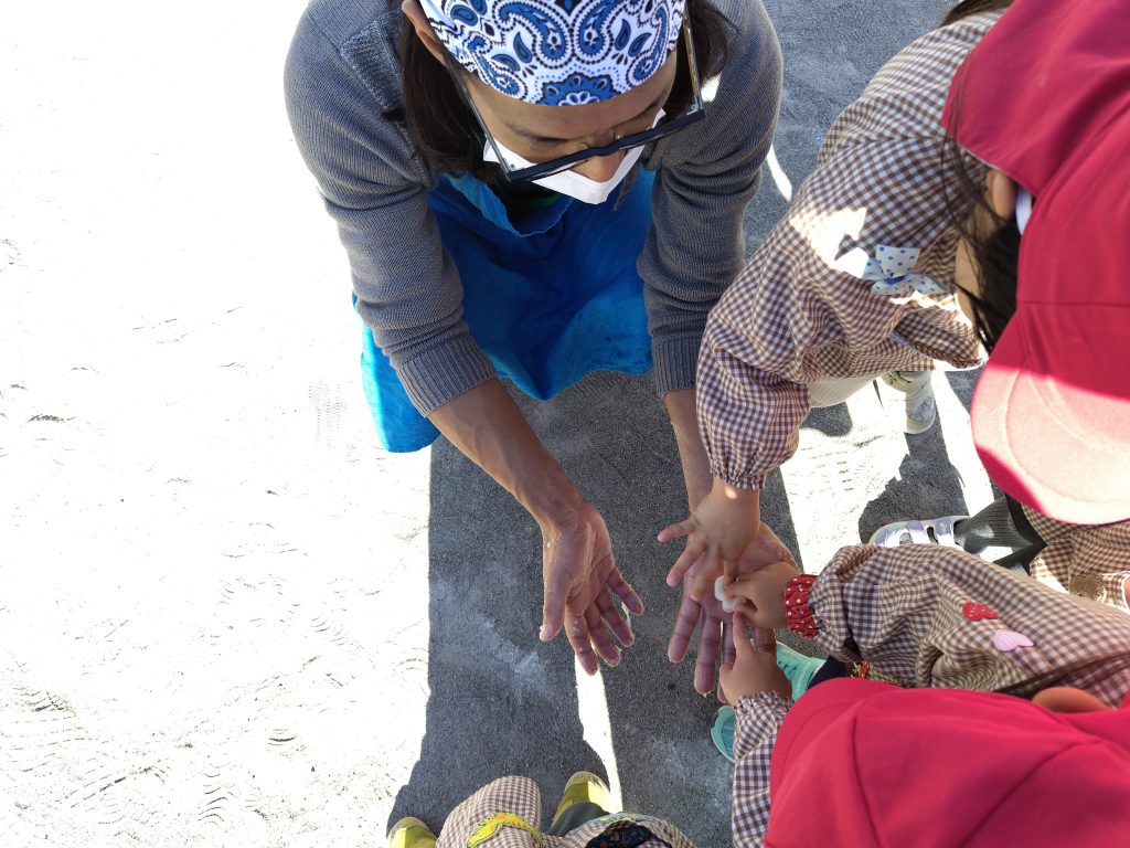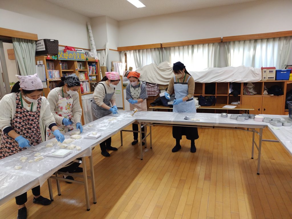 保育室では、お母様方が子どもたちのお弁当箱に分ける作業を行っています。大きな塊をだんだん小さくして、同じ大きさに丸めてお弁当箱へ。おうちでの楽しみです。