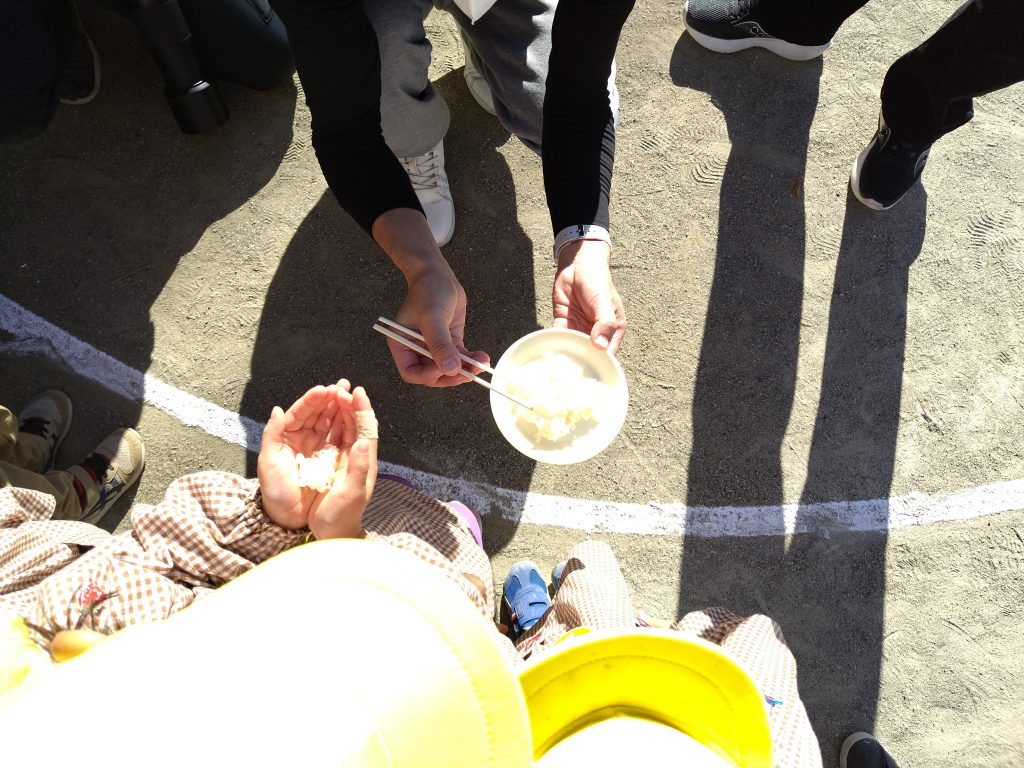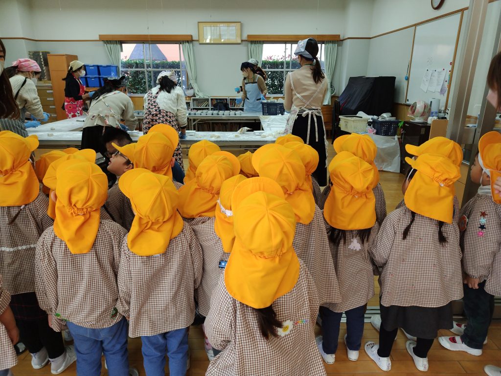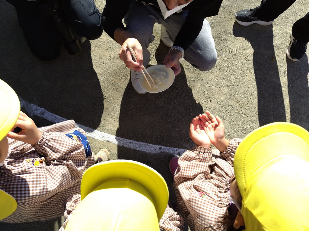 もち米が蒸される様子の観察もします。初めてもち米を見る子も…。一口サイズに手に分けてもらい、食べてみます。「おいしい」「おかわり」「もっと食べたい」「あまい」…。ここから“お餅”に変化することを知ります。
