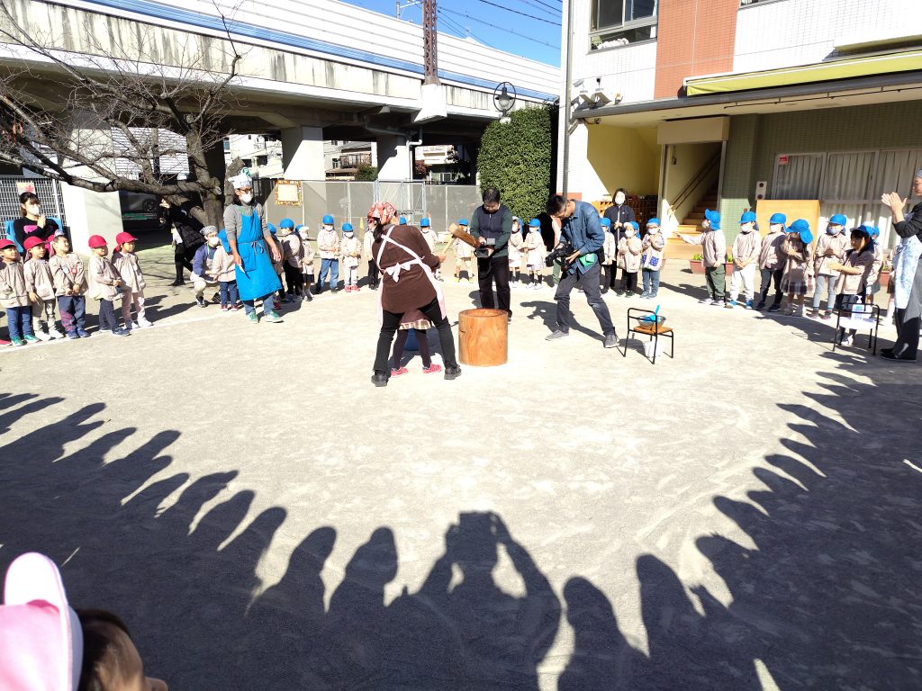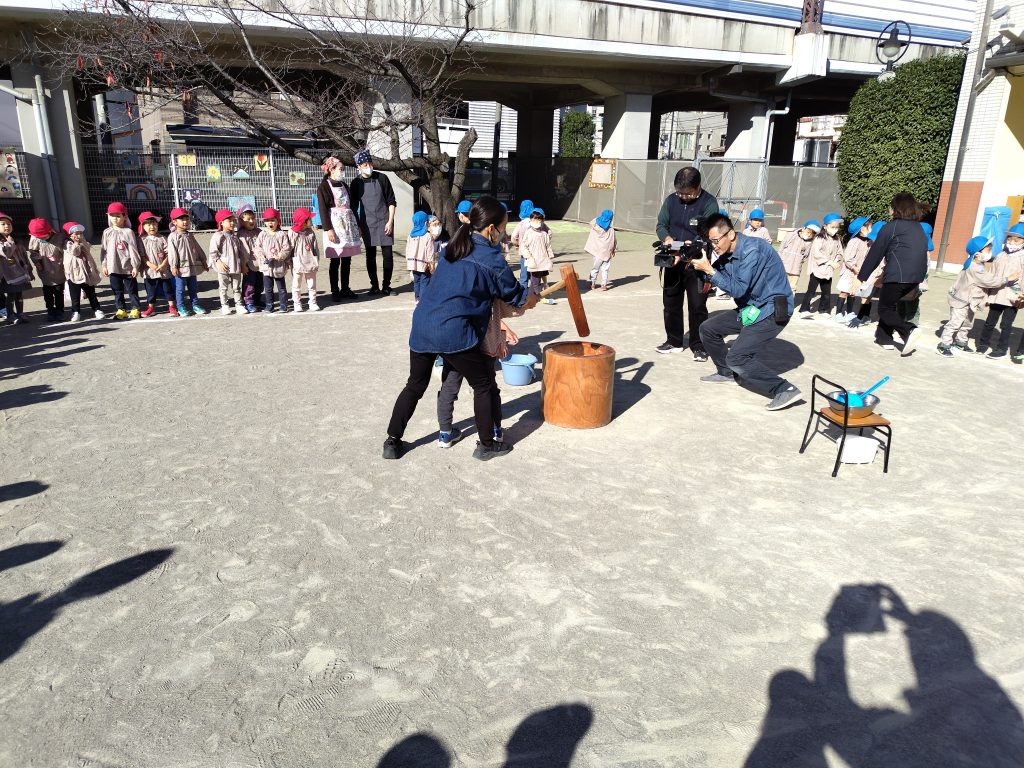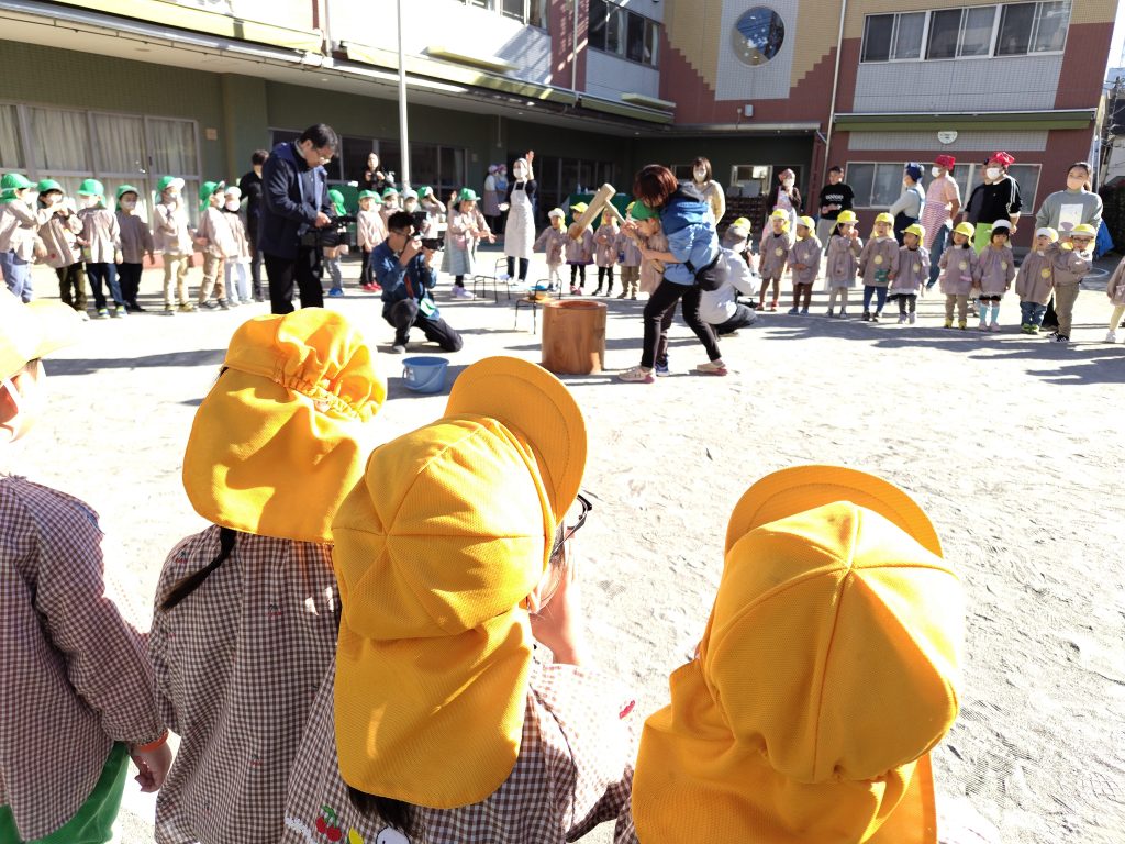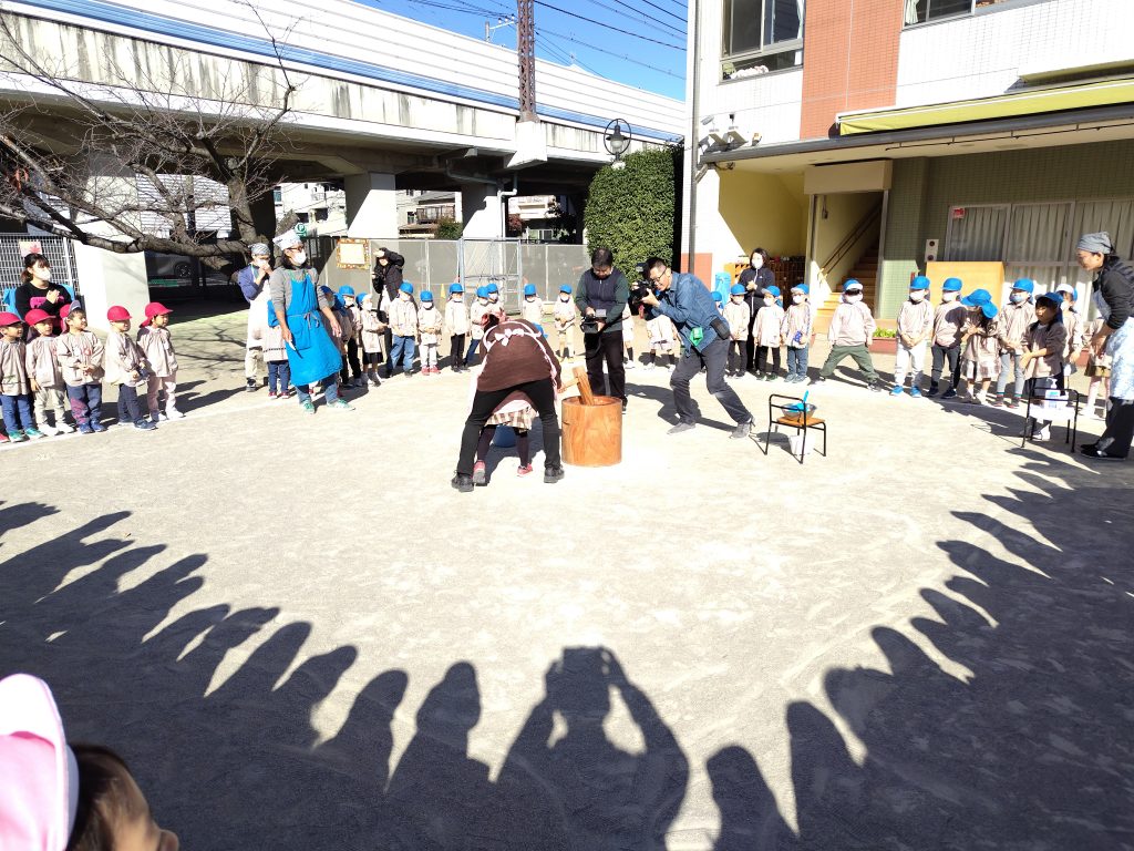 年長組がもちをつくとき、年少組、年中組から「よいしょ、よいしょ」と声が掛かります。パワーをもらって、力強くつきます。つきたてのもちをちょっとさわってみます。「やわらかい」「べとべと」「はやく食べたい」…。つきたてのおもちに触れるのは、初めてでしょうか。