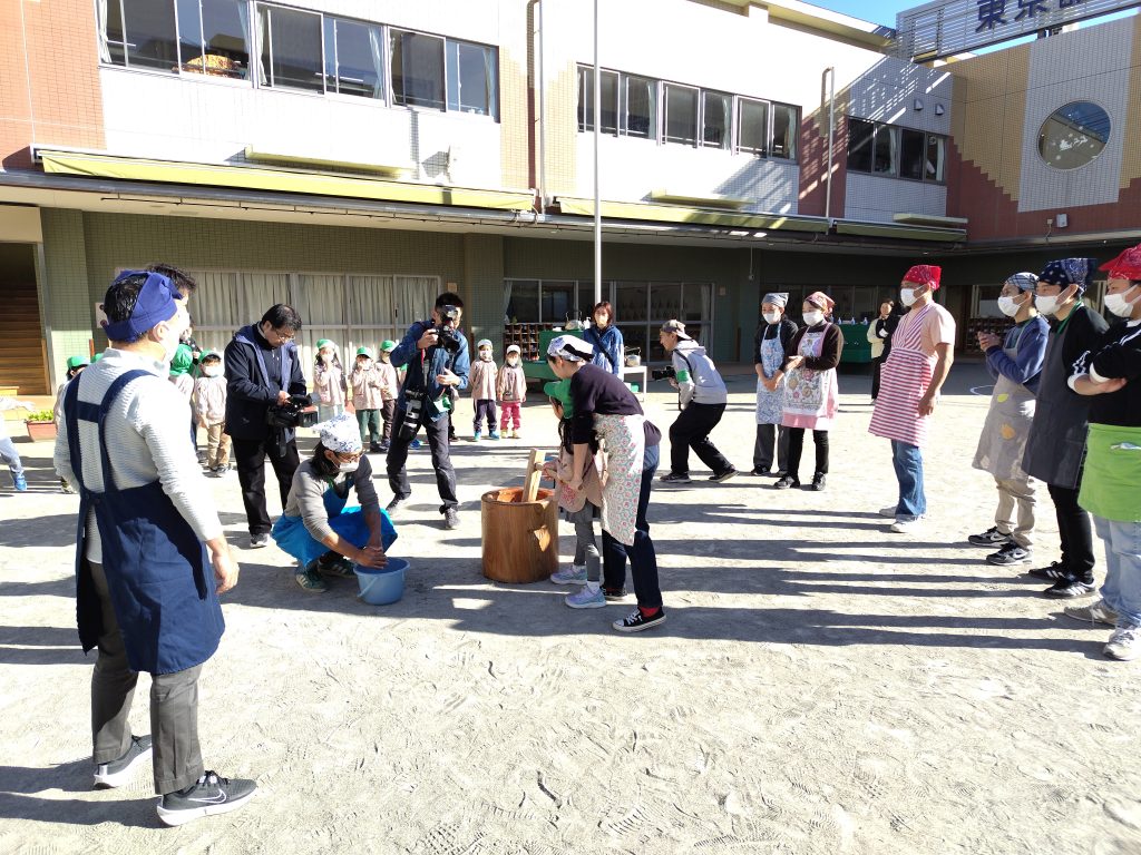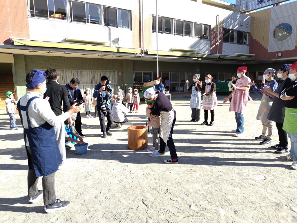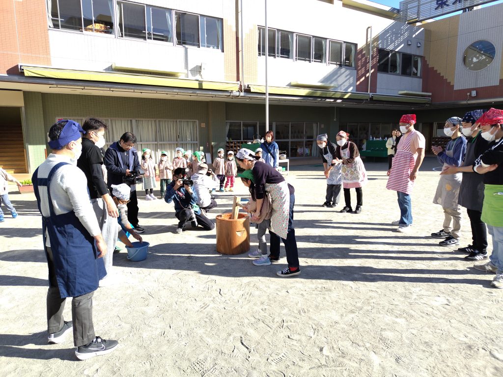 今日の“総リーダー”は、歯磨き教室や歯科検診でお世話になっている歯のお医者様。“もちつき”のことを知り尽くしたスペシャリストです。実は、前日には薪の状態や量を確認し、臼や杵に鑢をかけ、多くの時間を費やして準備していただきました。子どもたちのために、毎年、毎年、駆けつけてくれます。