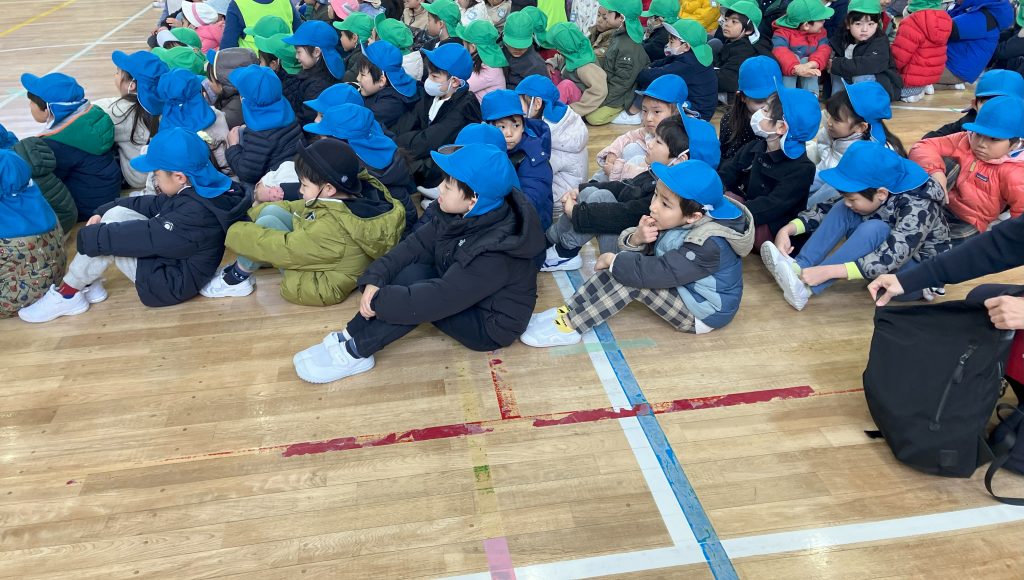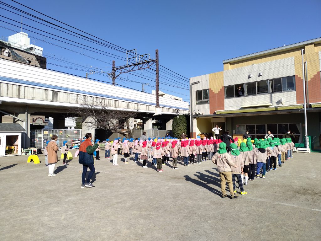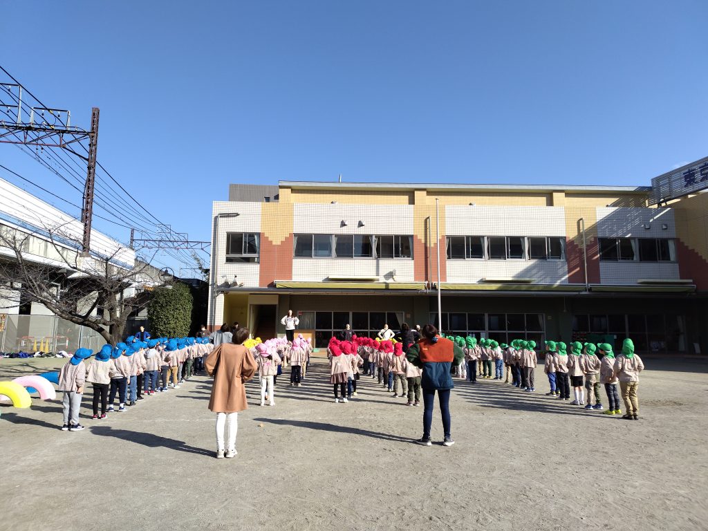 冬の朝の冷たい空気、けれども子どもたちは寒さを吹き飛ばすように元気です。青い空のもと、ナンバーワン体操(ディズニー体操No1)をして一週間が始まりました。
