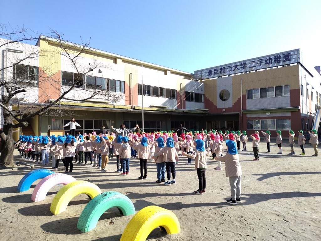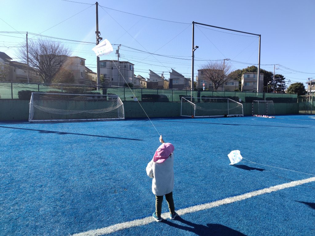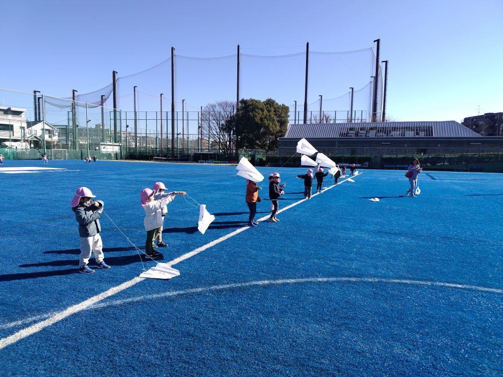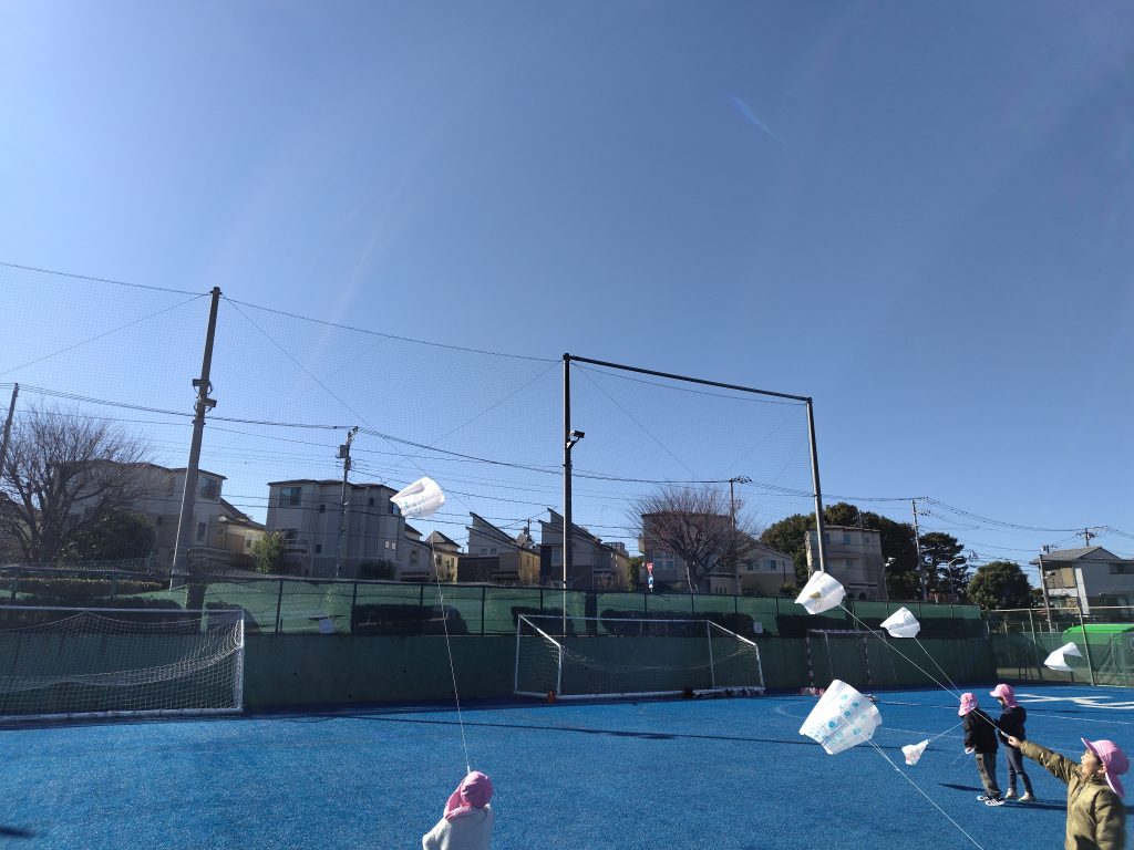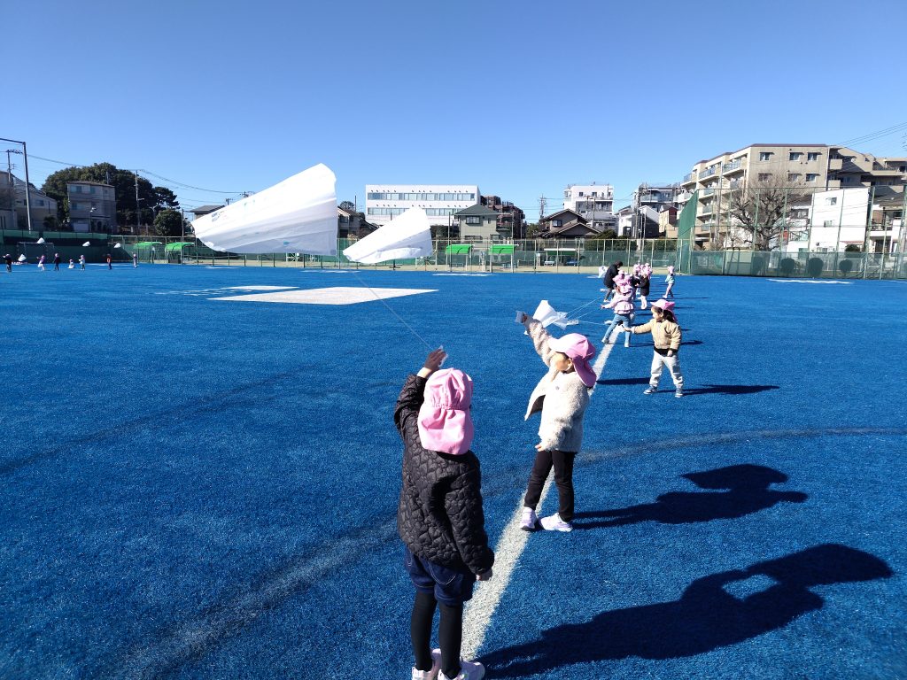 正月遊びの一つである「凧あげ」をしました。年少組と年中組は絵凧、年長組は字凧。東京都市大学総合グラウンドで年中組が凧を手に、駆け回りました。風をとらえて、たかく、たかく舞いました。