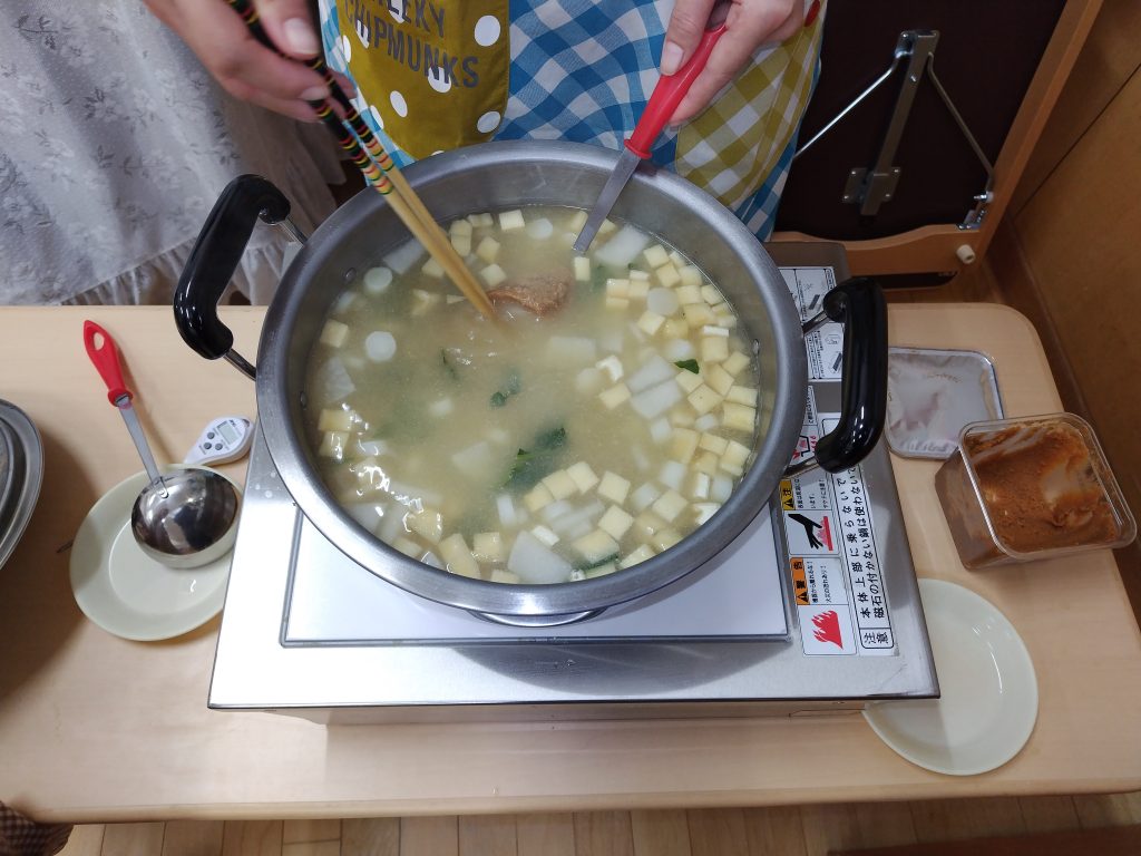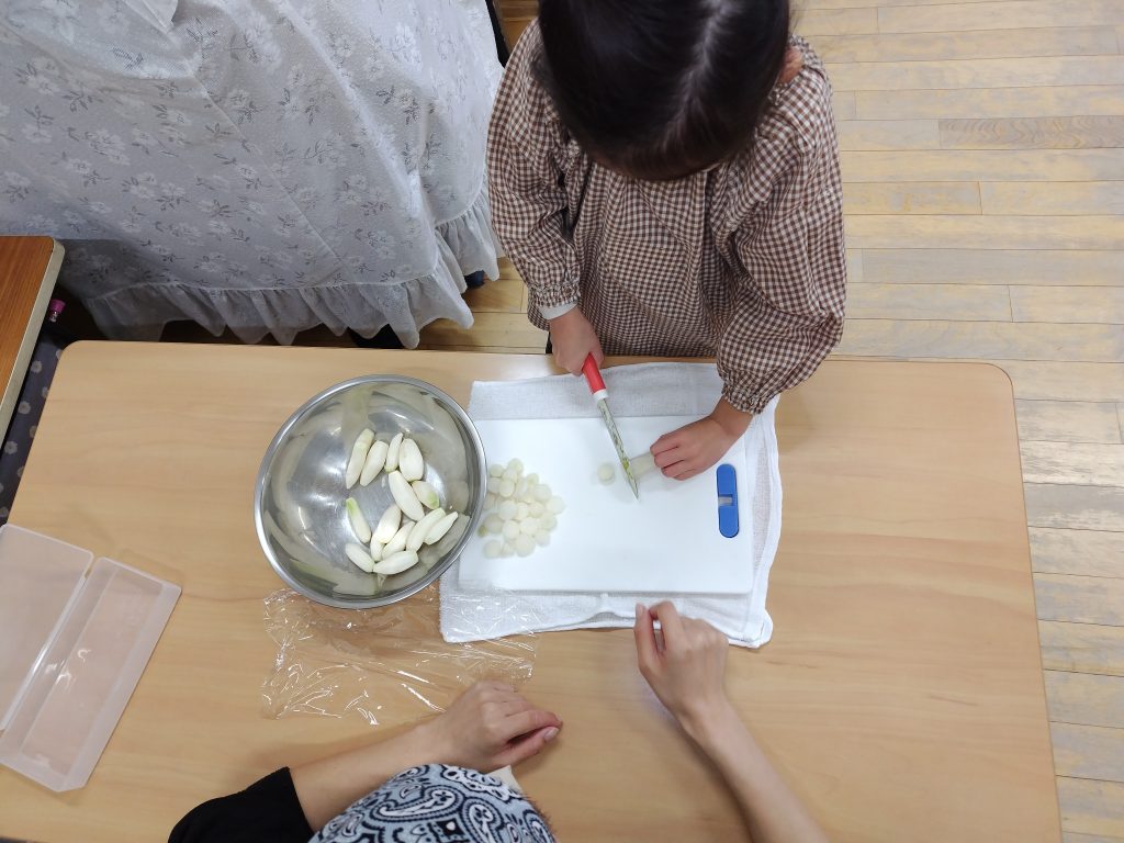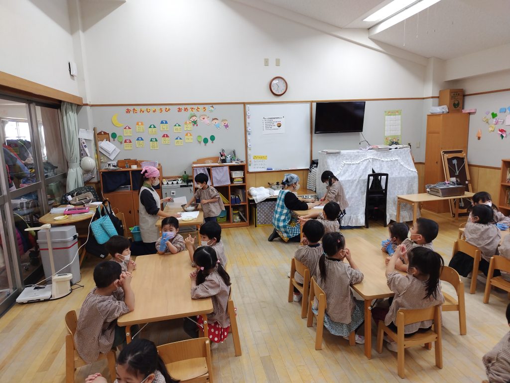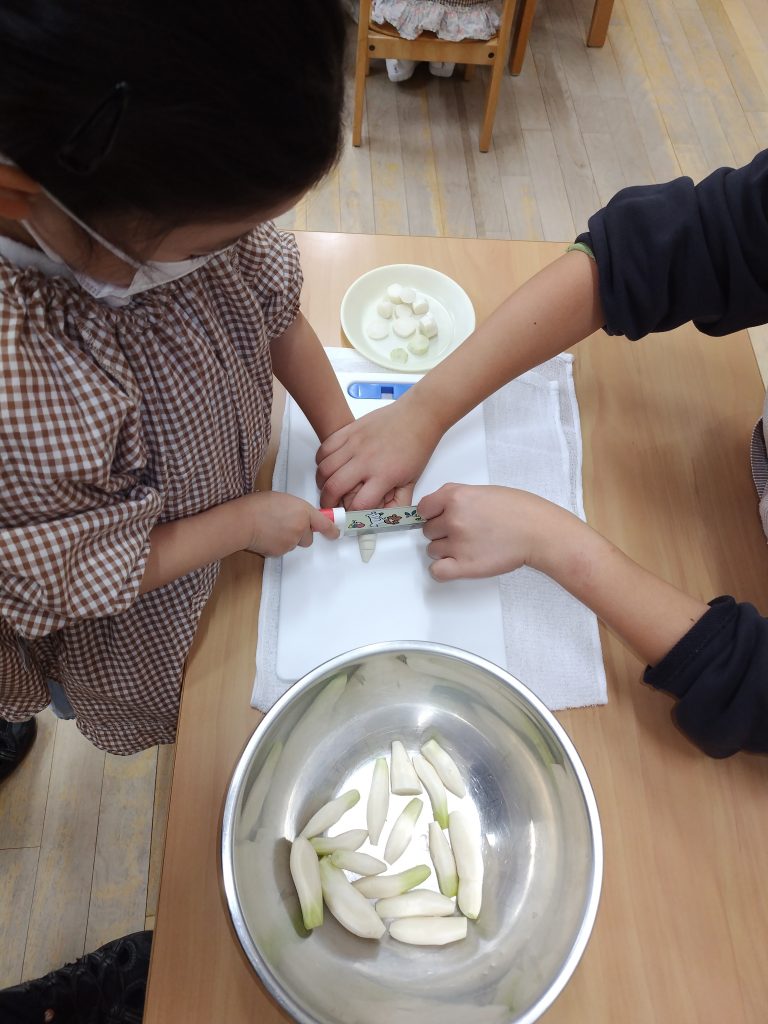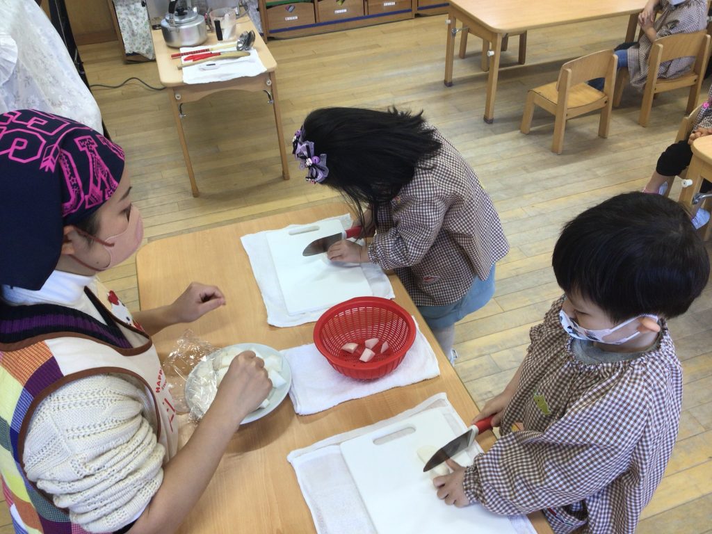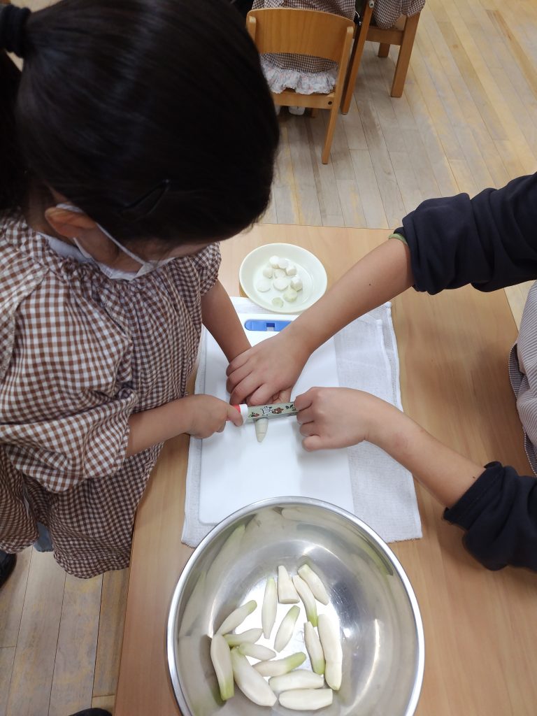 年中組の子どもたちが調理実習をしました。プランターで育てたミニ大根を使った「お味噌汁」。美味しくできました。